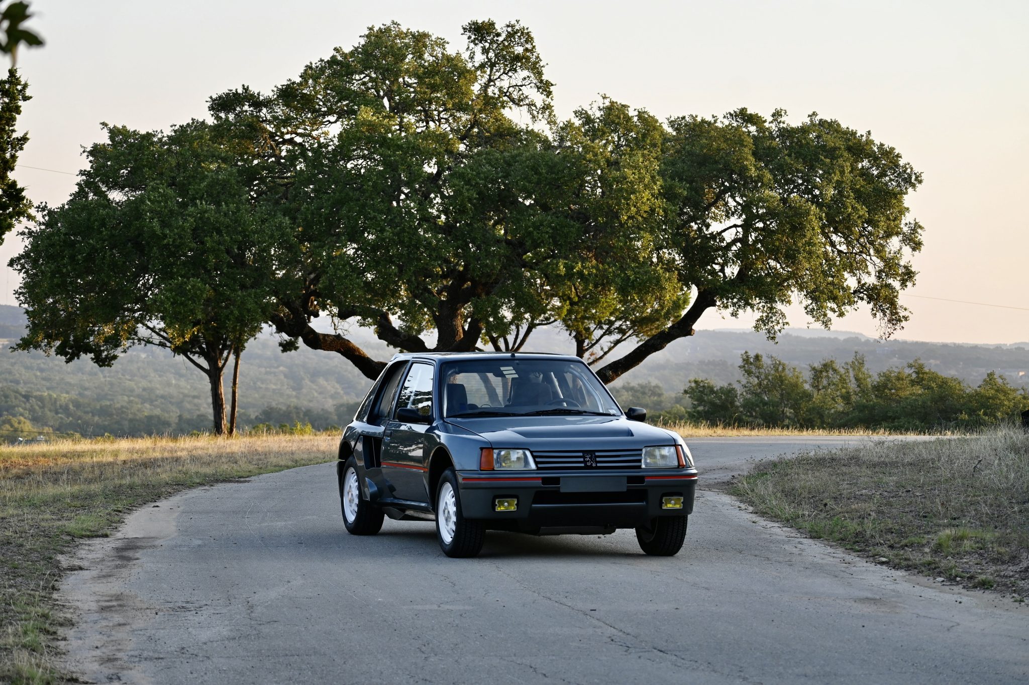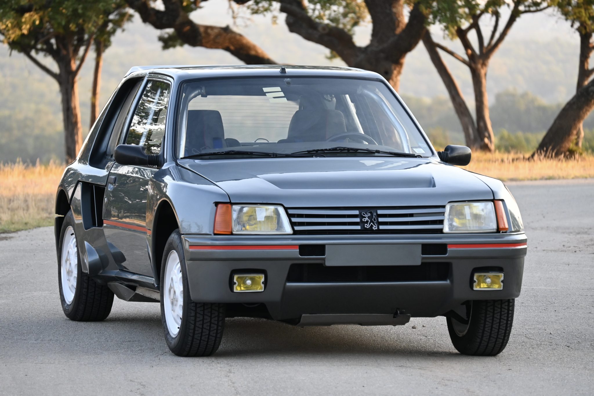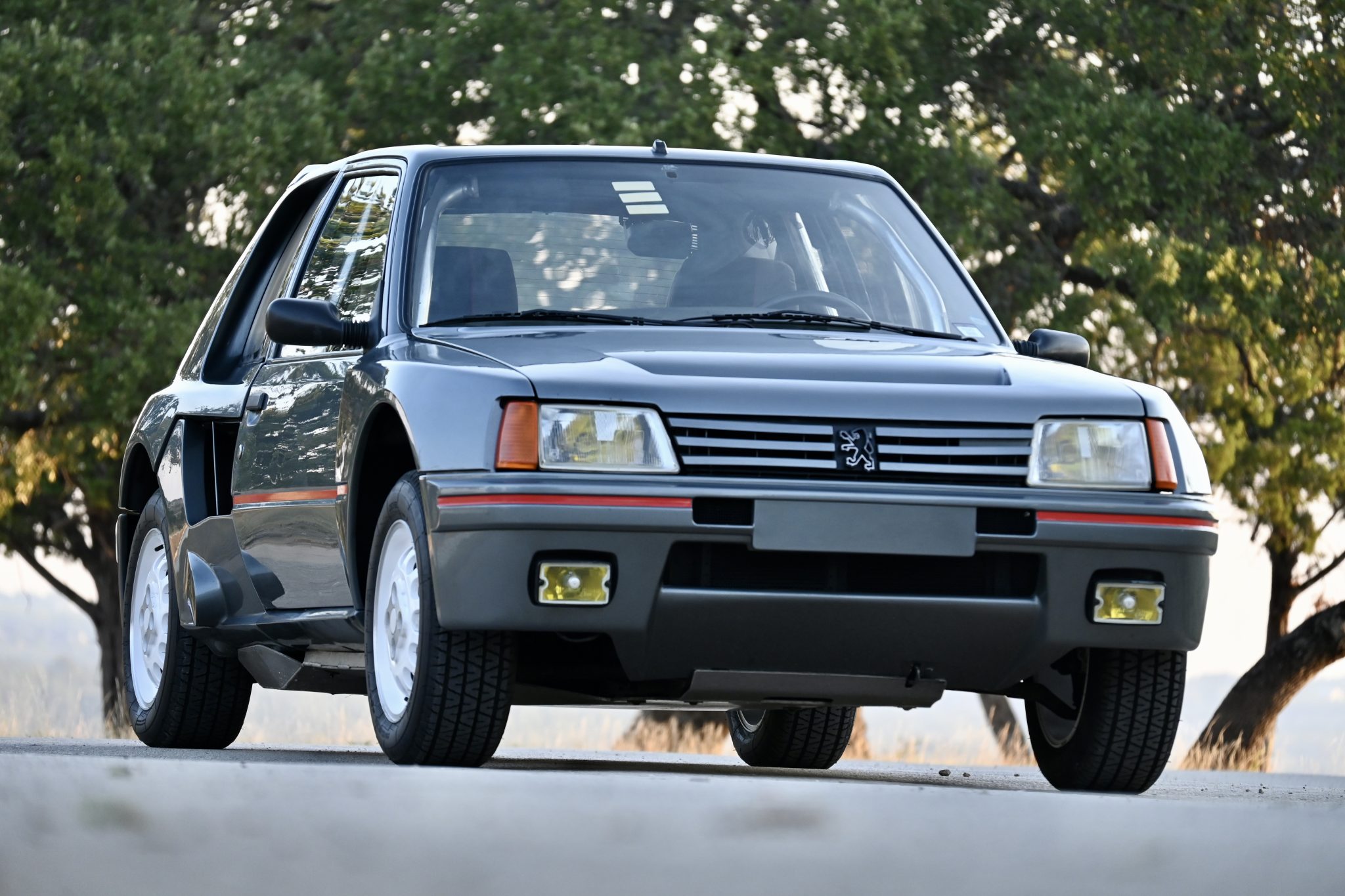 To streamline production, Peugeot elected to finish each car in Dark Charcoal with a left-hand-drive layout. French coachbuilder Heuliez built the cars using a standard 205 body, which was then modified with a vented hood, widened bodywork, an integrated roof spoiler, and quarter panel intakes. This example is said to be equipped with the optional PTS Clubman package, which stiffened the chassis via seam-welding and utilized lighter composite body panels, further reducing weight by approximately 240 pounds.