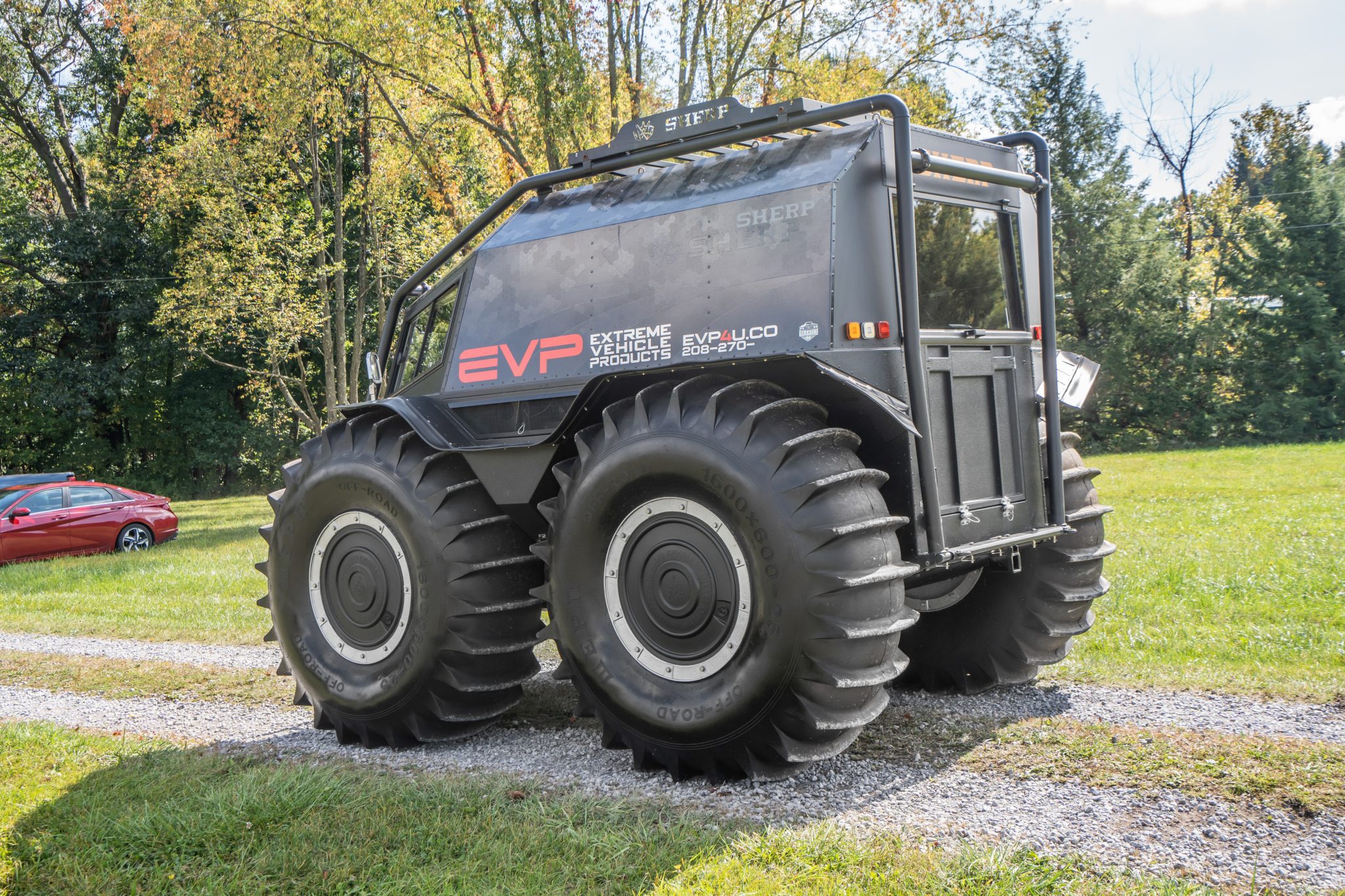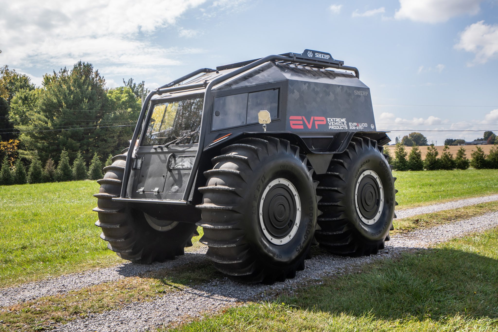 Silver-finished 25″ wheels are wrapped in 1600×600-25 WEPN low-pressure tires that feature paddle treads and provide buoyancy and propulsion on water. The setup provides two feet of ground clearance with the ability to climb or descend a 30-degree grade. The vehicle is equipped with a central tire inflation system as well as auxiliary fuel containers located in the center of each wheel.