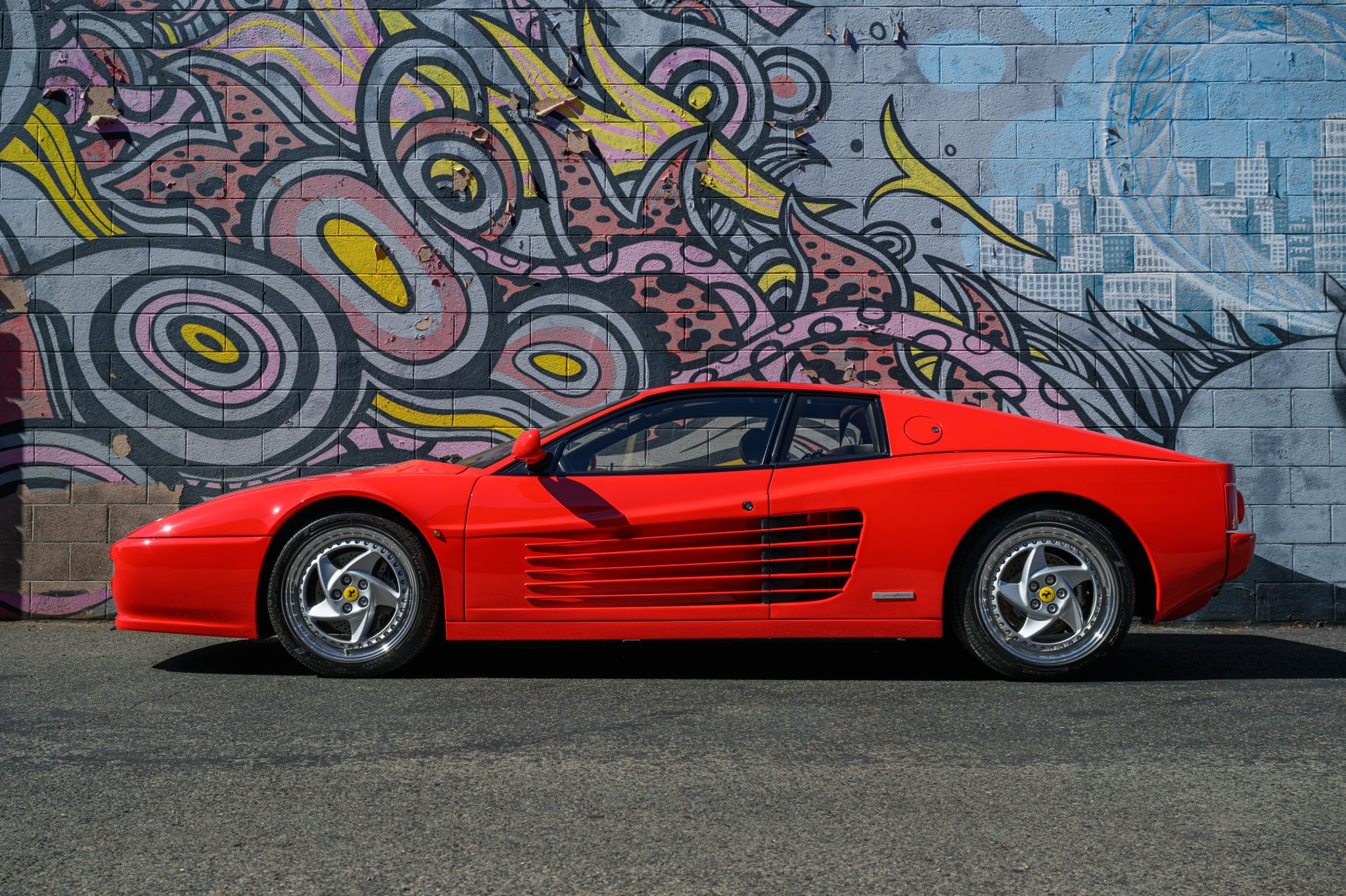 Multi-piece Speedline 18″ alloy wheels are said to have been refinished in 2023, and they are mounted with 235/40 front and 295/35 rear Pirelli P Zero Rosso tires. Stopping power is provided by black Ferrari-branded calipers over cross-drilled and ventilated discs at each corner. Replacement pads and rotors were installed in March 2023.