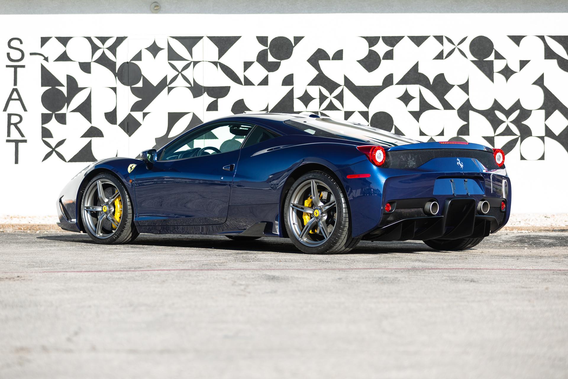 This example is finished in Blu Tour de France with North American Racing Team (NART) racing stripes and features adaptive xenon headlights, fog lights, Scuderia Ferrari fender shields, and optional carbon-fiber front flaps and side nolders. A collection of paint meter readings are presented in the gallery below.