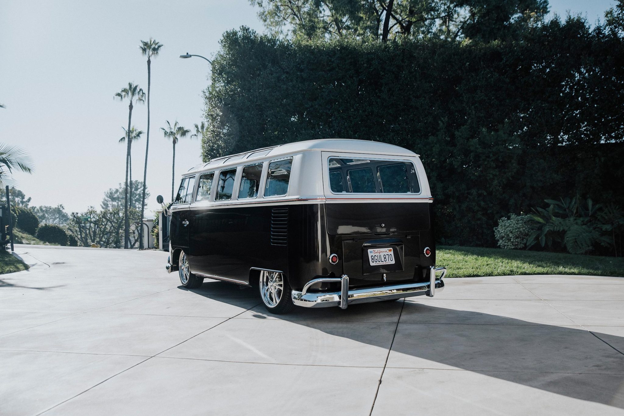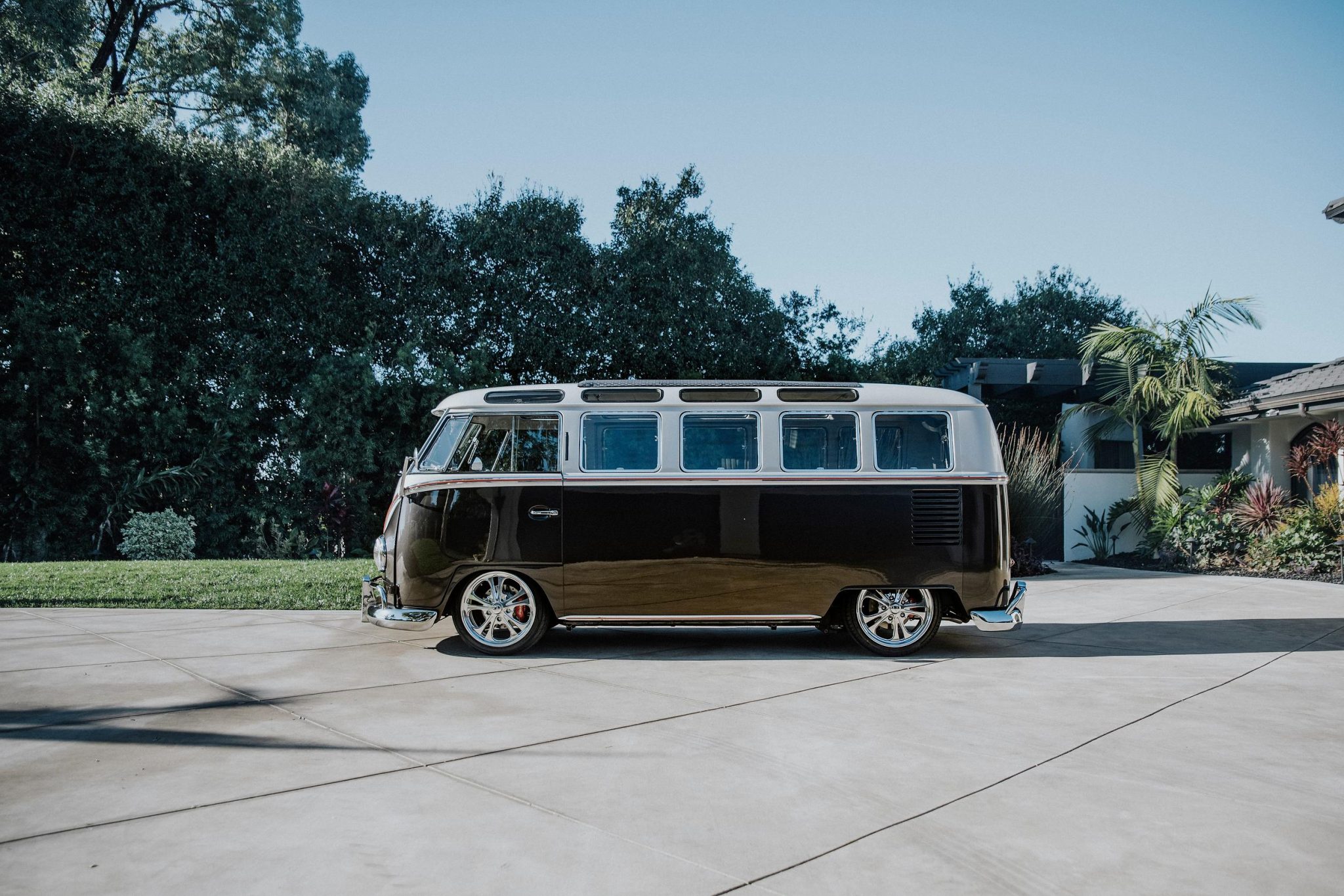 Polished 17″ Billet Specialties SLG05 Series forged aluminum wheels are mounted with Yokohama Advan tires. A set of four 15″ EMPI BRM wheels with Kenda tires is included in the sale and can be seen in the gallery. The bus rides on a lowered suspension, and stopping power is provided by red-painted Wilwood calipers over cross-drilled rotors at all four corners.