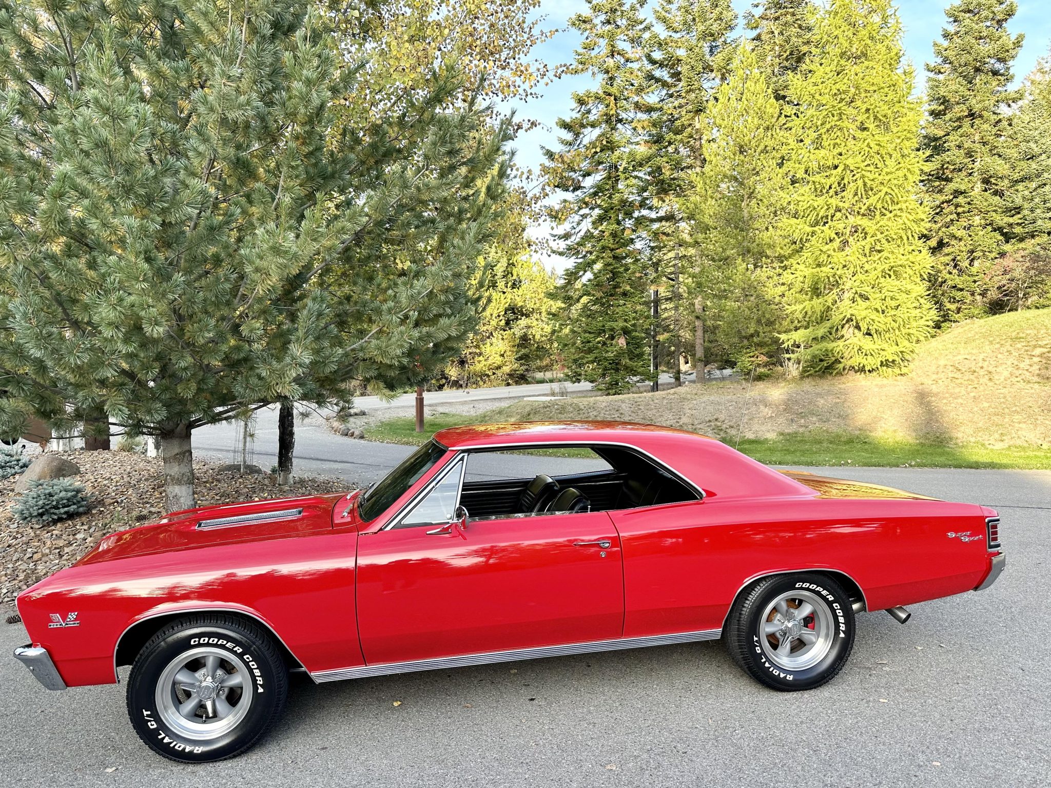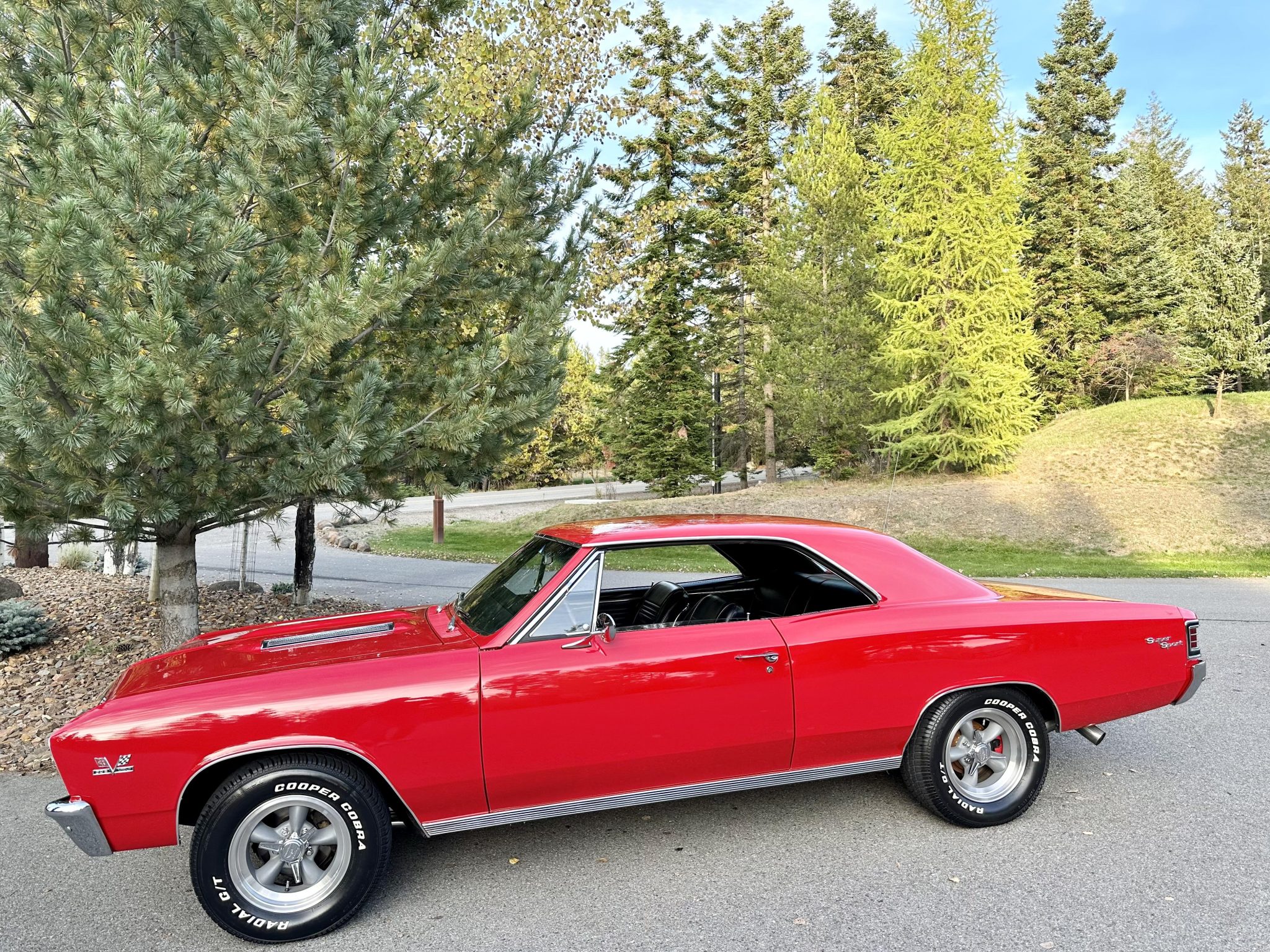 American Racing 15″ wheels wear spinner center caps and are mounted with Cooper Cobra Radial G/T white-letter tires measuring 225/70 up front and 255/60 out back. The car has been fitted with power-assisted steering, adjustable front upper control arms, and rear air-adjustable shock absorbers. Braking is handled by power-assisted discs at each corner.