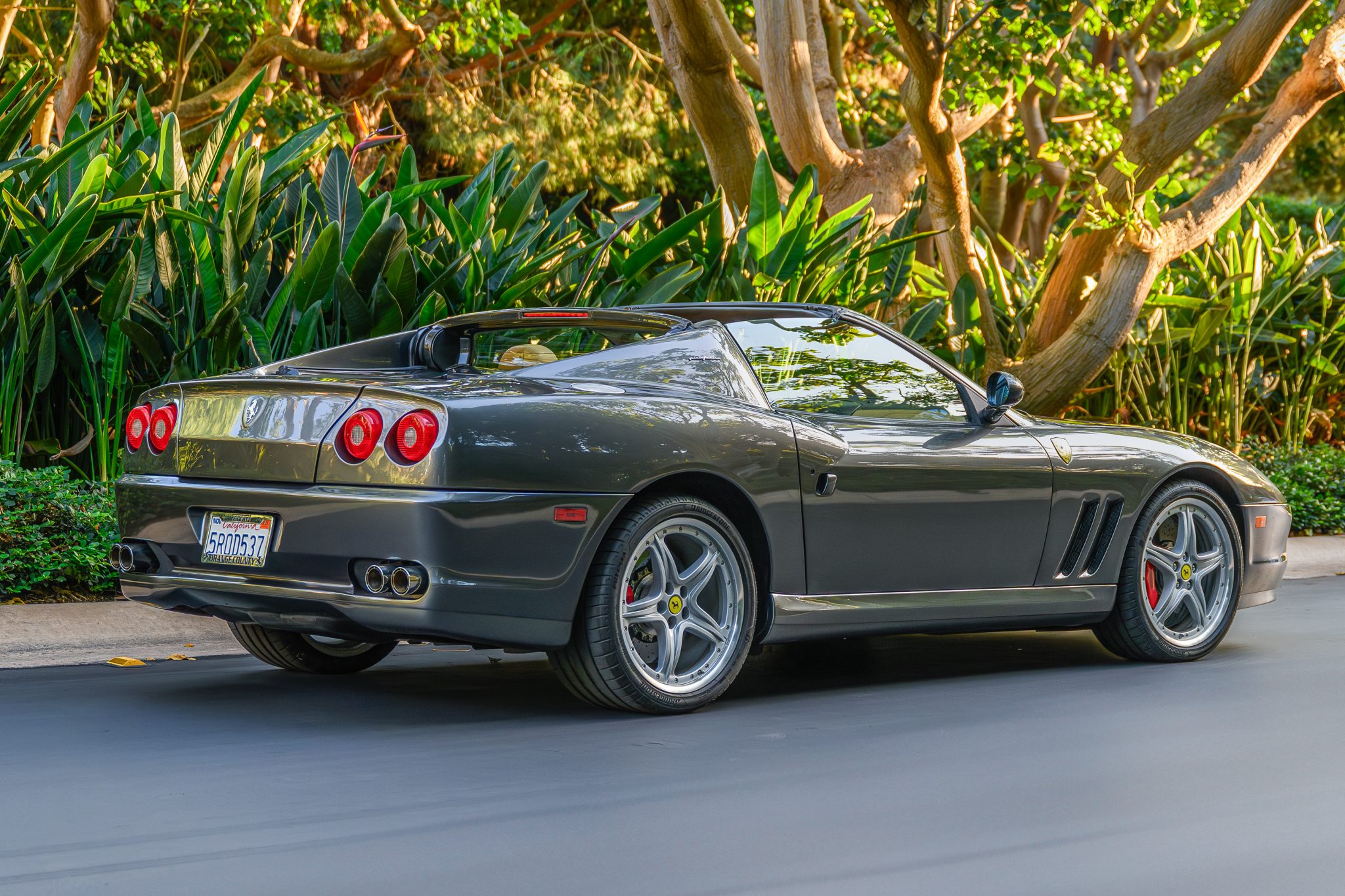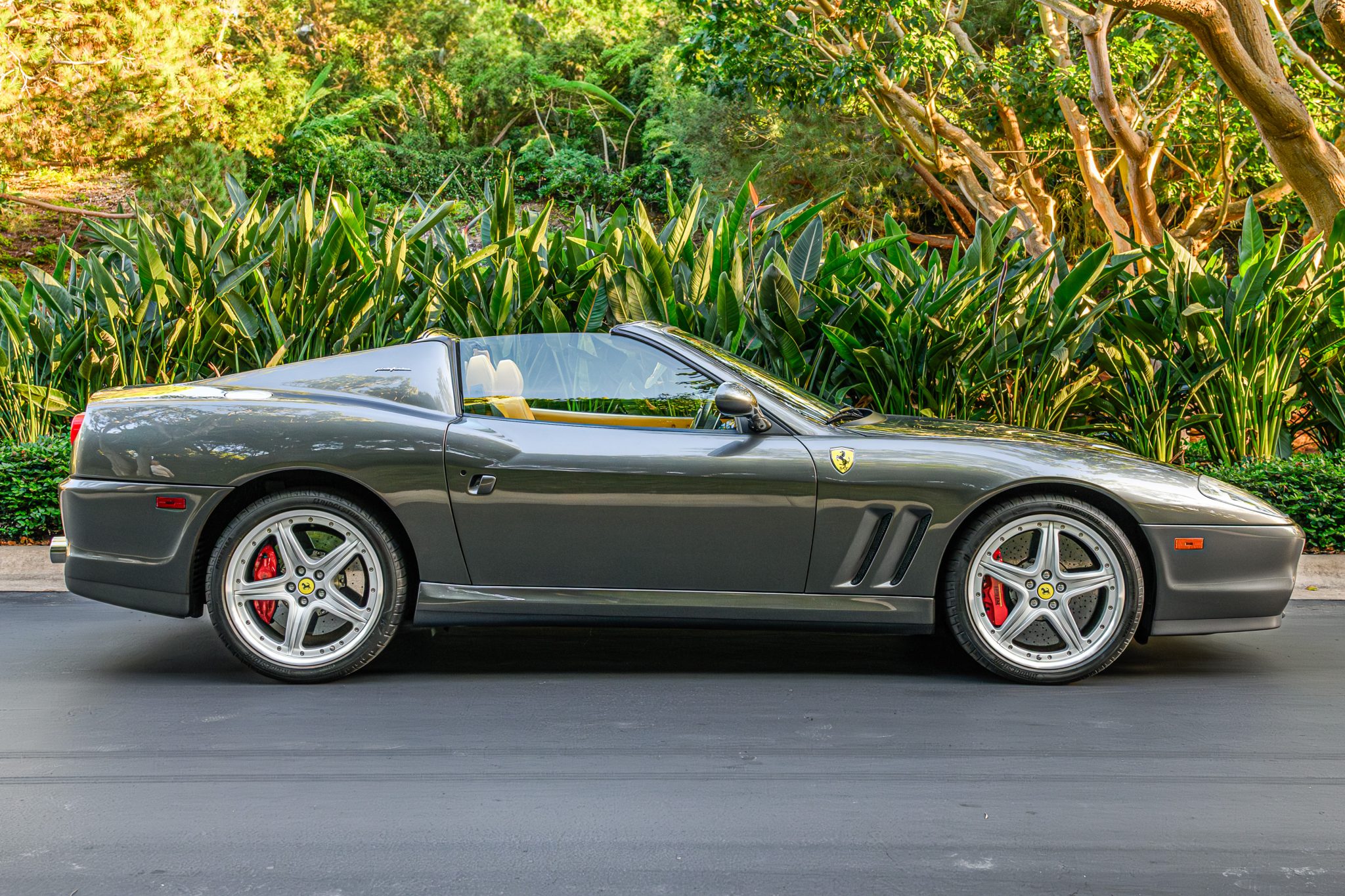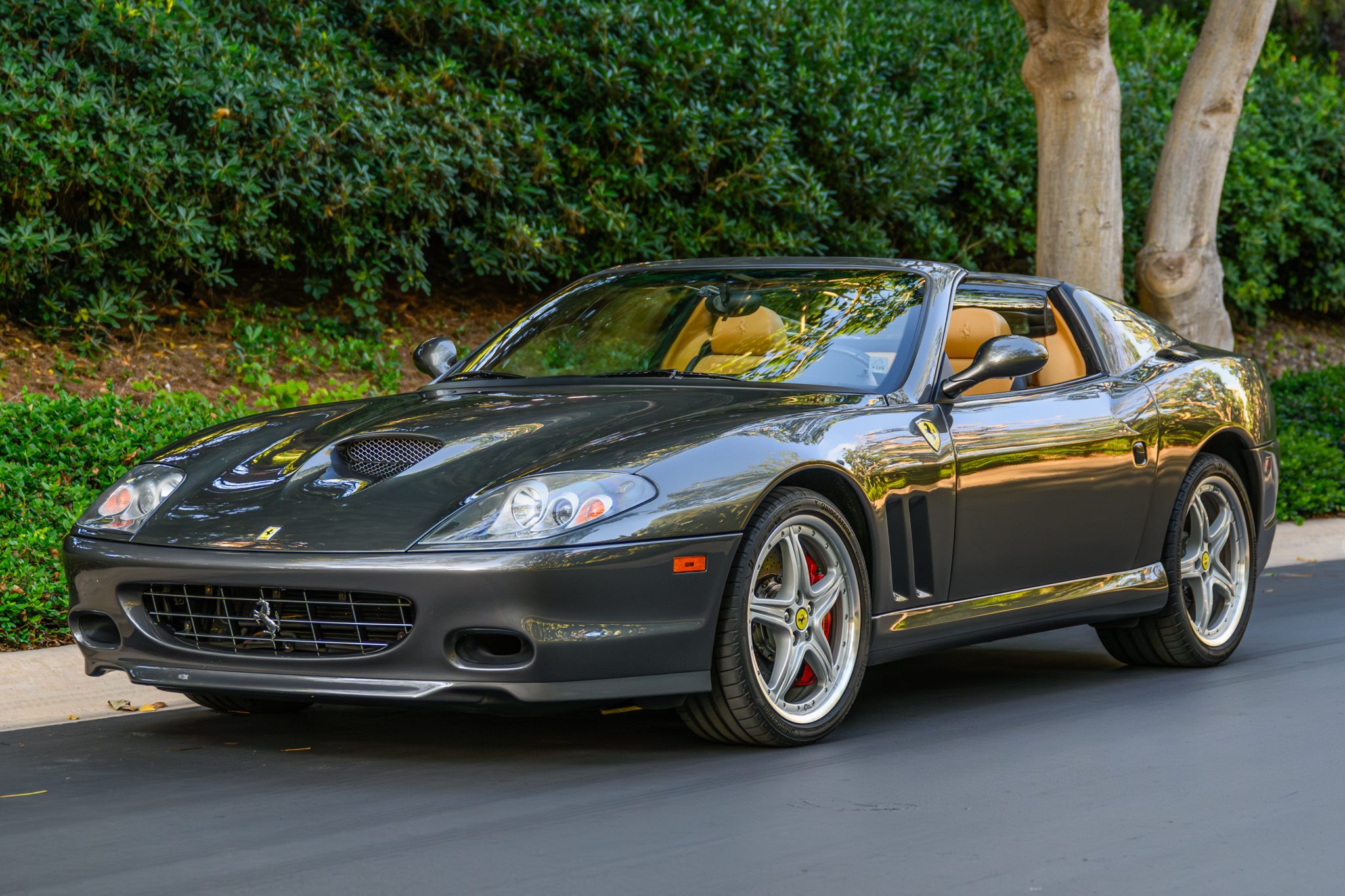 The 19″ multi-piece wheels wear yellow prancing horse center caps and are mounted with Bridgestone Potenza Sport tires. The car is equipped with Skyhook adaptive dampers, and the GTC package added suspension and steering upgrades as well as a carbon-ceramic brake system.