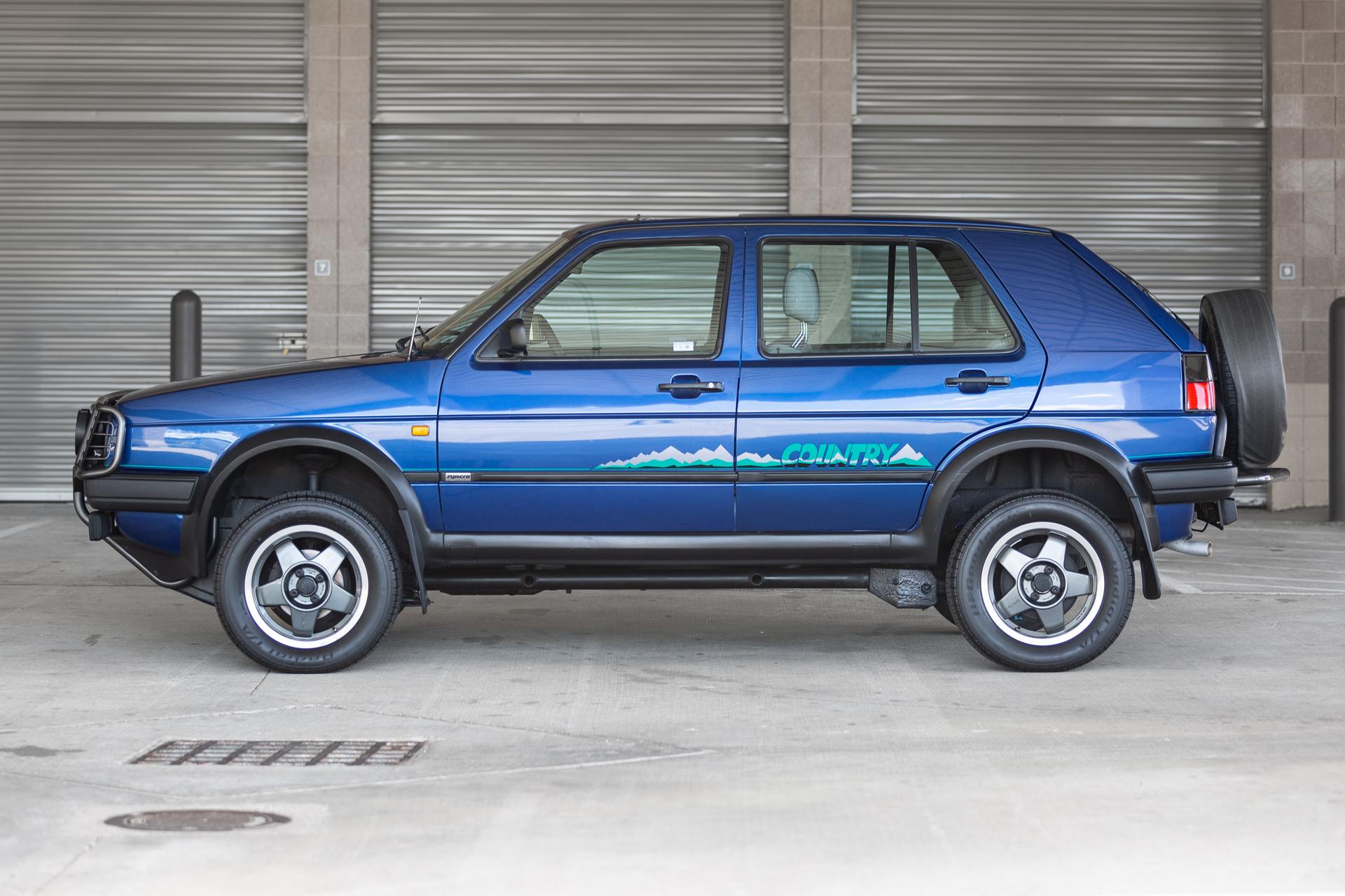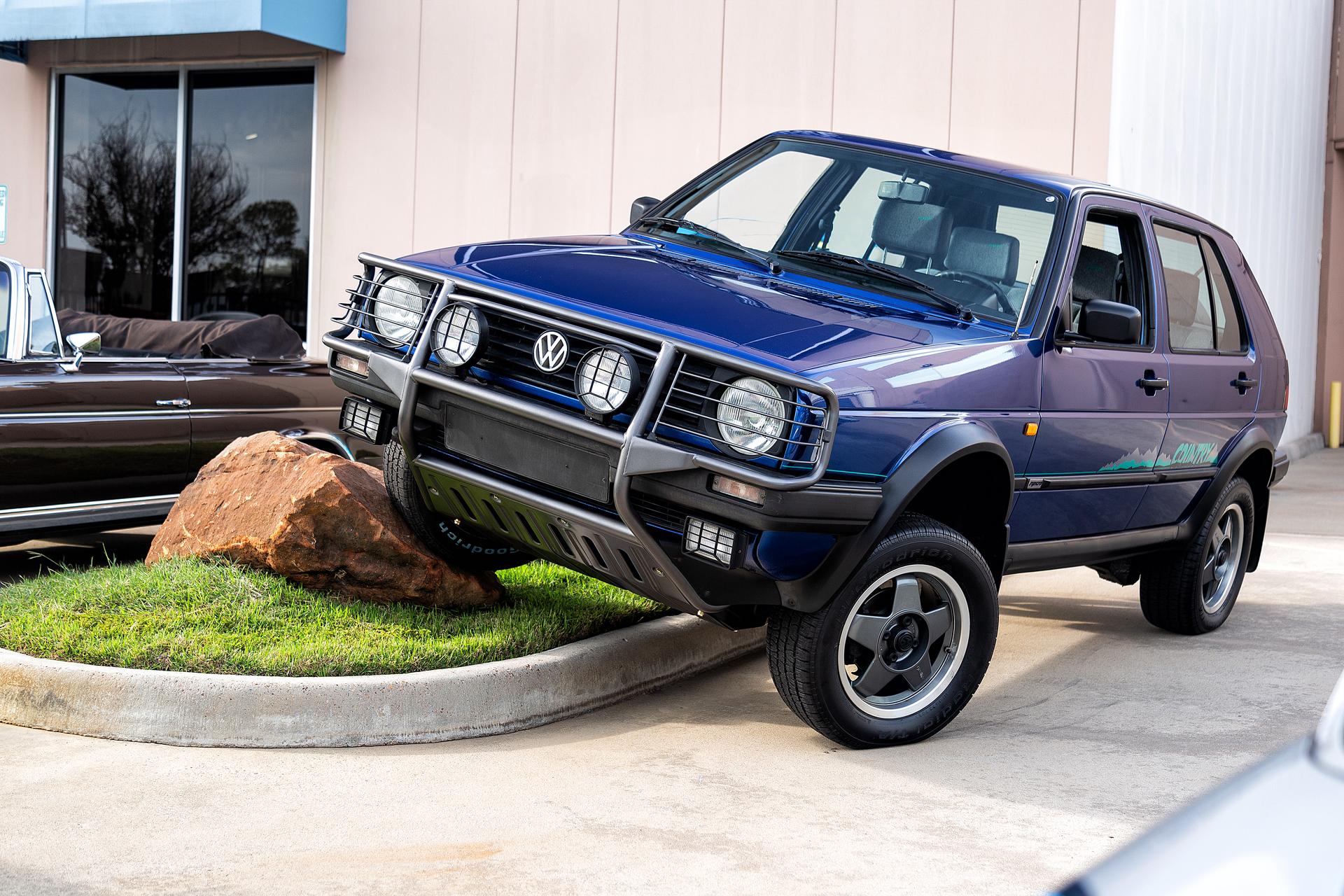 Speedline 15″ alloy wheels wear VW-branded center caps and are mounted with 215/60 BFGoodrich Radial T/A tires that show 2022 date codes, while a matching spare is affixed to a rear swing-out carrier. The Country rides on a lifted suspension when compared to the standard Mk2 Golf, and stopping power is provided by front disc and rear drum brakes.