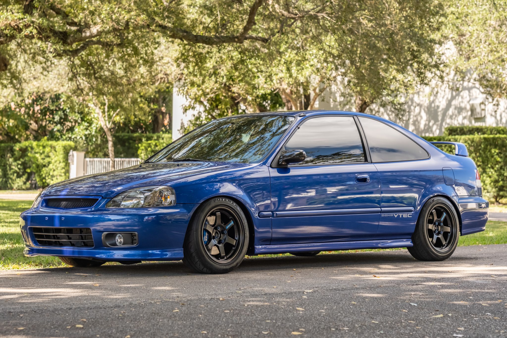 Rays Volk Racing TE37T 15″ forged wheels were mounted with 205/50 Bridgestone Potenza RE-71R tires and installed during the build. An extra set of Rays Volk Racing 16″ wheels and Bridgestone Potenza tires are also included in the sale. Spoon front calipers and larger rotors have been added. Moton three-way coilovers with remote reservoirs and Mugen front and rear strut tower braces were installed during the work in 2020, along with the following Hardrace components: