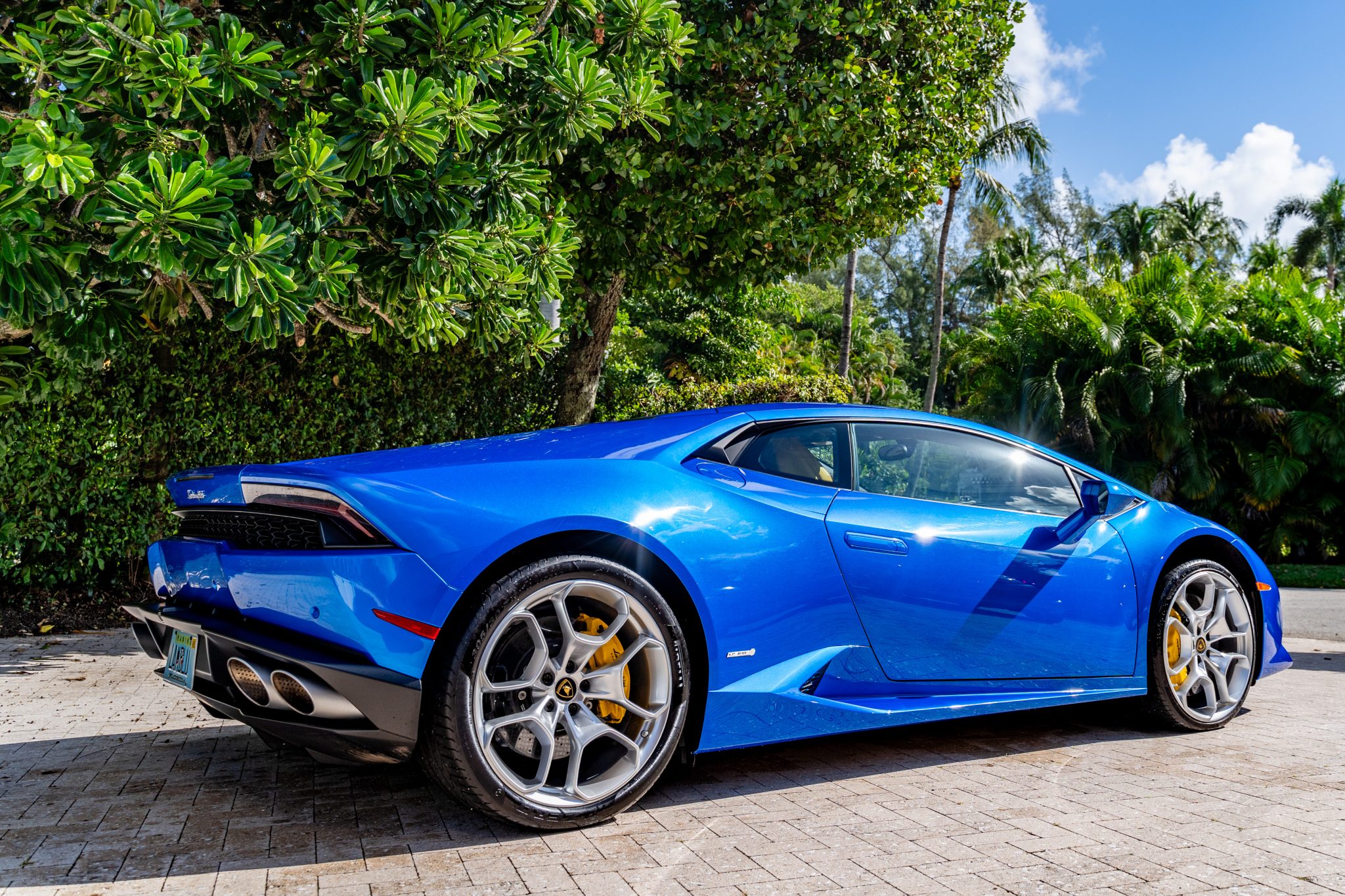 Silver-finished 20″ wheels are mounted with 245/30 front and 305/30 rear Pirelli P Zero tires. Braking is handled by yellow Lamborghini-branded calipers over cross-drilled carbon-ceramic rotors at all four corners, and the car is equipped with a front-axle lift system. Chips are noted on the left-front wheel.