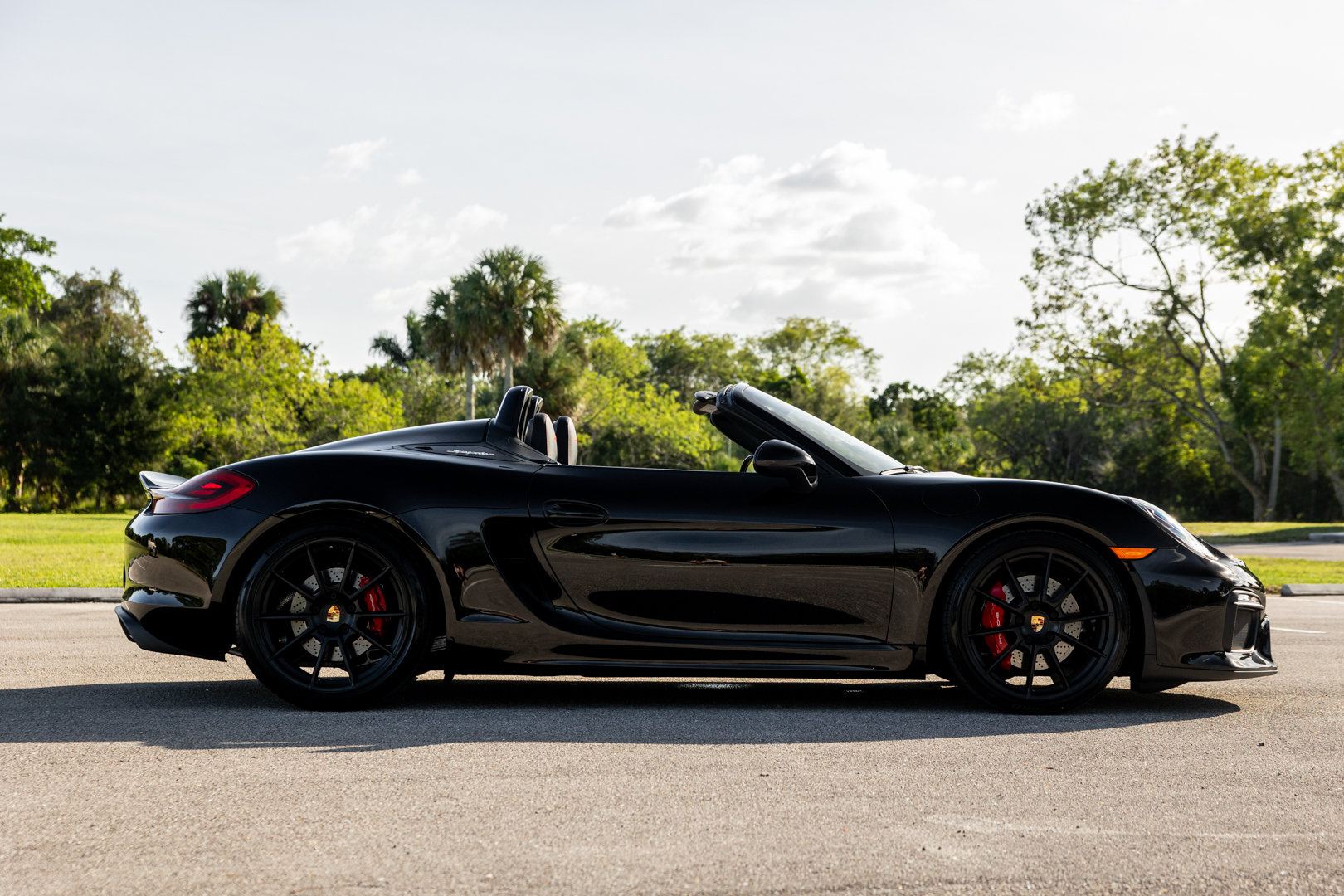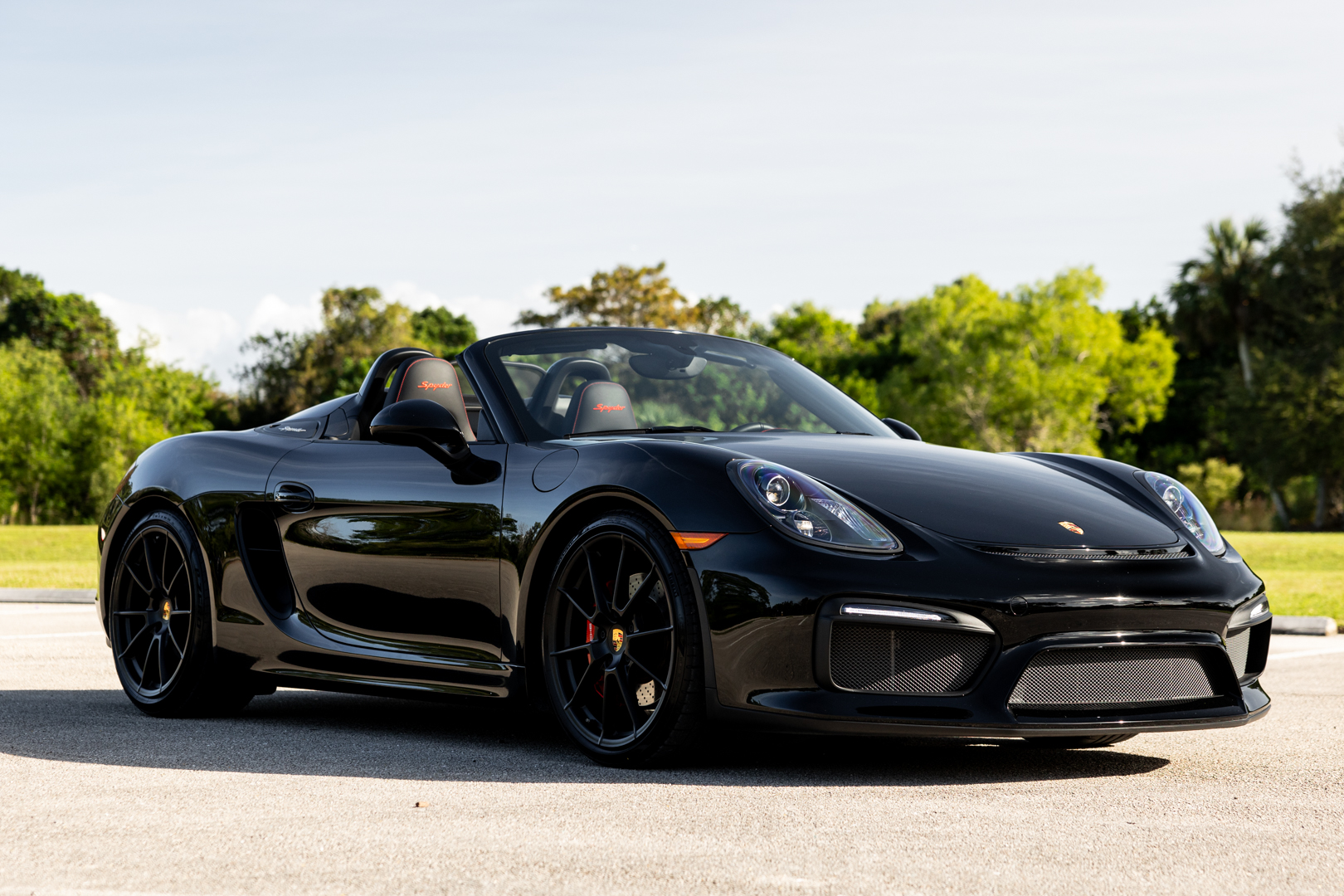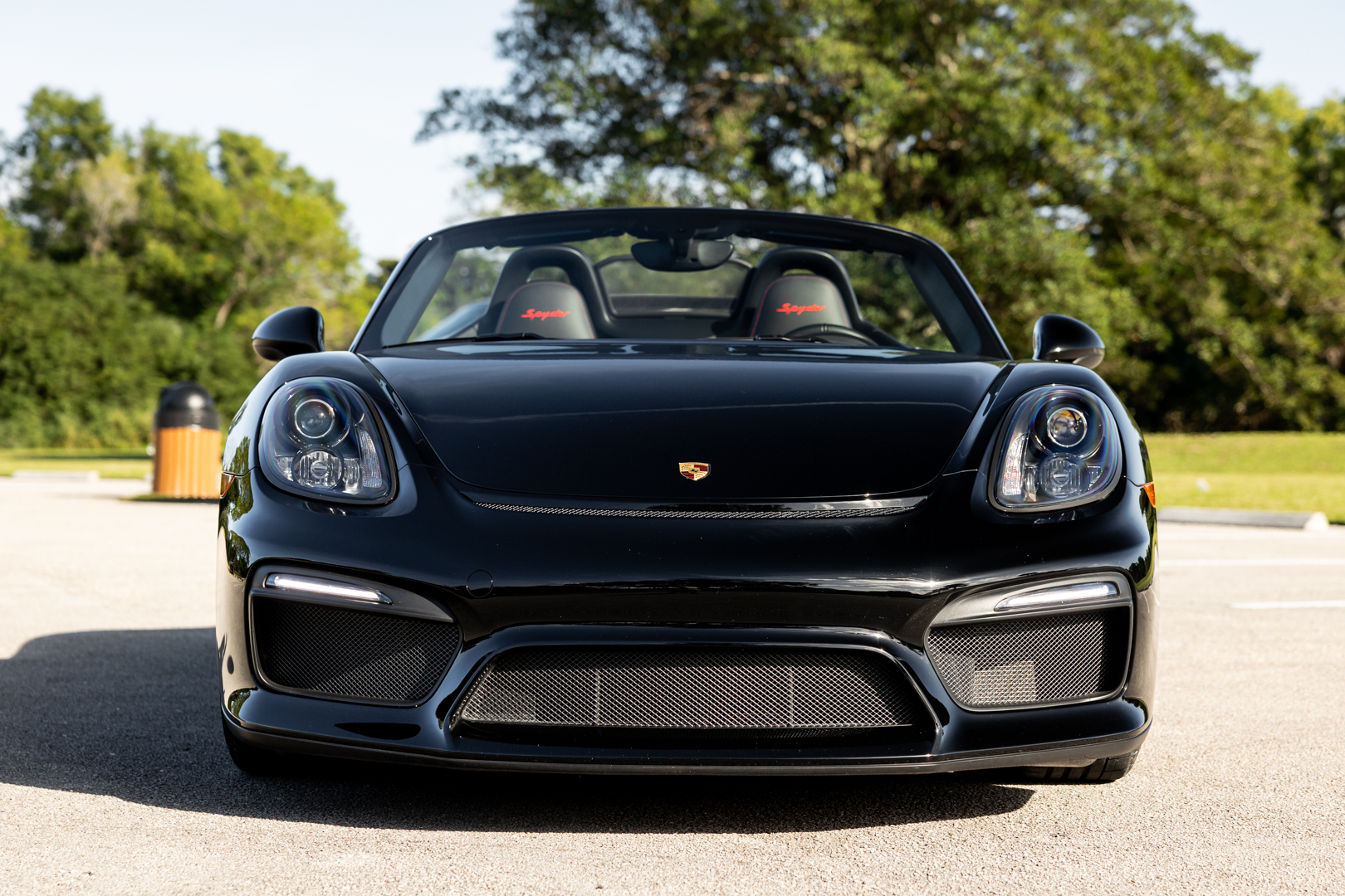 The 20″ Spyder alloy wheels are mounted with Pirelli P Zero tires measuring 235/35 up front and 265/35 out back. Braking is handled by four-wheel cross-drilled and ventilated discs with red-painted Porsche-branded calipers. Boxster Spyders were equipped from the factory with a 20mm lower sport suspension than the standard Boxster. An electromechanical steering rack that was shared with the contemporary 911 Turbo was also fitted as standard.
