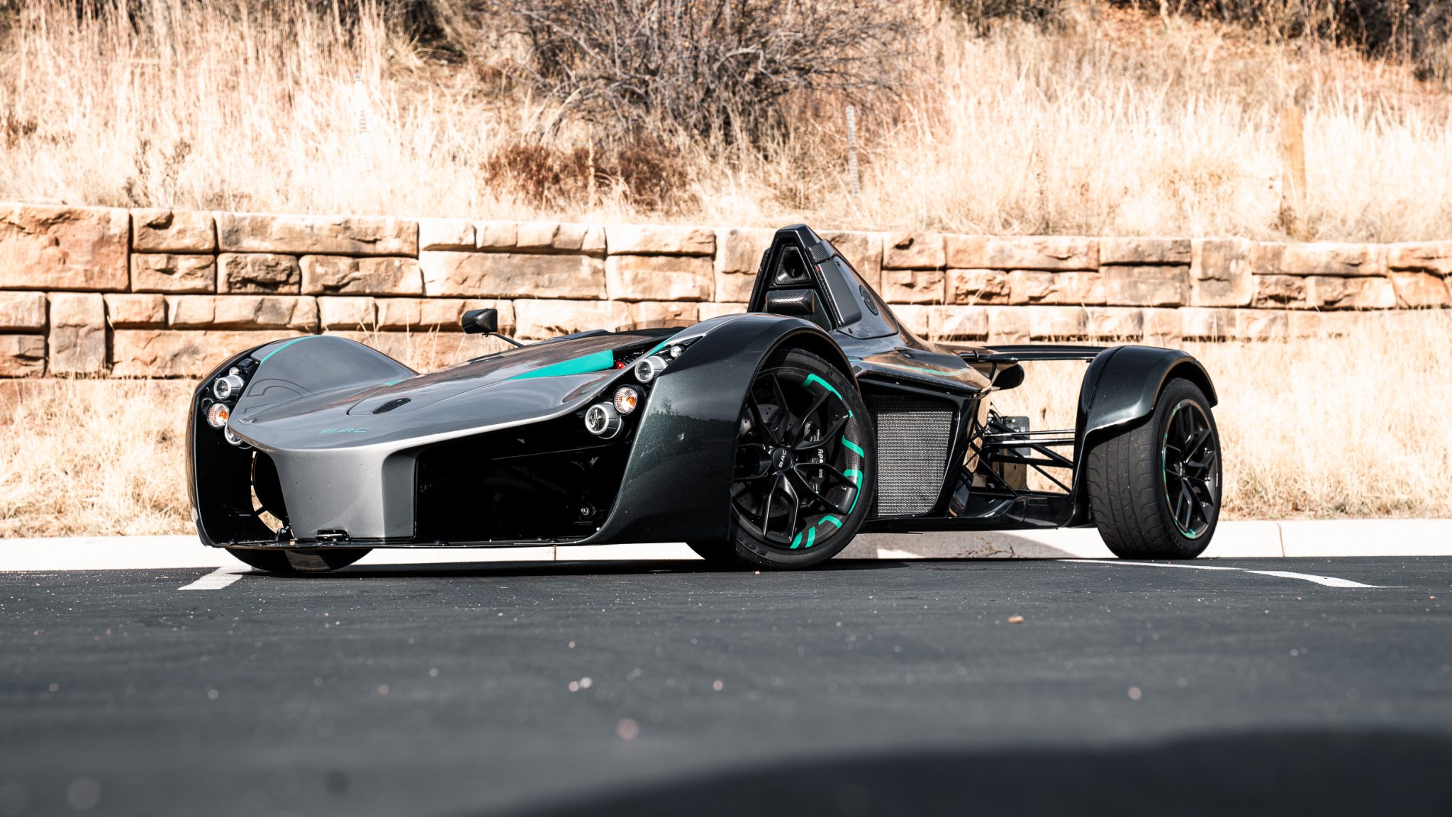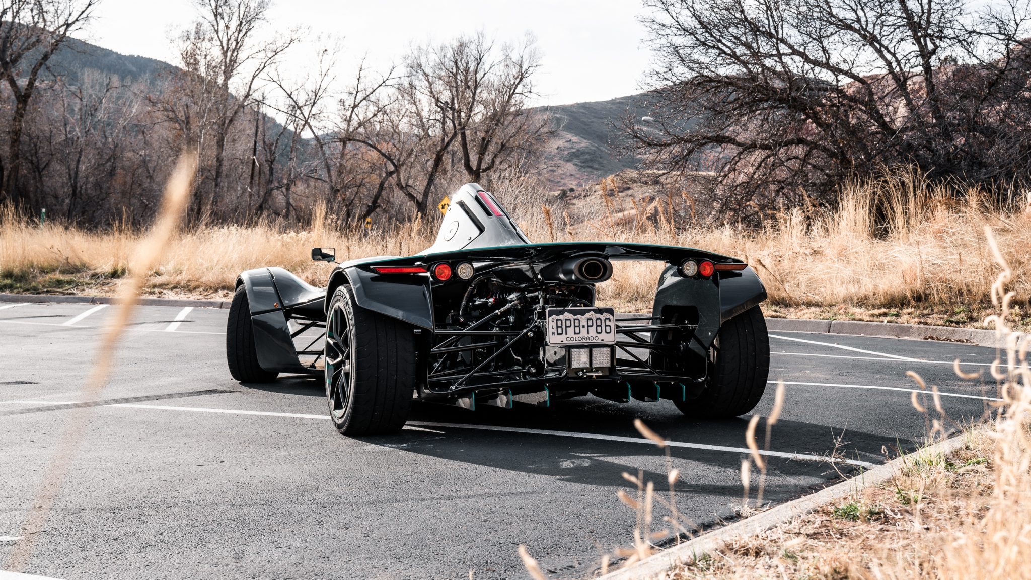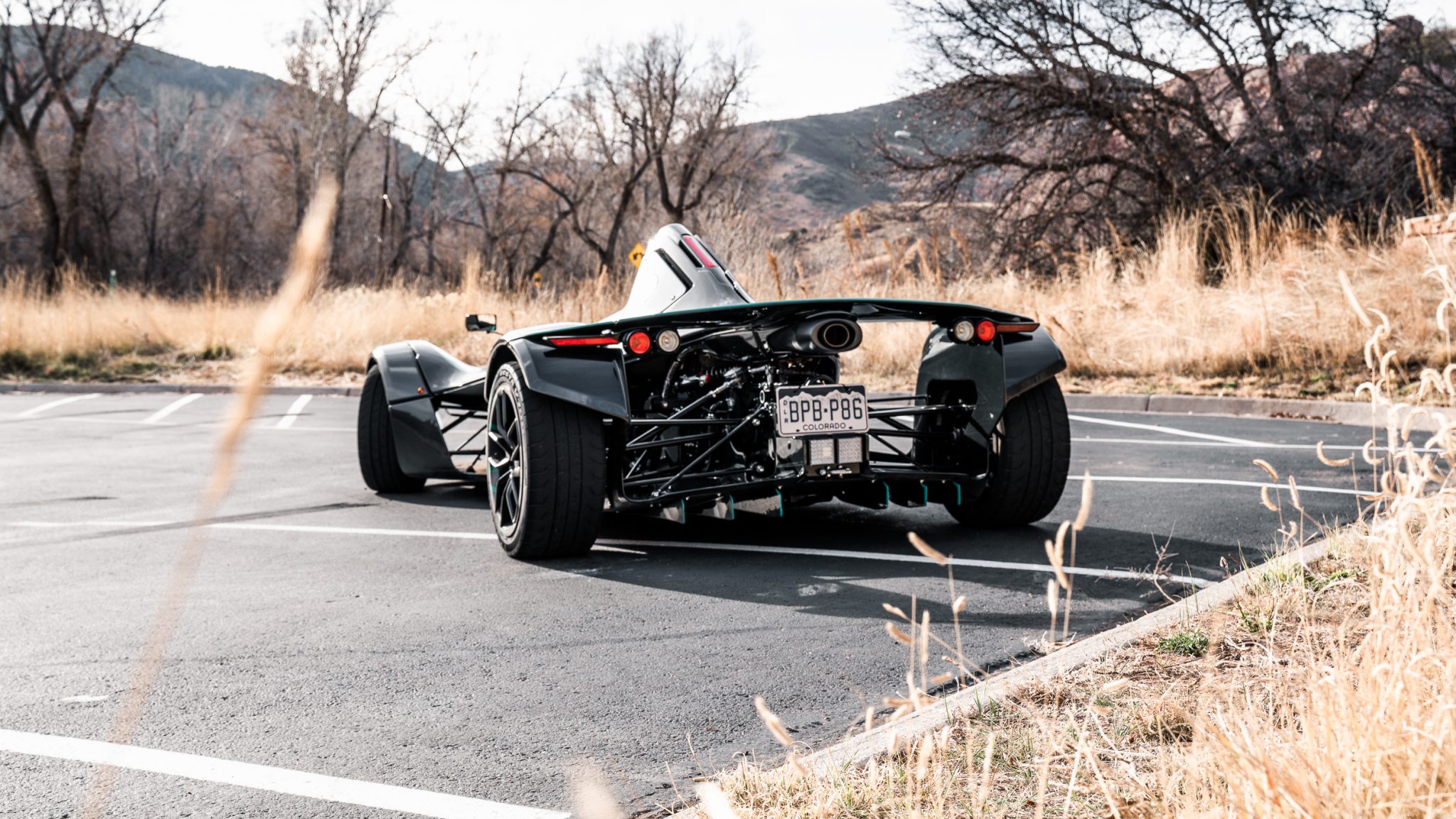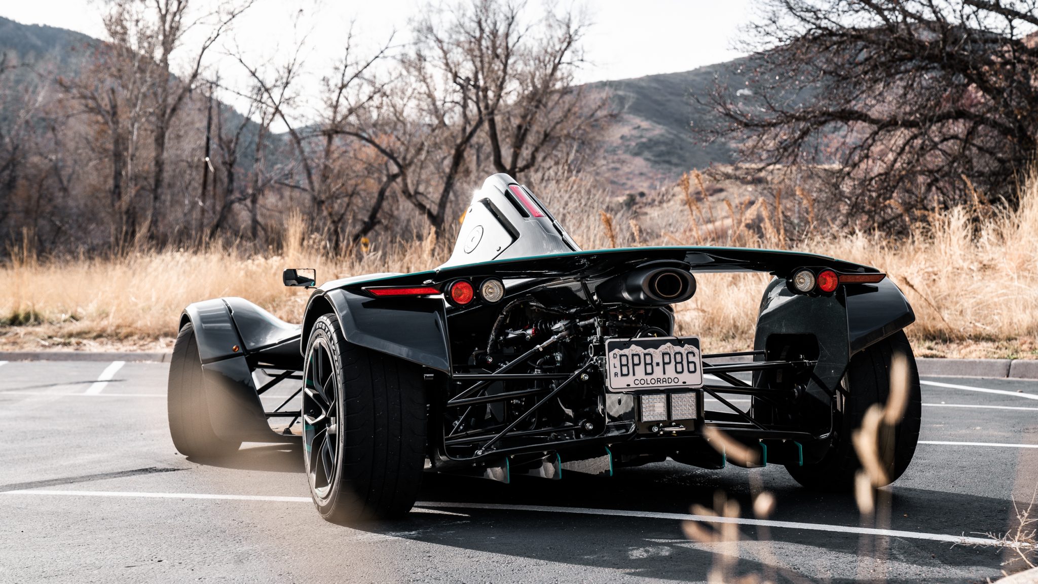 The 17″ Dymag carbon-fiber wheels feature teal accents with BAC center caps and are mounted with 205/40 front and 245/40 rear Kumho Ecsta V700 tires. The cantilever suspension utilizes ZF adjustable coilovers, and stopping power is provided by AP Racing calipers over cross-drilled and ventilated rotors at all four corners.