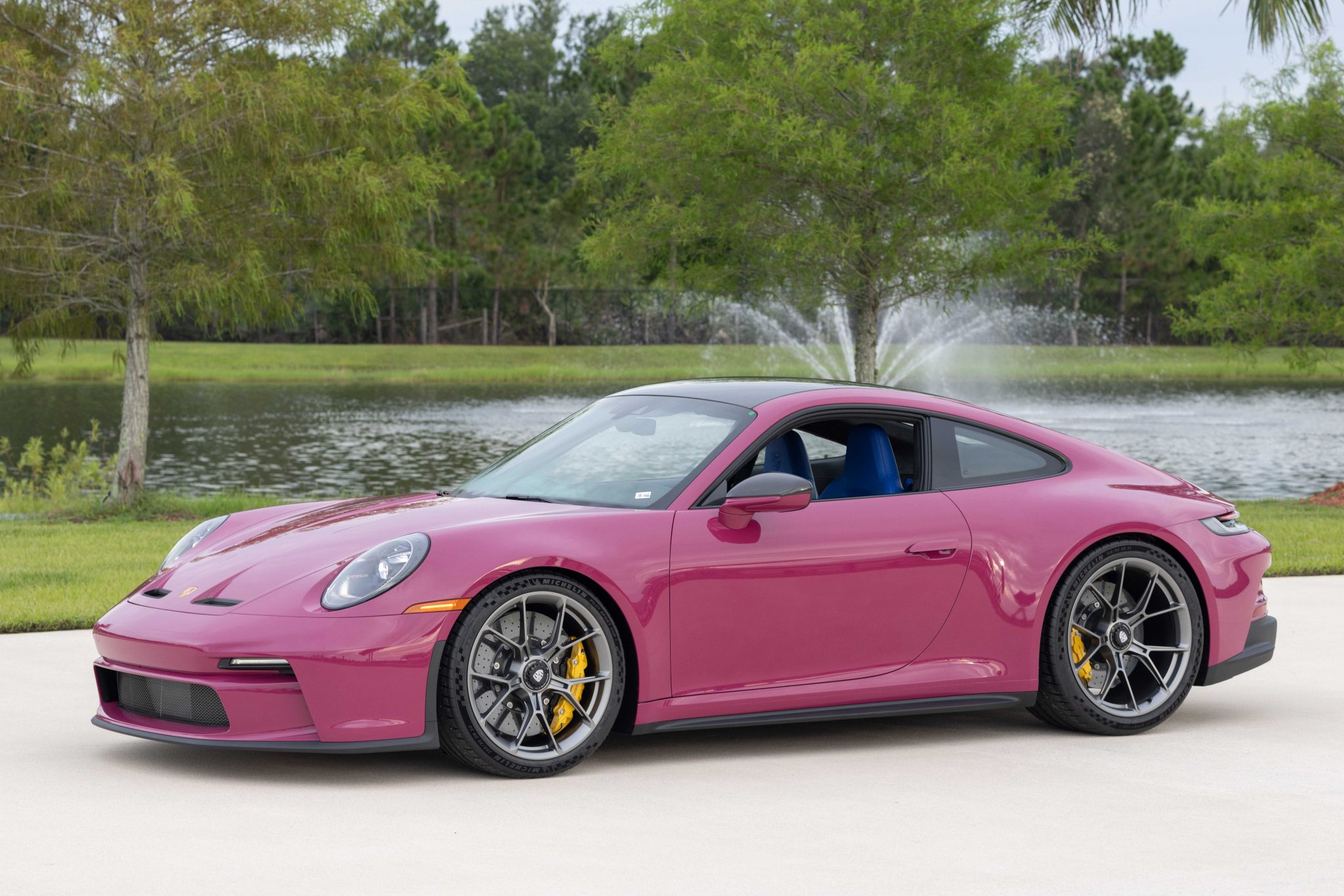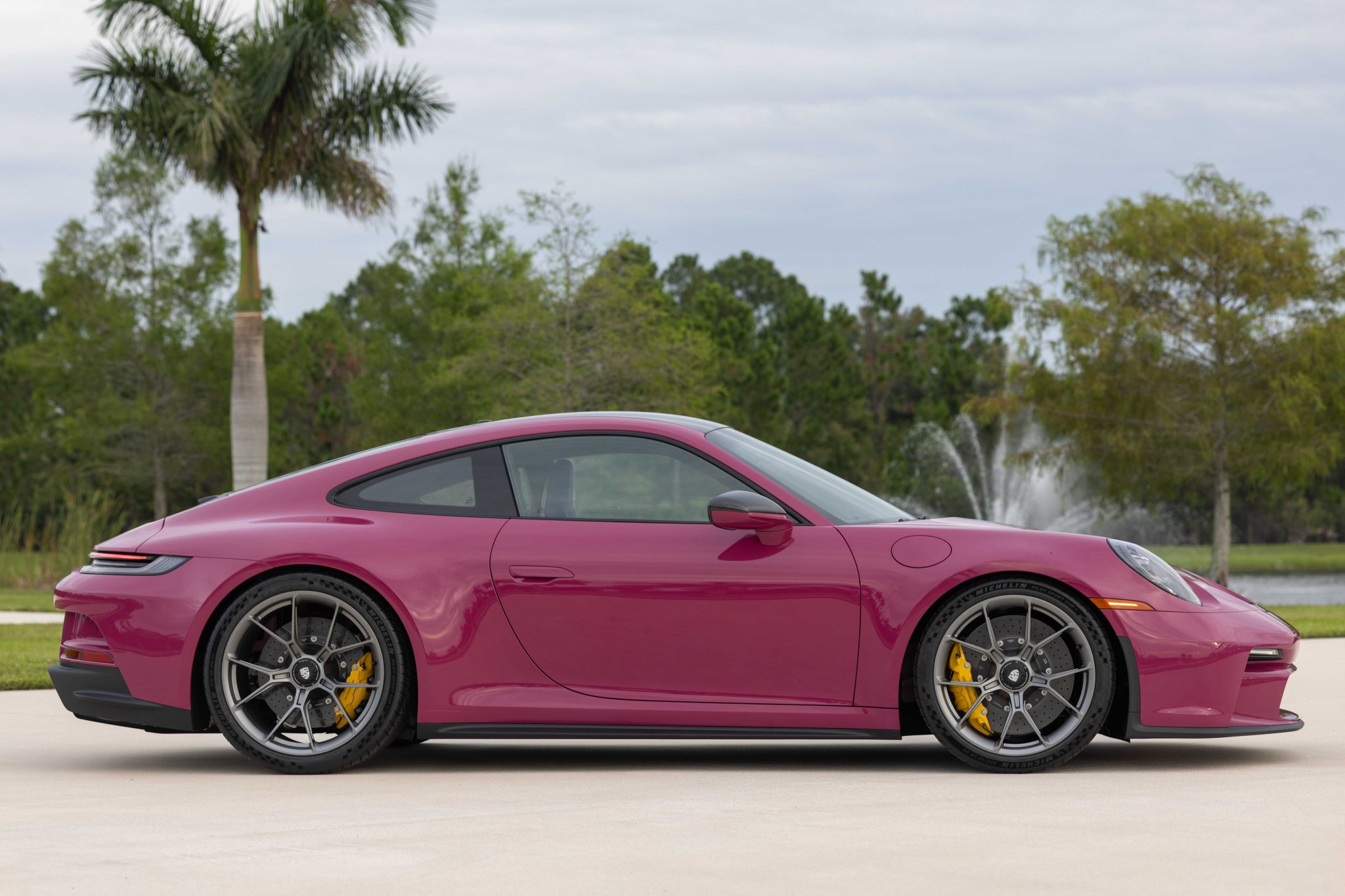 The 20″ front and 21″ rear GT3 center-lock wheels are mounted with Michelin Pilot Sport Cup 2 tires measuring 255/35 up front and 315/30 at the rear. Stopping power is provided by Porsche Ceramic Composite Brakes (PCCB) with yellow-finished calipers over cross-drilled and ventilated discs at each corner. The car is equipped with a front-axle lift system and rear-axle steering.