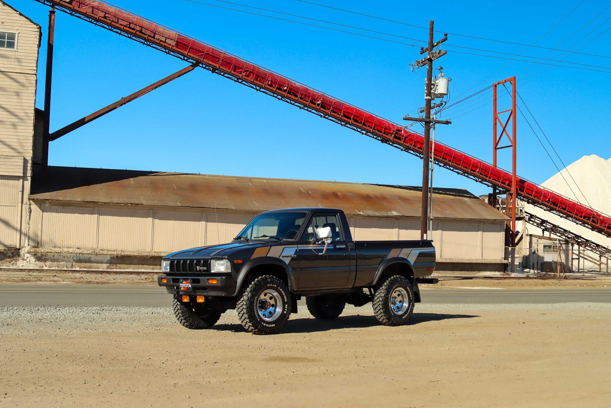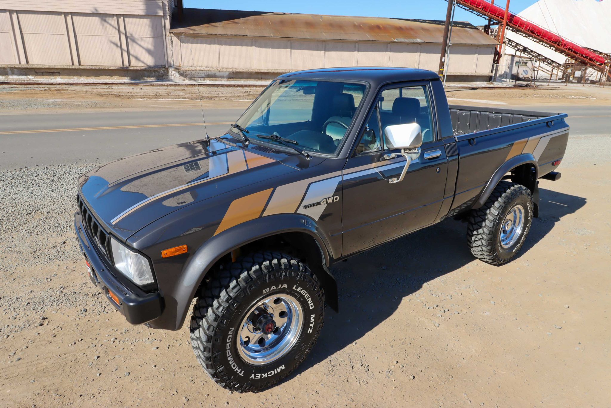 Polished 15″ Mickey Thompson wheels wear 31×10.5″ Mickey Thompson Baja Legend MTZ tires that are noted to have been mounted under current ownership. The truck is equipped with Aisin manually locking front hubs, and braking is handled by power-assisted front discs and rear drums.