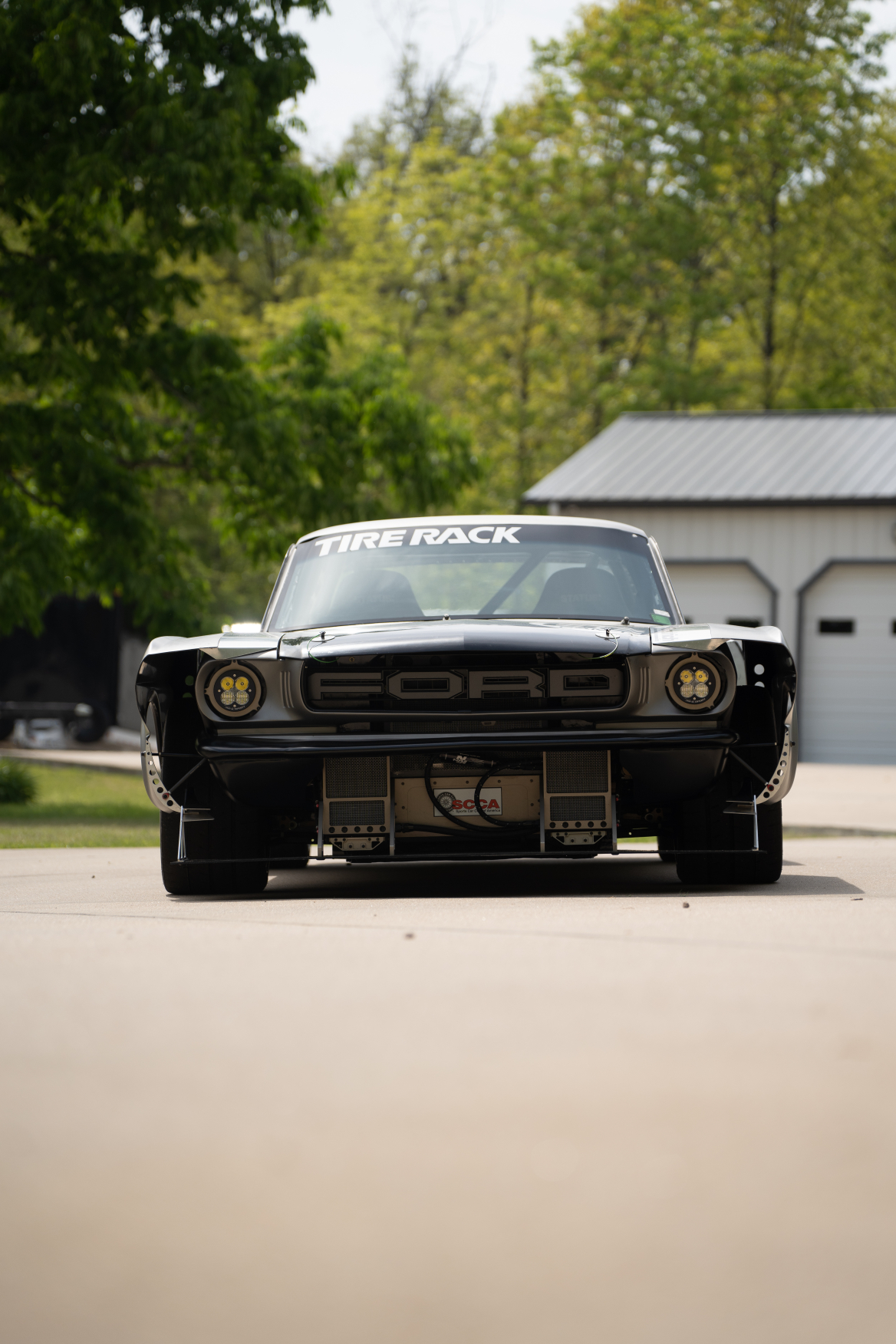 Black CCW wheels measure 18×12″ front and rear, and they are mounted with 315/30 Yokohama Advan A052 tires. The chassis has been modified with front and rear subframes from a 2020 Mustang GT350, and the front suspension includes custom-fabricated A-arms and hardware as well as adjustable Penske coilovers. The braking system incorporates GT350-sourced Brembo Calipers, two-piece Racing Brake rotors, and an electric brake booster from a Tesla.