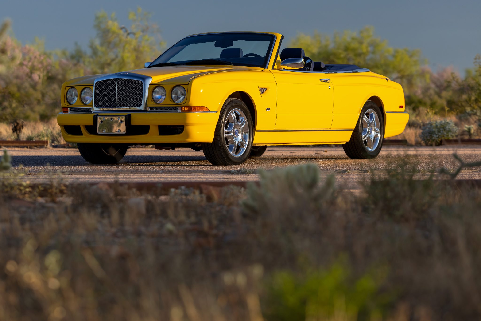 Chrome 18″ five-spoke wheels wear Bentley-branded center caps and are mounted with 255/50 Pirelli P Zero Rossa tires. Stopping power is provided by disc brakes at all four corners with slotted rotors and dual calipers up front. Damage is visible on the right-rear wheel.