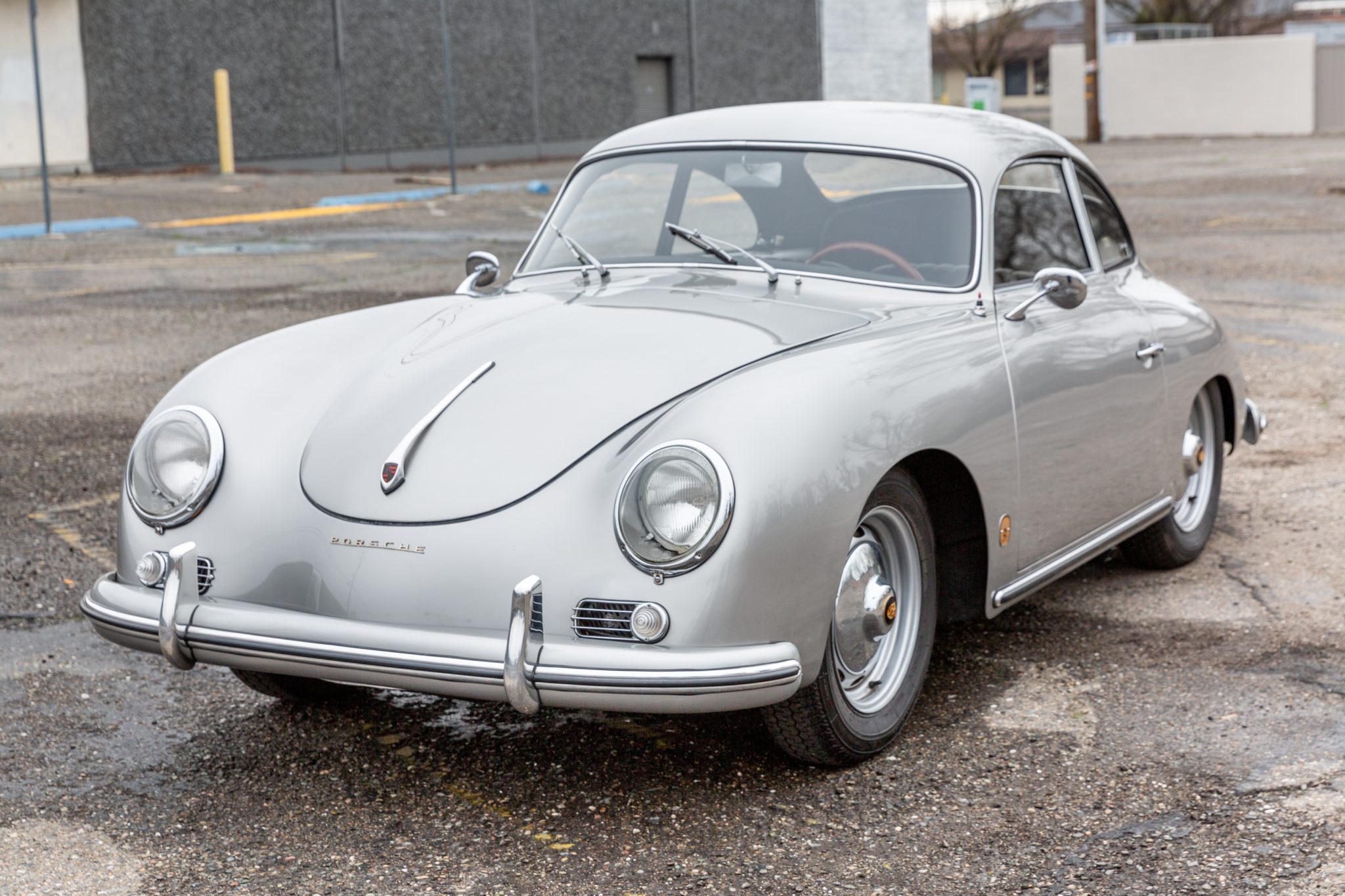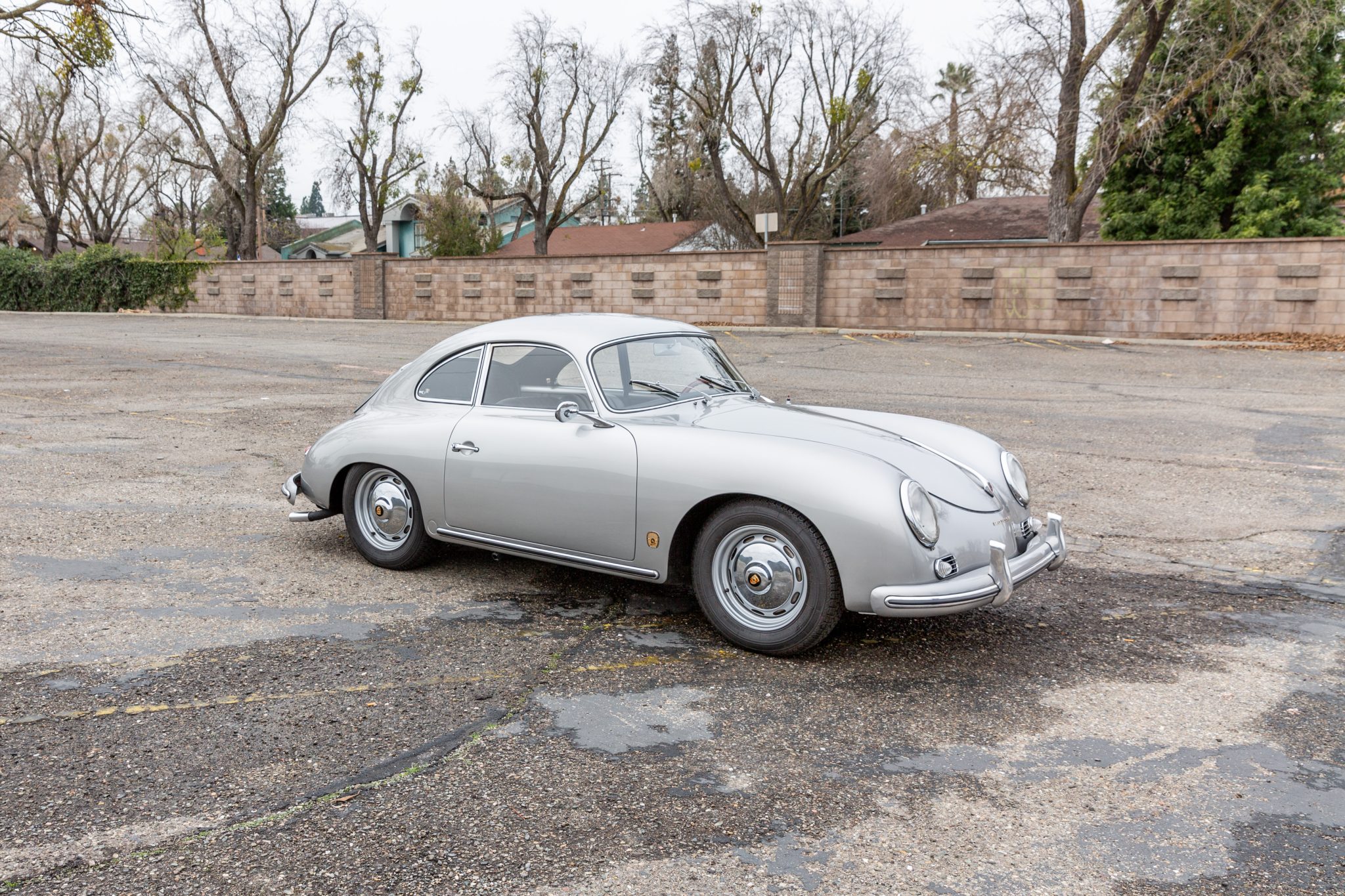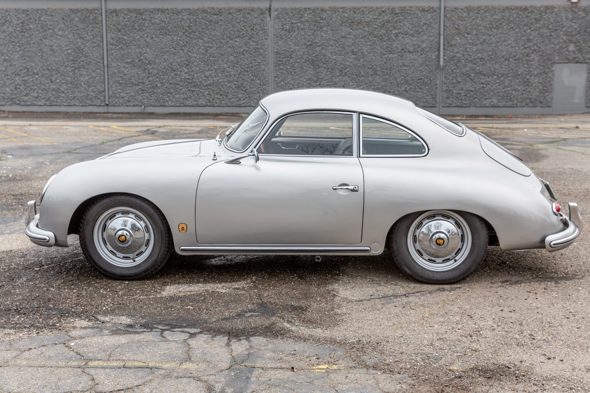 Silver-finished 15″ steel wheels wear Porsche-crest hubcaps and are mounted with 165-width Michelin XZX tires, while a matching spare is stored in the front trunk compartment. Stopping power is provided by four-wheel drum brakes, which were reportedly overhauled as part of the refurbishment. Aftermarket shocks are installed, and a total of eight spare hubcaps will accompany the sale.