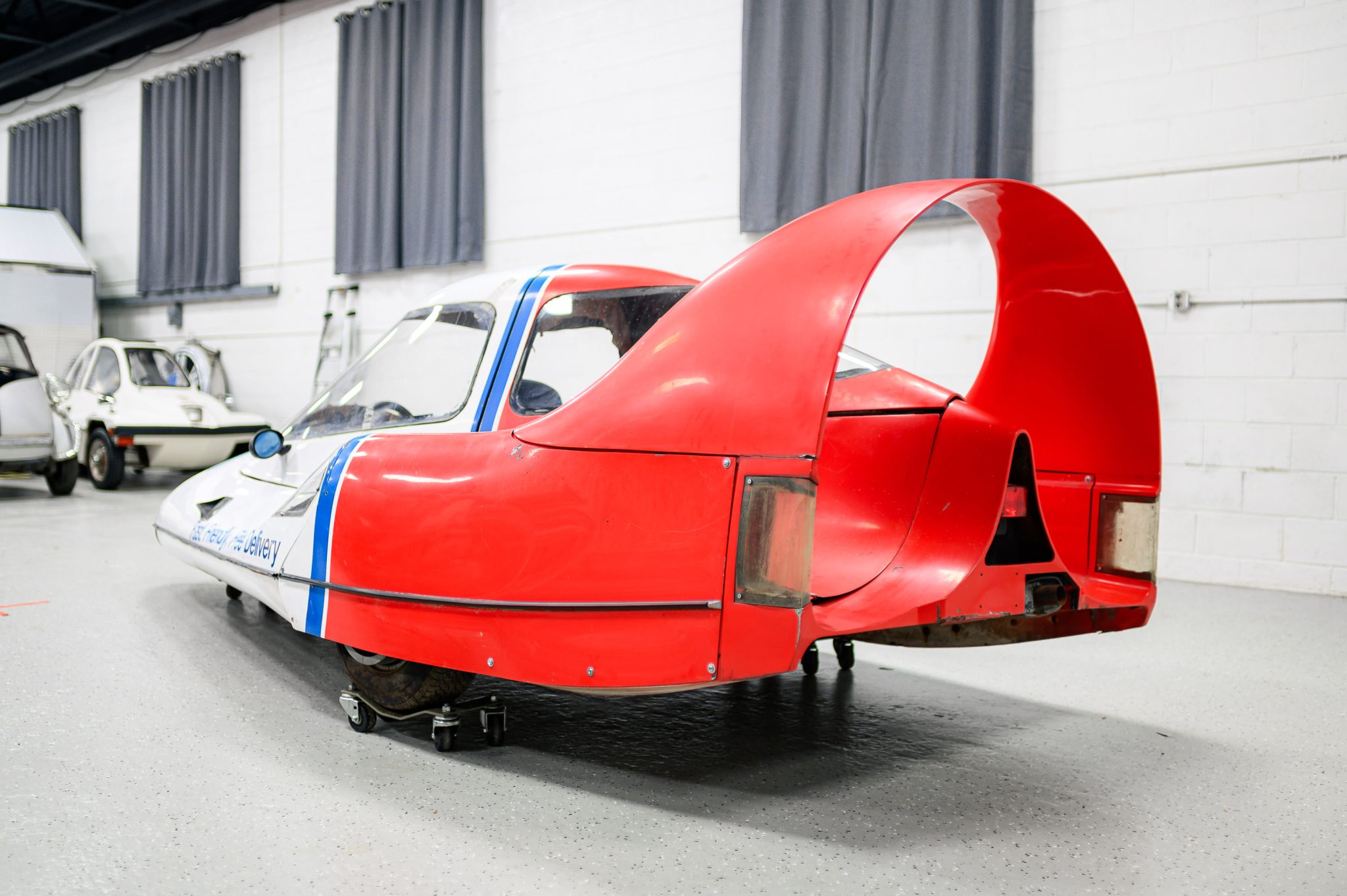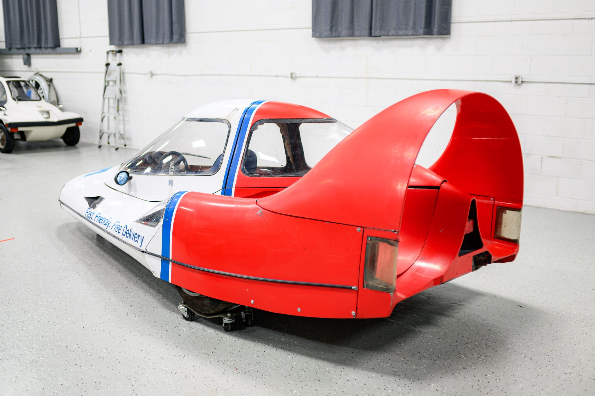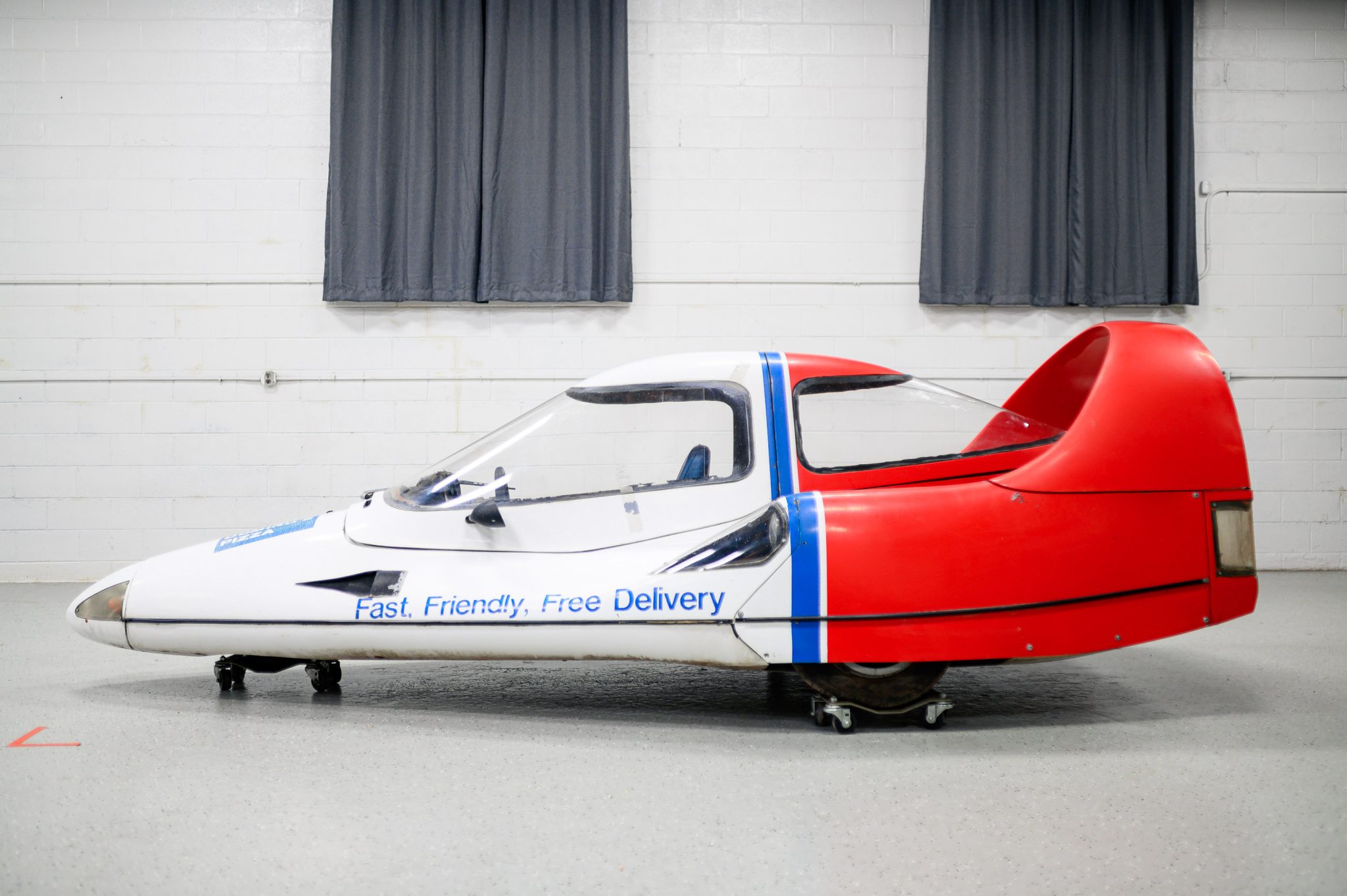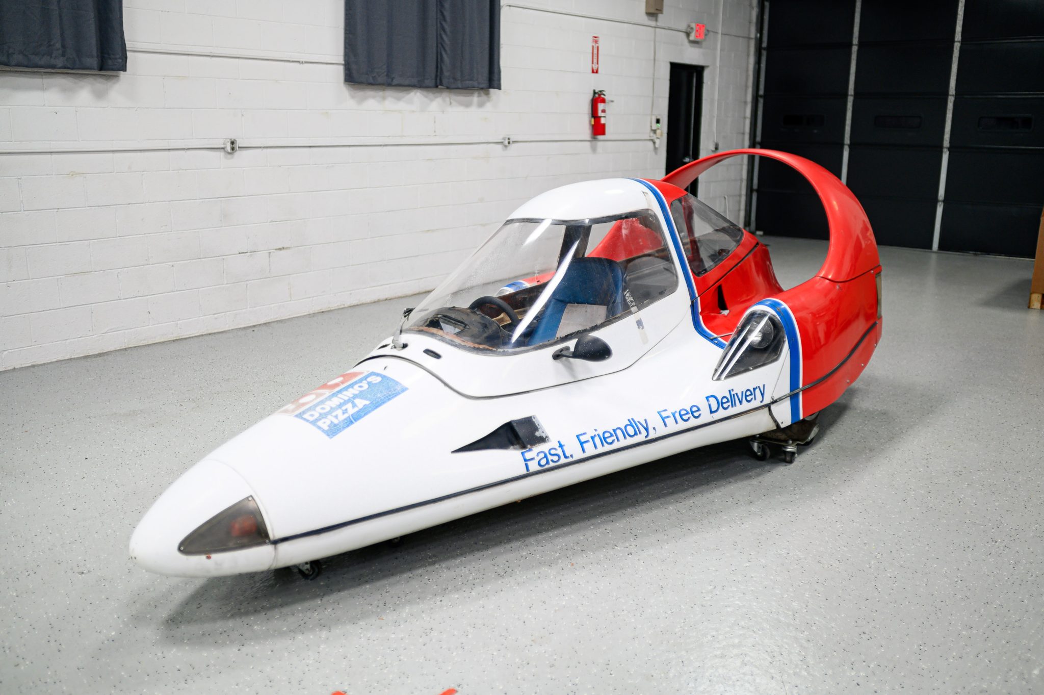 The fiberglass monocoque on this example is finished in white with a red and blue Domino’s Pizza livery. Styling incorporates nose-mounted turn signals, NACA ducts, covered headlights and taillights, a sliding canopy top, an “Amick Arch” rear spoiler, and a central brake light. The right side-view mirror is not fitted but is included in the sale. Chips and other imperfections in the finish can be seen in the gallery.