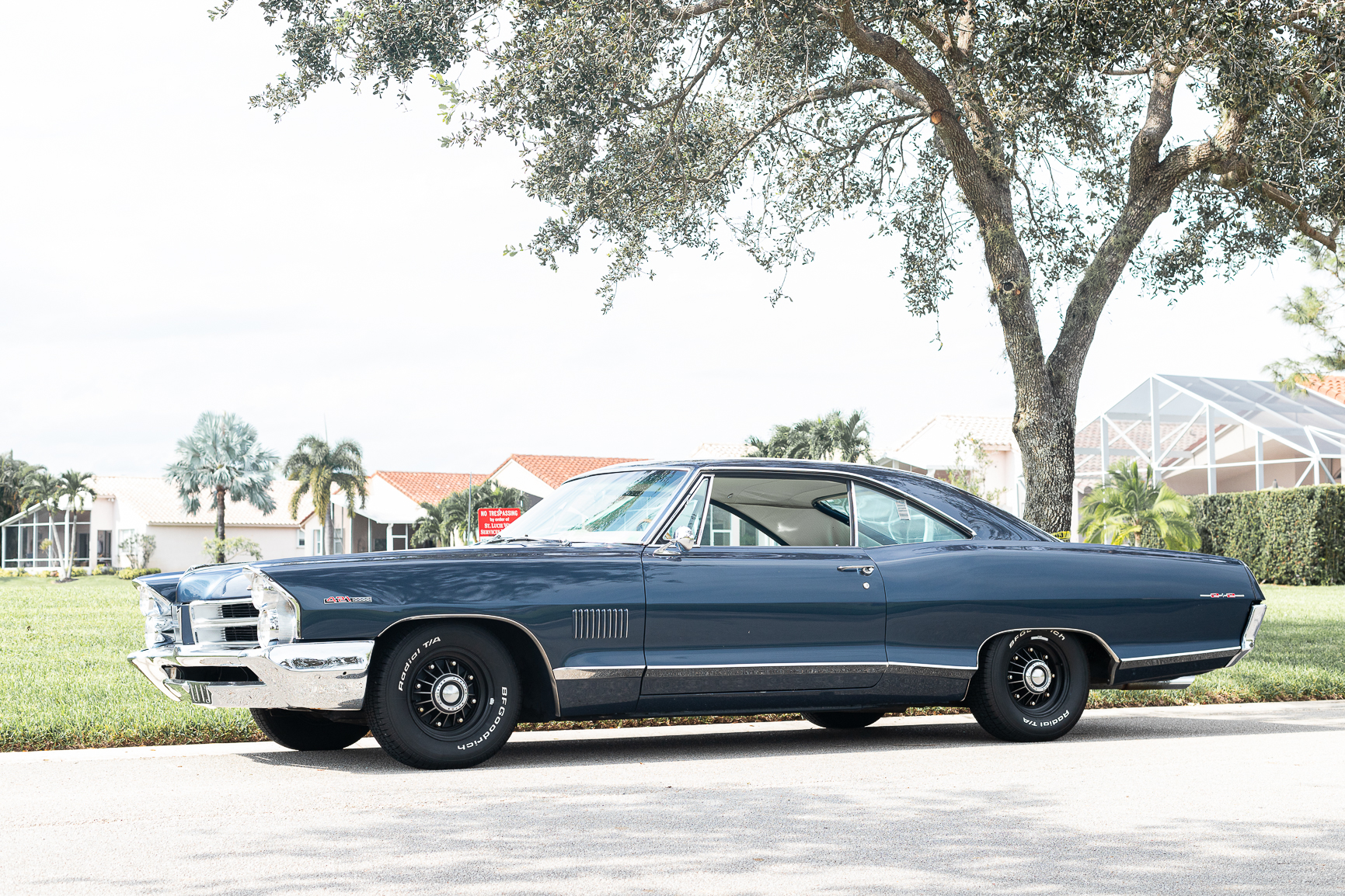 Black 14″ eight-lug wheels wear Pontiac Motor Division center caps and are mounted with 225/70 BFGoodrich Radial T/A white-letter tires. A full-size spare is located in the trunk. There are areas of peeling finish on the right-side wheels. The car is equipped with power steering, and braking is handled by power-assisted finned drums at each corner.