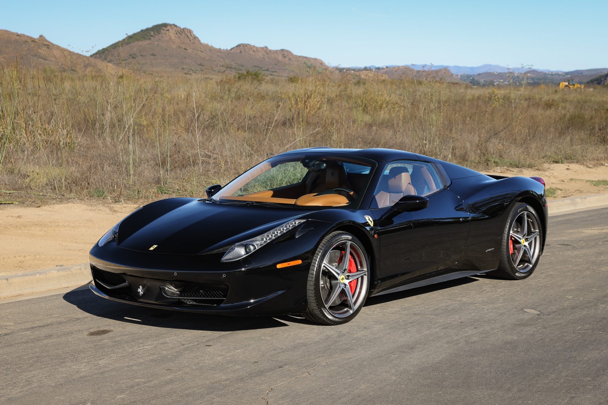 The 20″ five-spoke alloy wheels are mounted with staggered-width mismatched tires. The car is equipped with magnetorheological dampers in addition to a suspension lift system, and braking is handled by red-finished Ferrari calipers over cross-drilled carbon-ceramic rotors at all four corners. Curb damage is present on three wheels.