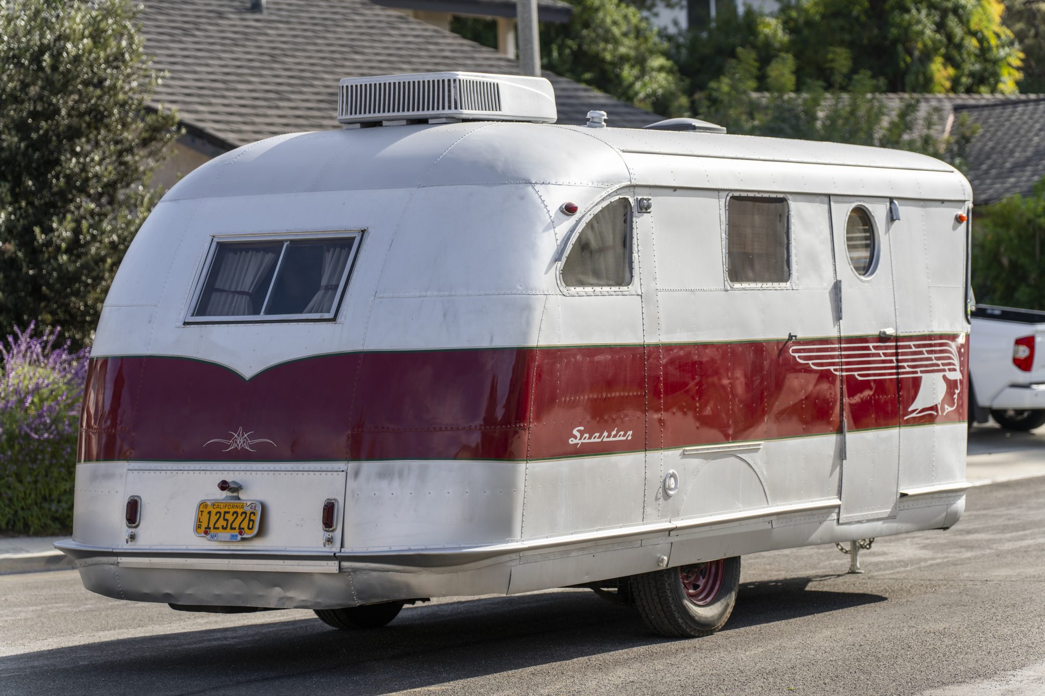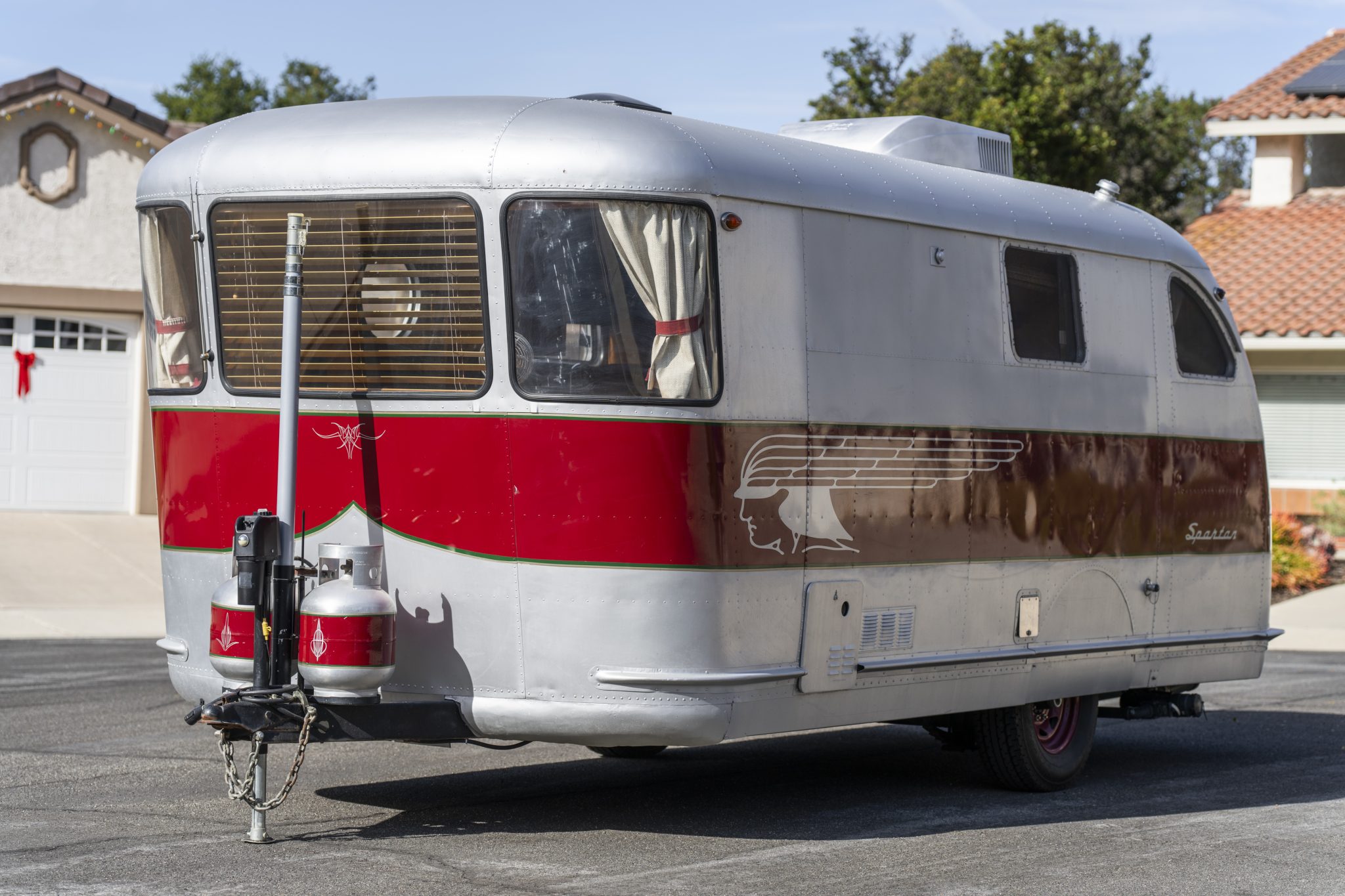 The single-axle chassis rolls on black-painted steel wheels wearing Maxmiler GT tires. Stopping power is provided by electrically actuated drum brakes. The frame is said to have been shortened during the refurbishment, and the chassis is equipped with a power-operated tongue jack. Infrastructure equipment includes a freshwater tank and pump, gray water and black tanks, two tongue-mounted propane tanks, a house battery, and shore connections for water, waste disposal, and 30-amp electrical service.