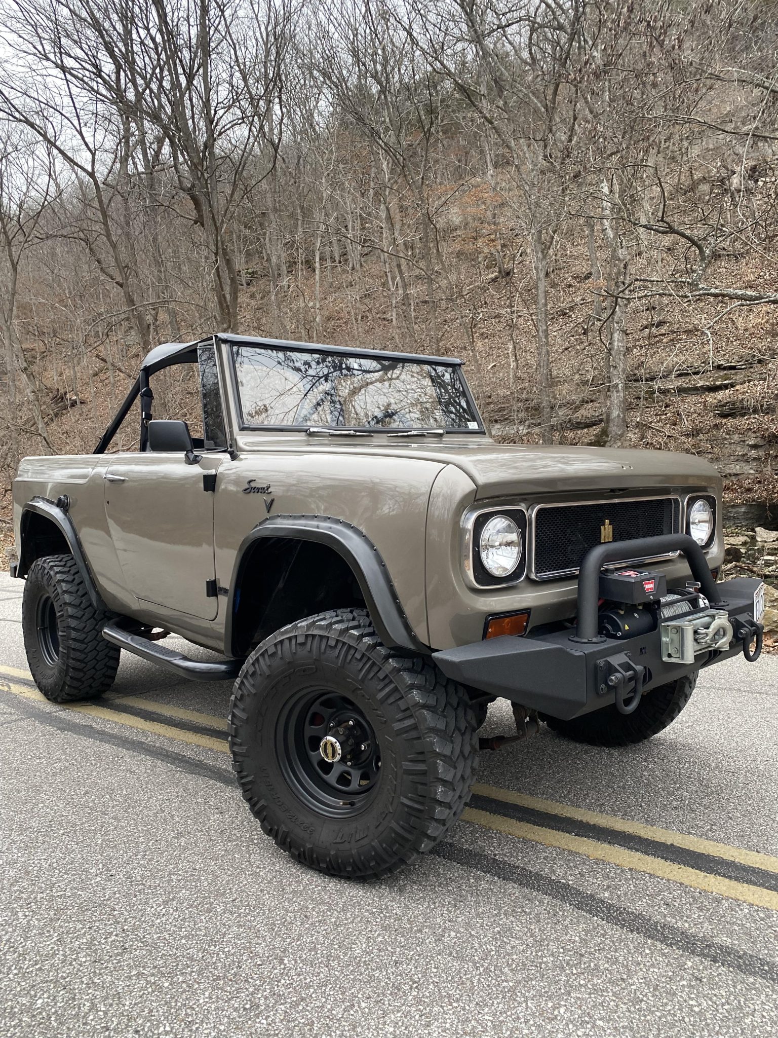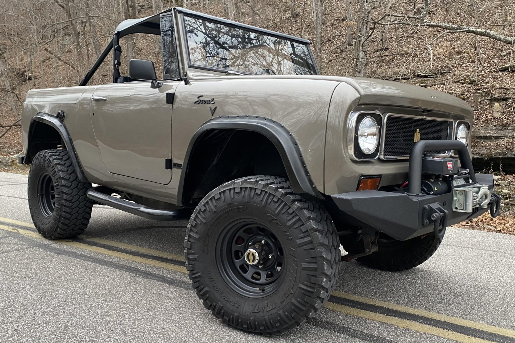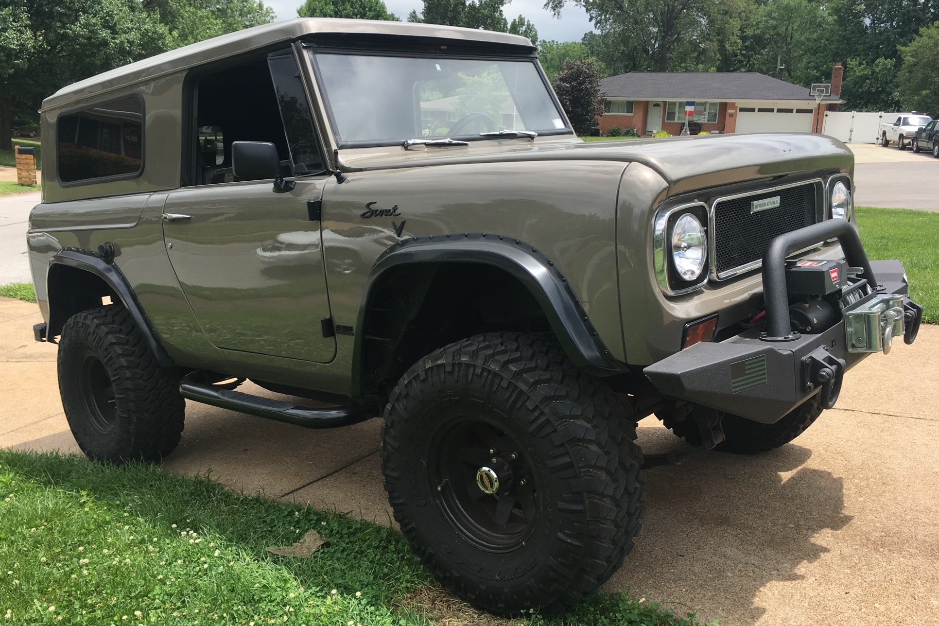 Black 15″ steel wheels are mounted with 33×12.5″ Nitto Trail Grappler M/T tires, and the truck features Warn manually locking front hubs and a 3″ lift kit with Pro Comp shocks. Stopping power is provided by unassisted front discs and rear drums.