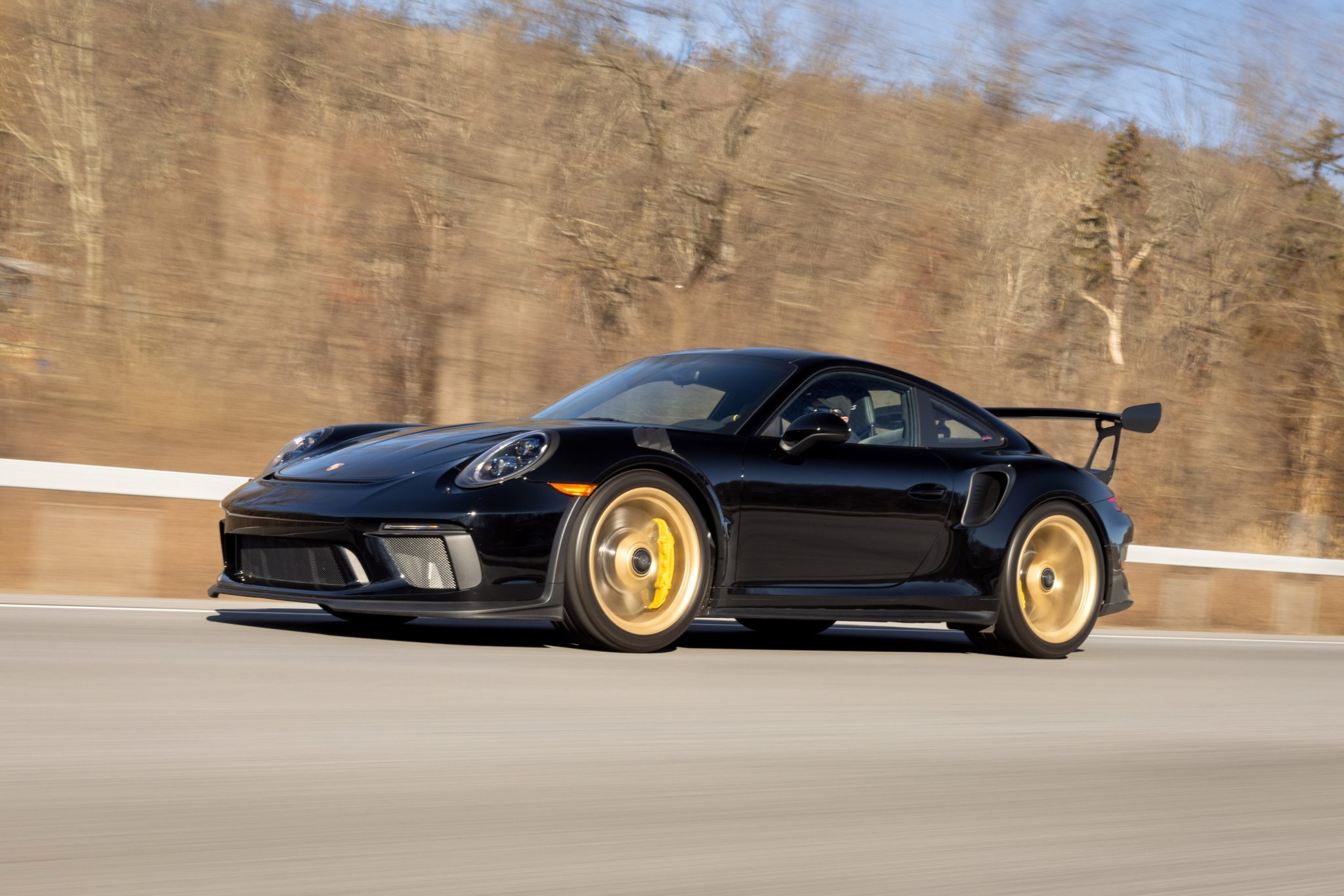 Gold-finished 20″ and 21″ center-lock alloy wheels are mounted with 265/35 front and 325/30 rear Michelin Pilot Sport Cup 2 tires showing 2018 date codes. Braking is handled by yellow Porsche-branded calipers over ceramic-composite rotors, and the car is equipped with a front-axle lift system. Standard GT3 RS equipment included rear-axle steering, Porsche Active Suspension Management, and Porsche Torque Vectoring Plus.