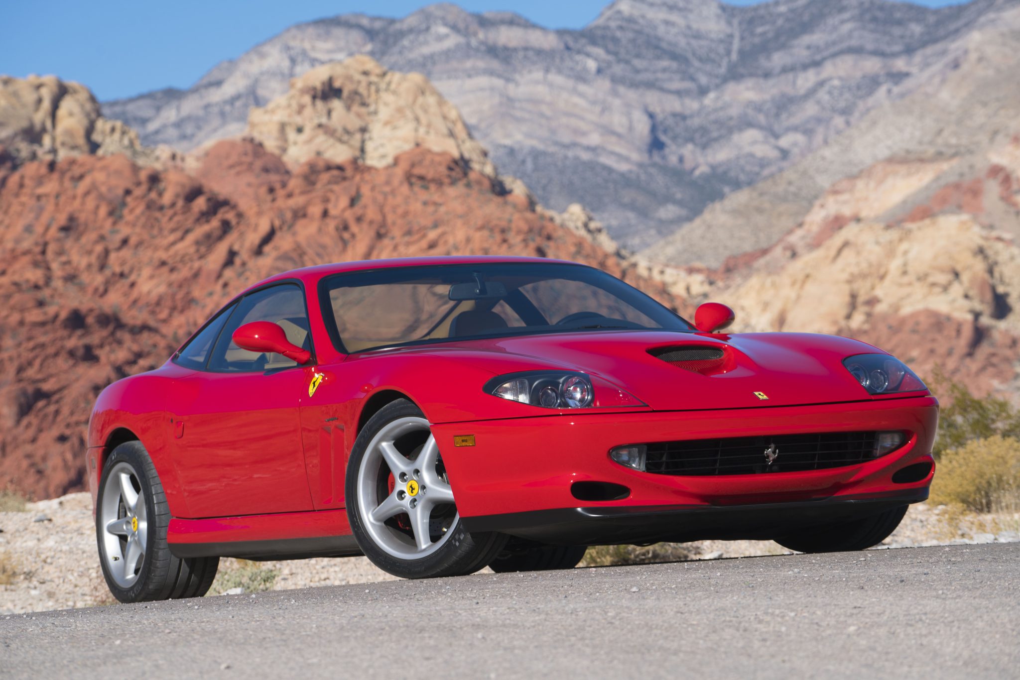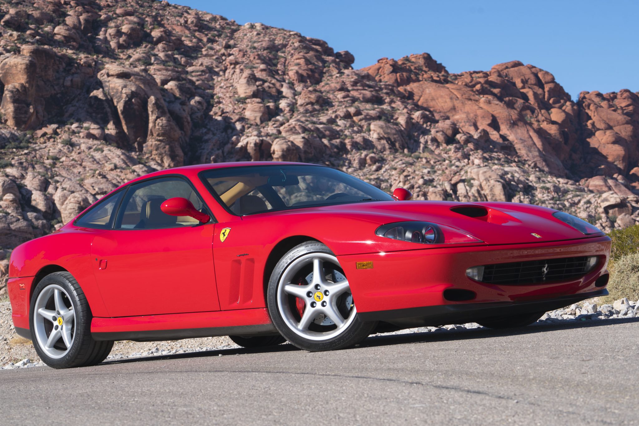 The 18″ five-spoke alloy wheels are mounted with Michelin Pilot Super Sport tires, and the left-front wheel shows an imperfection. Braking is handled by red-finished Ferrari-branded calipers over cross-drilled and ventilated rotors at all four corners.