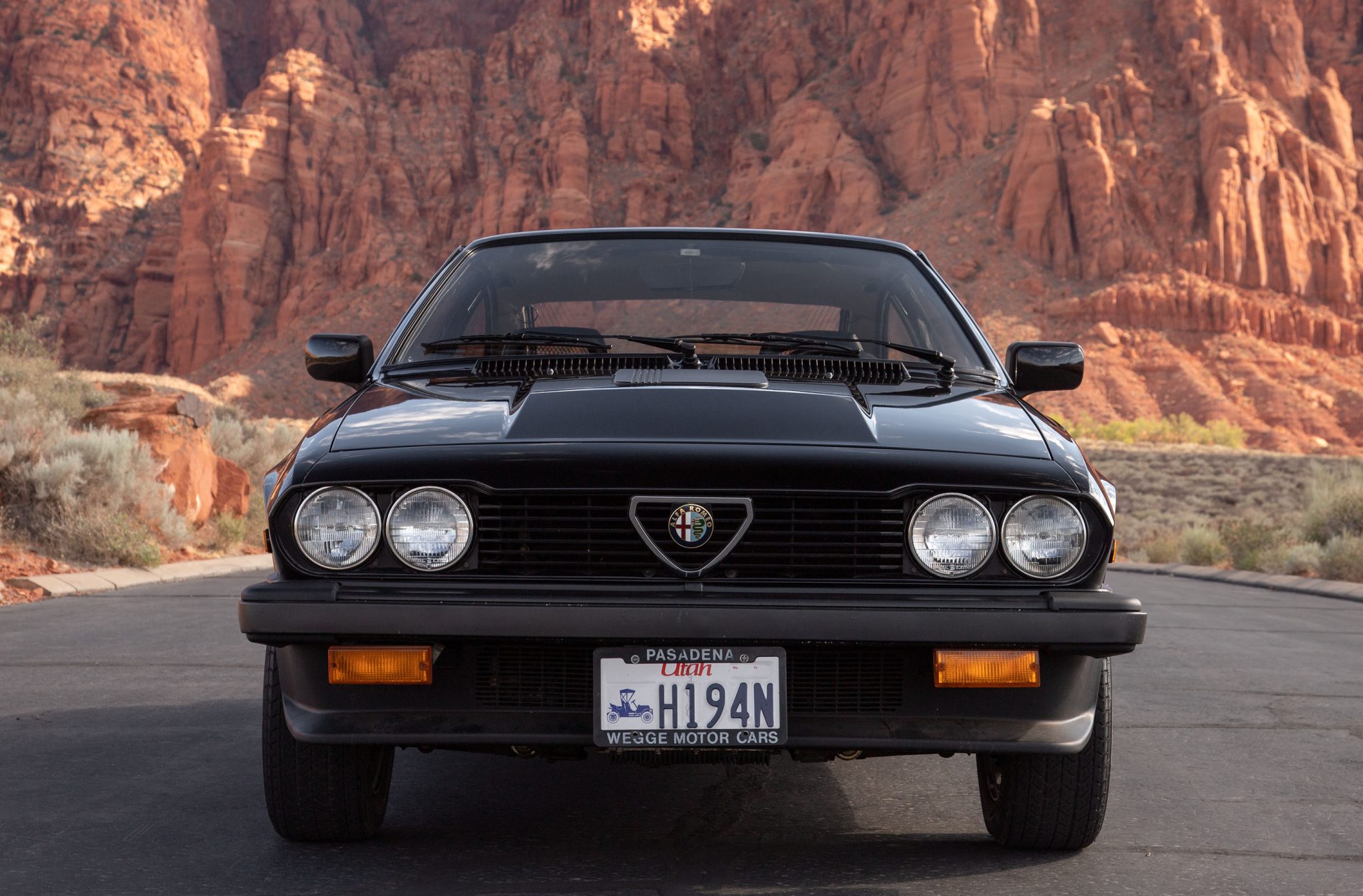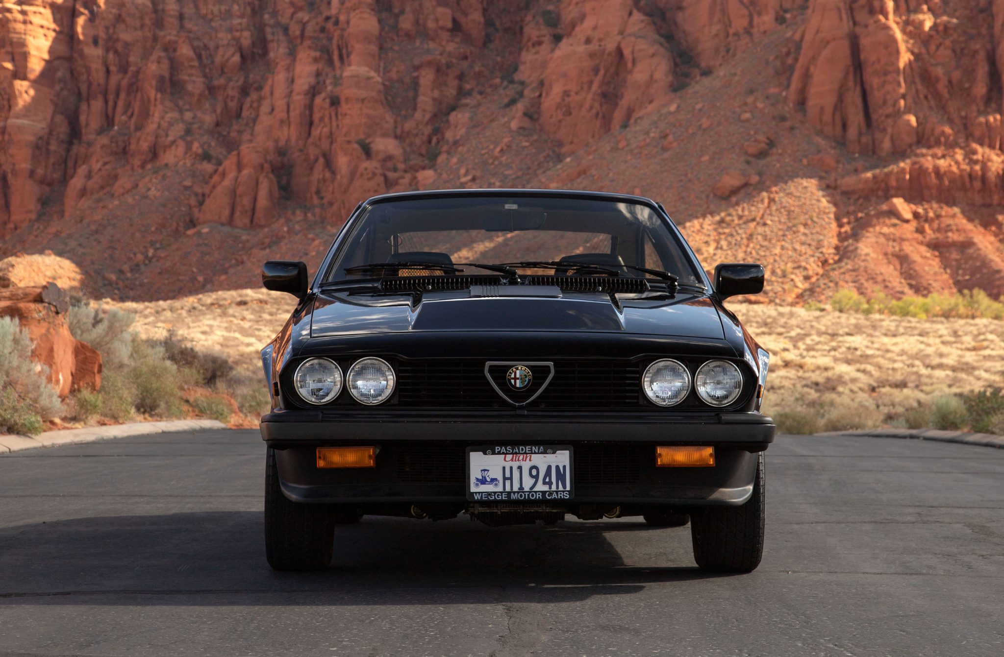 Speedline 15″ alloy wheels are mounted with 195/60 Pirelli P6 Cinturato tires, and a matching spare is secured below the trunk floor. The suspension includes upper and lower A-arms up front, a de Dion axle and a Watts linkage at the rear, and a stabilizer bar at each end. Braking is provided by power-assisted four-wheel discs, the rears of which are inboard units.
