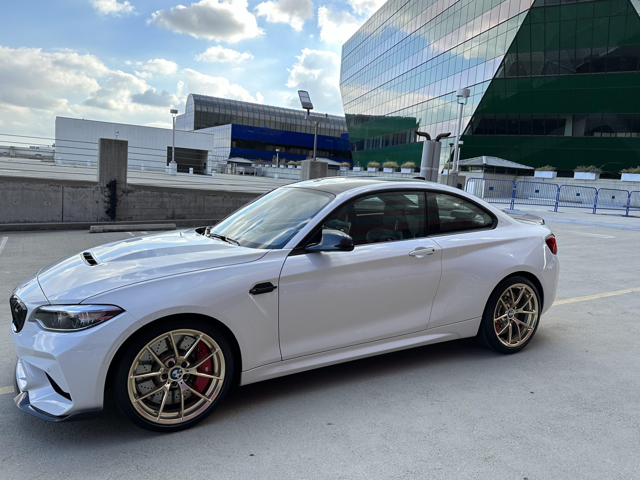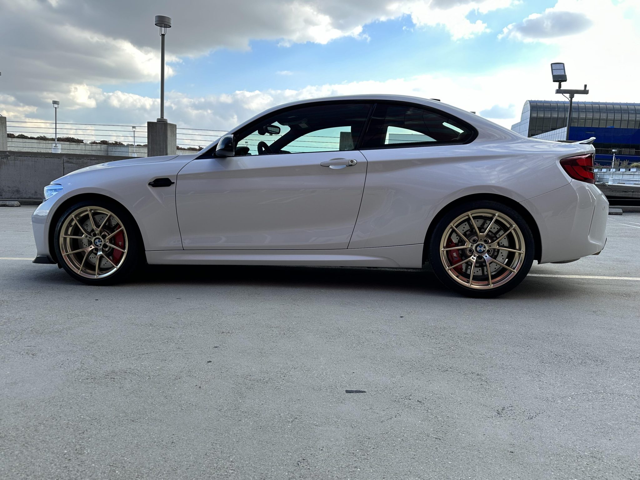 Gold-finished 19″ Style 763M alloy wheels wear 245/35 front and 265/35 rear Michelin Pilot Super Sport tires that were mounted in December 2022. The car is equipped with an adaptive M suspension that includes variable damper settings, and braking is handled by red M-logo six-piston front and four-piston rear calipers mounted over cross-drilled rotors. A brake fluid flush was performed in December 2023.
