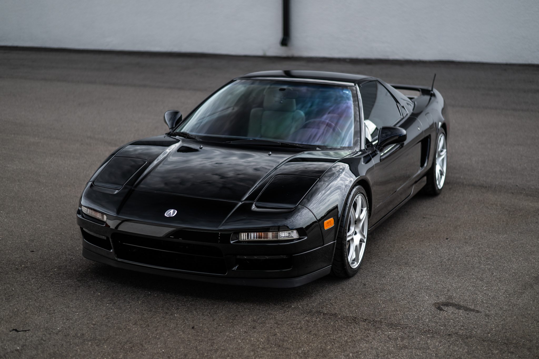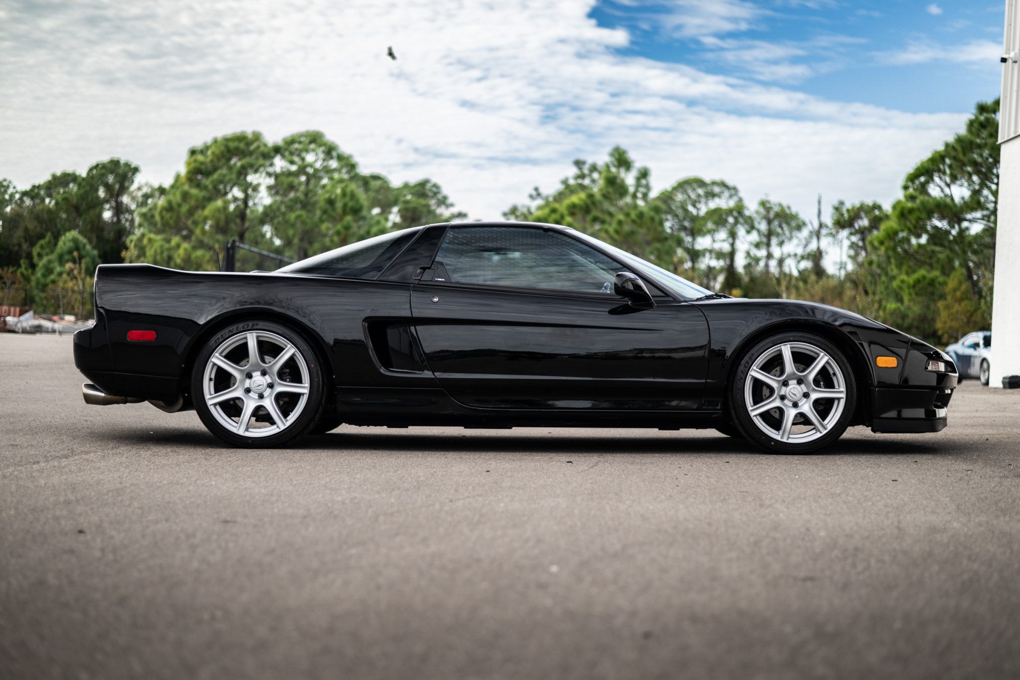 The 17″ and 18″ Science of Speed 2002-style forged wheels are mounted with 215/40 front and 255/35 rear Dunlop Direzza tires. The car features a four-wheel double-wishbone suspension with front and rear stabilizer bars, and braking is handled by NSX-branded calipers over drilled Brembo rotors at each corner. The ABS was revised using components sourced from a Honda S2000, per the seller, who notes that Comptech and Koni suspension components have been added in addition to an NSX Type-R front stabilizer bar. The steering rack is said to have been replaced in March 2023.