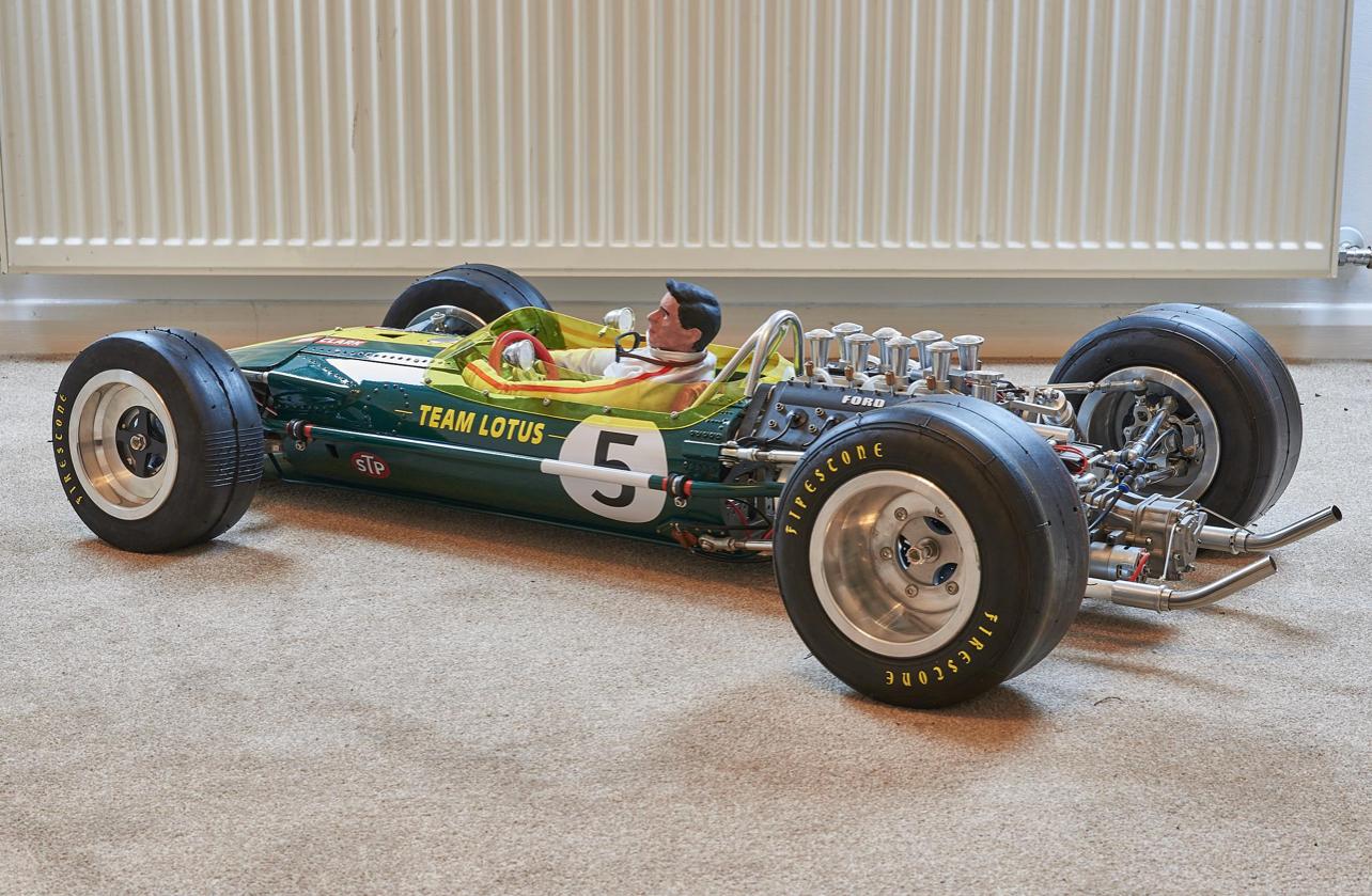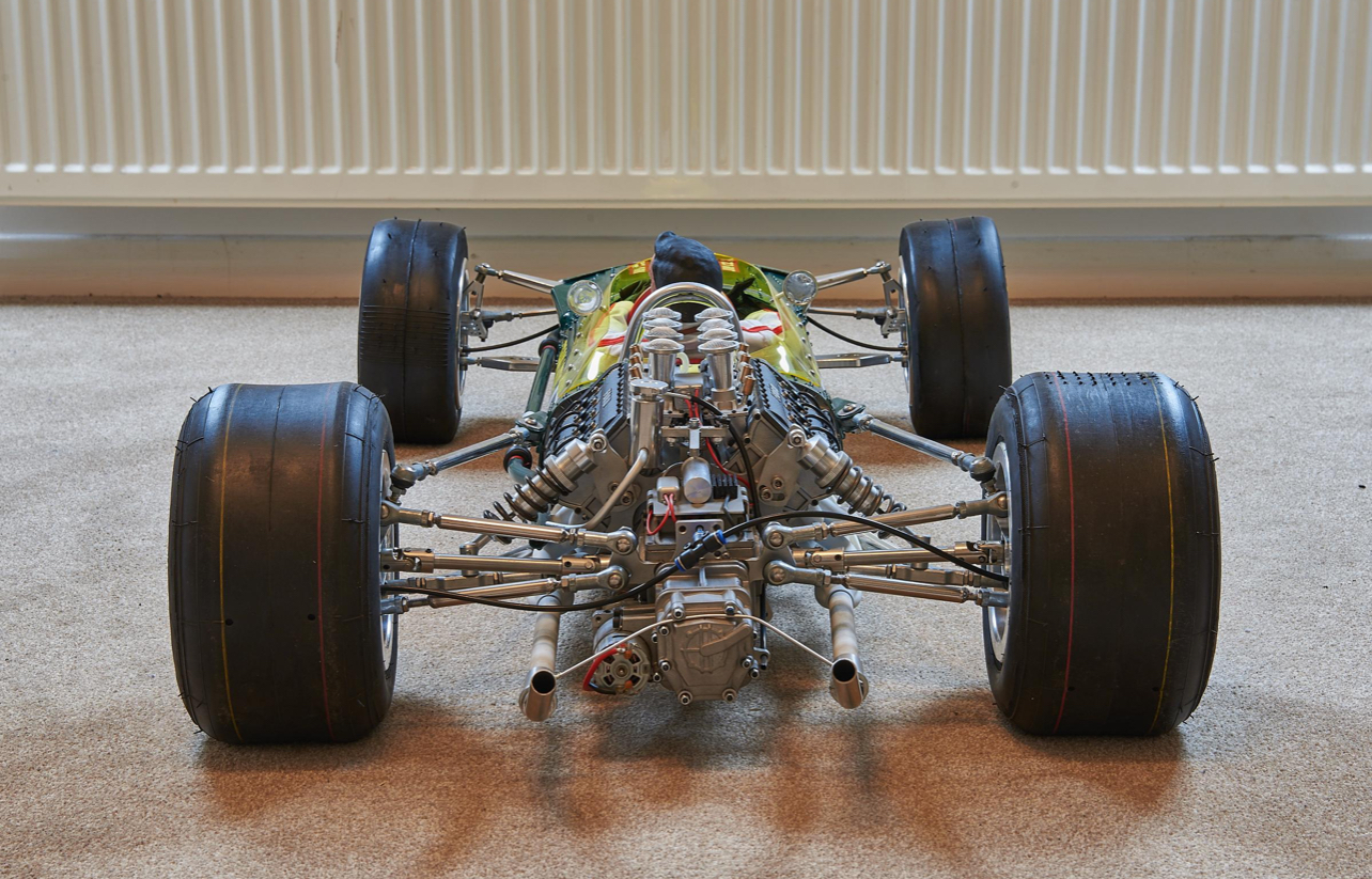 Center-lock wheels are secured via hexagonal nuts and wrapped in staggered-width Firestone-branded tires. The car rides on a fully independent suspension with coilovers at each corner and servo-assisted steering. Stopping power is provided by four-wheel disc brakes.