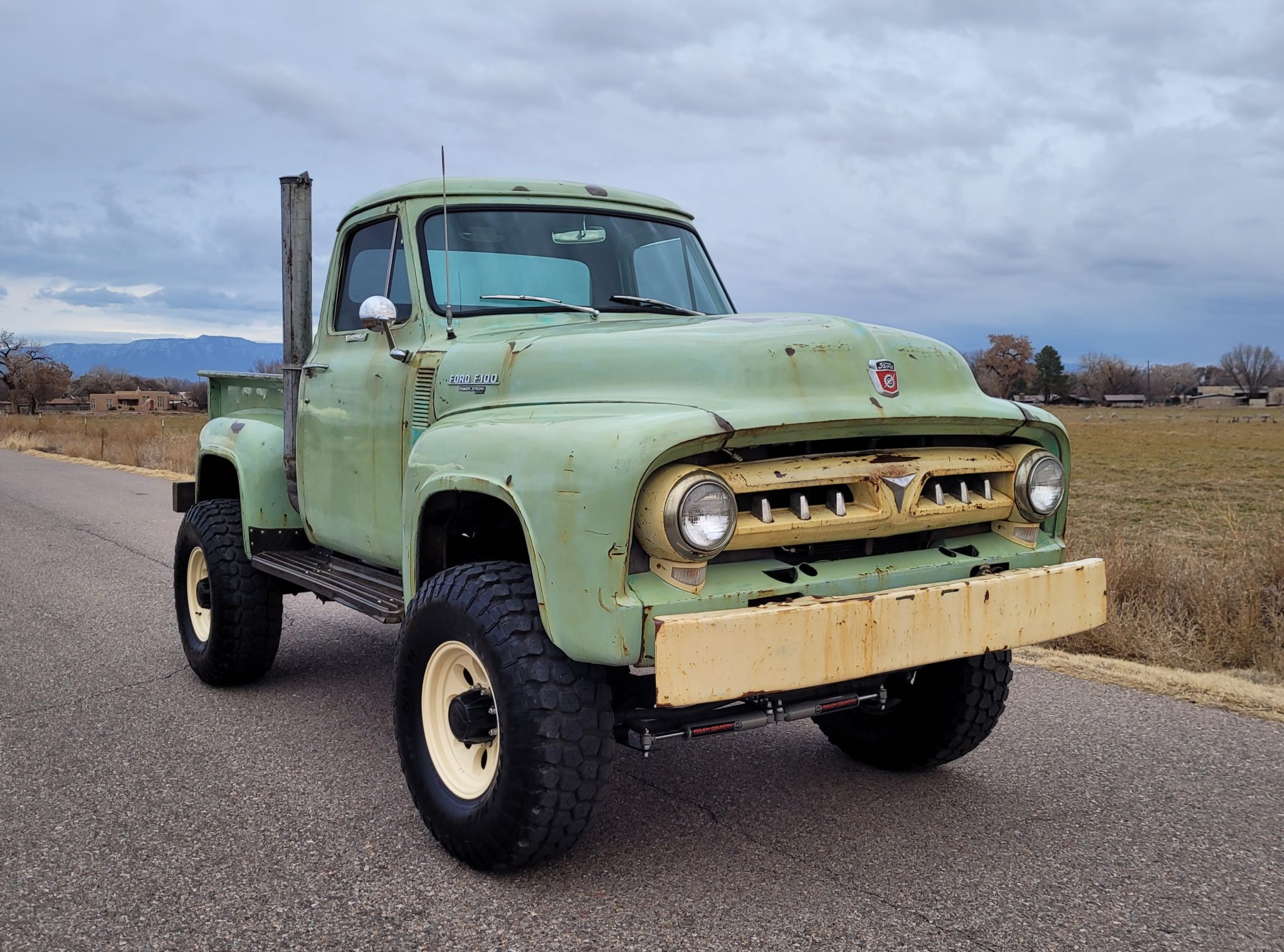 Ion Alloy 17″ wheels were painted beige and fitted with 37×12.5″ Ironman All Country tires. The seller reports that the leaf spring mounting brackets and shock towers were relocated, a custom track bar mount was fitted, and areas of the frame were reinforced. The truck has also been modified with four-wheel disc brakes, Ford F-250-sourced axles, a body lift, a 2″ Rough Country suspension lift, an adjustable track bar, and a Rough Country double-shock steering stabilizer system. The driveshaft U-joints were replaced in 2023.