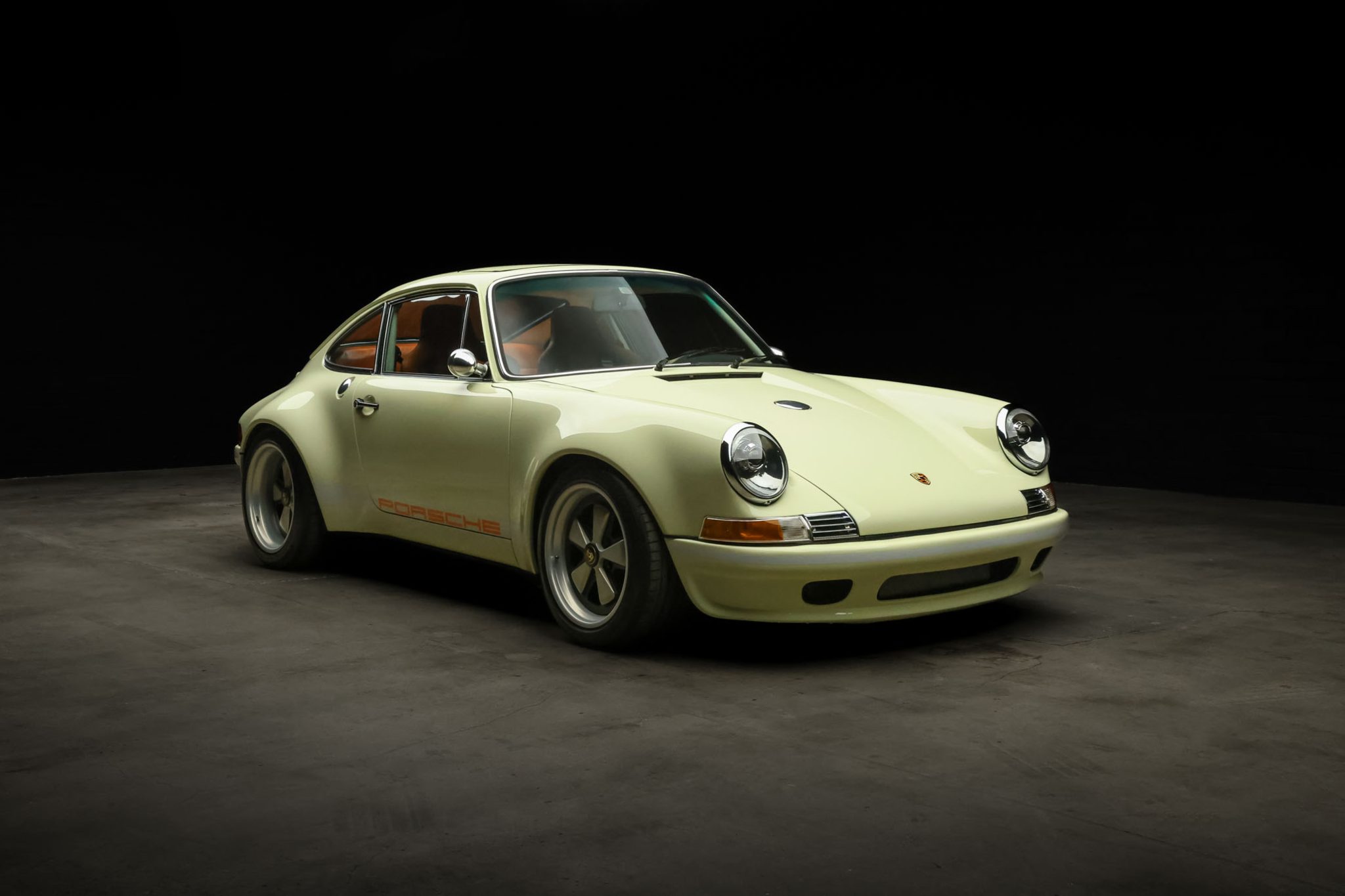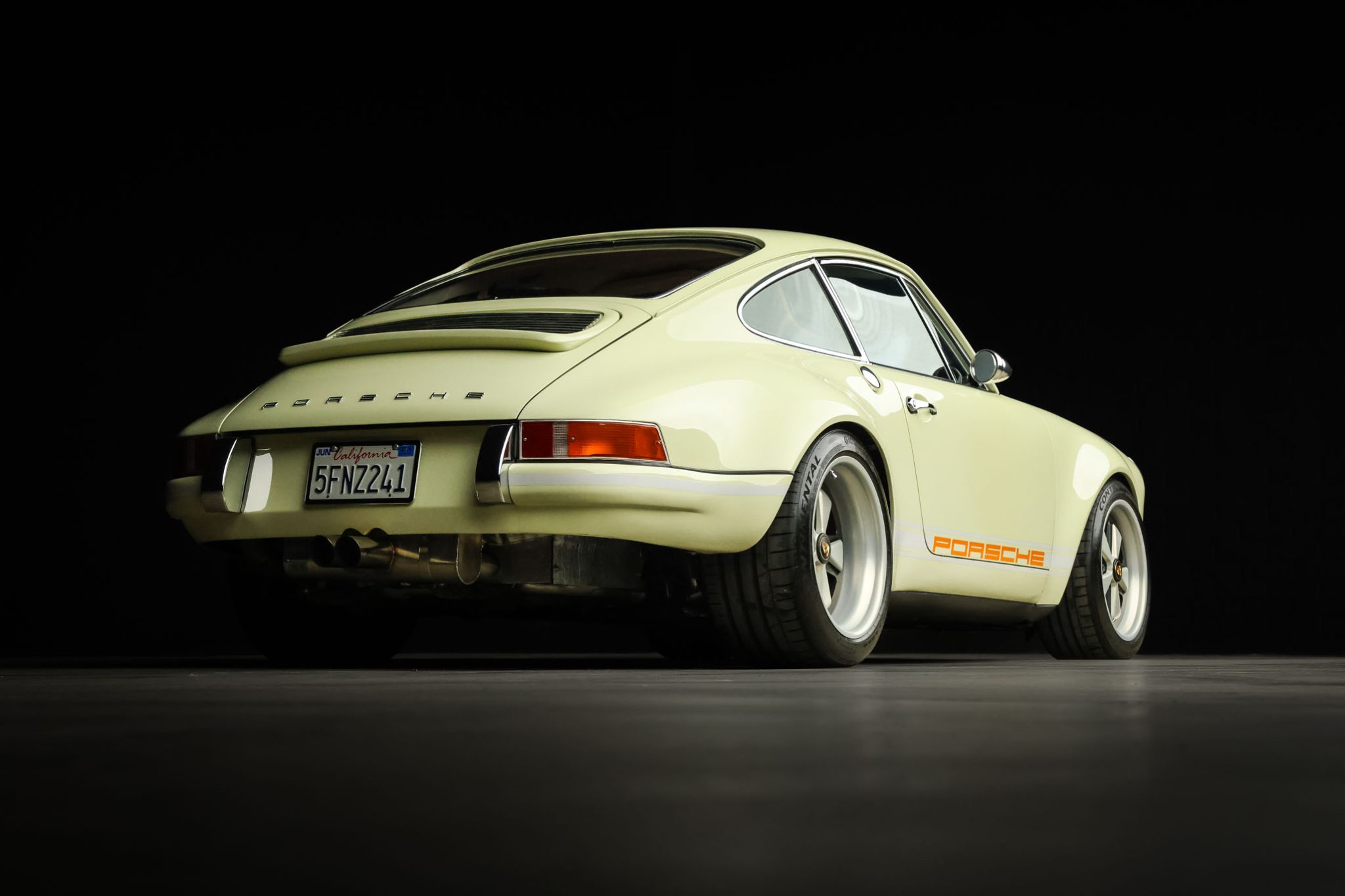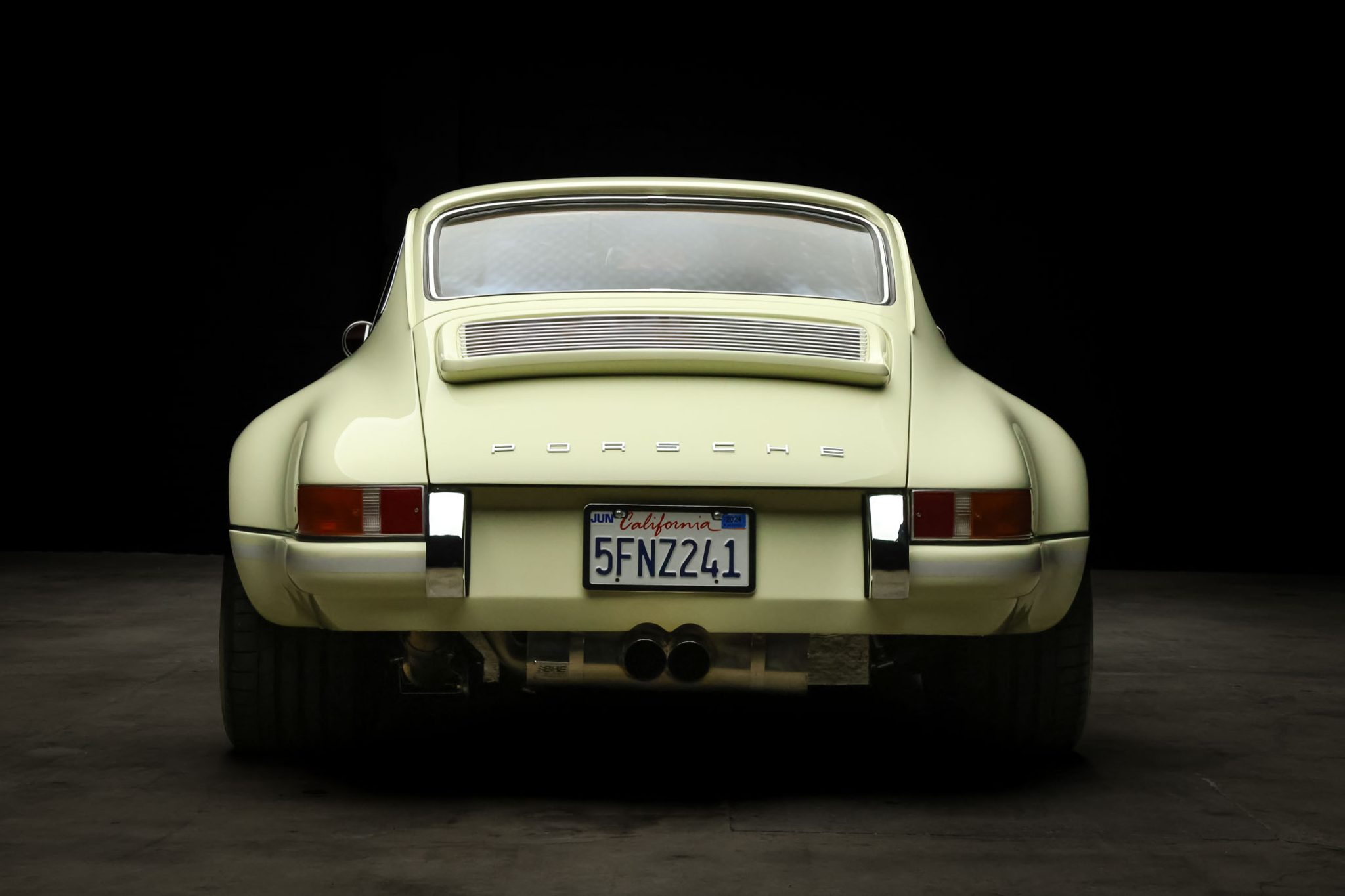 An external fuel filler cap is centered in the front trunk lid, and additional exterior details include a sunroof, projector-style headlights, bullet-style side mirrors, and an external oil filler cap on the right quarter panel. Chrome rear bumperettes, European-style taillights, and a speed-activated rear spoiler are additional features.