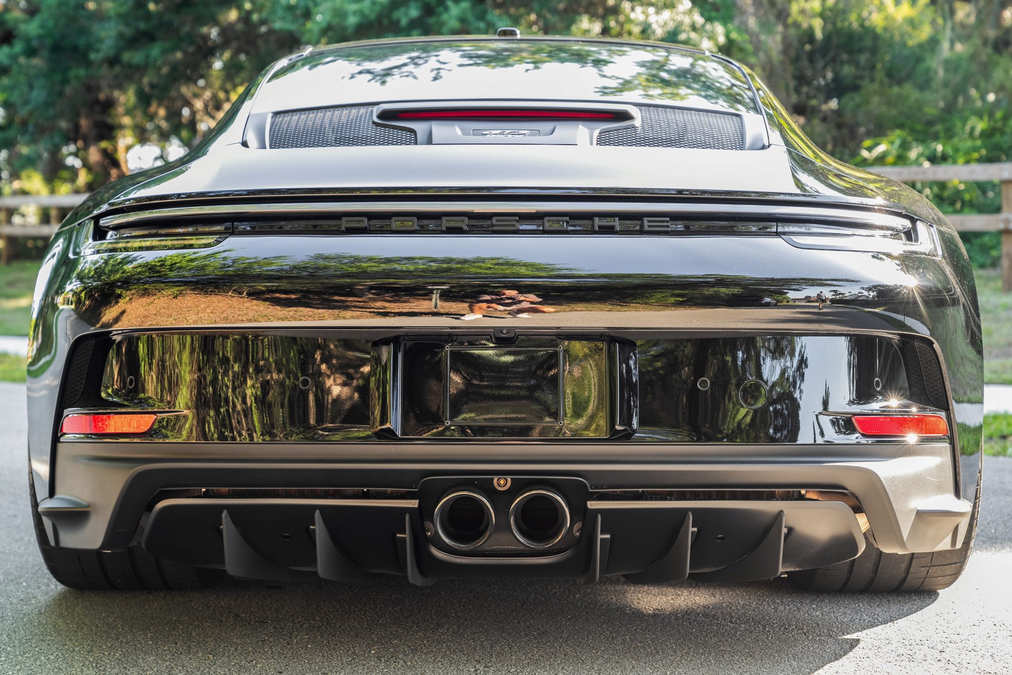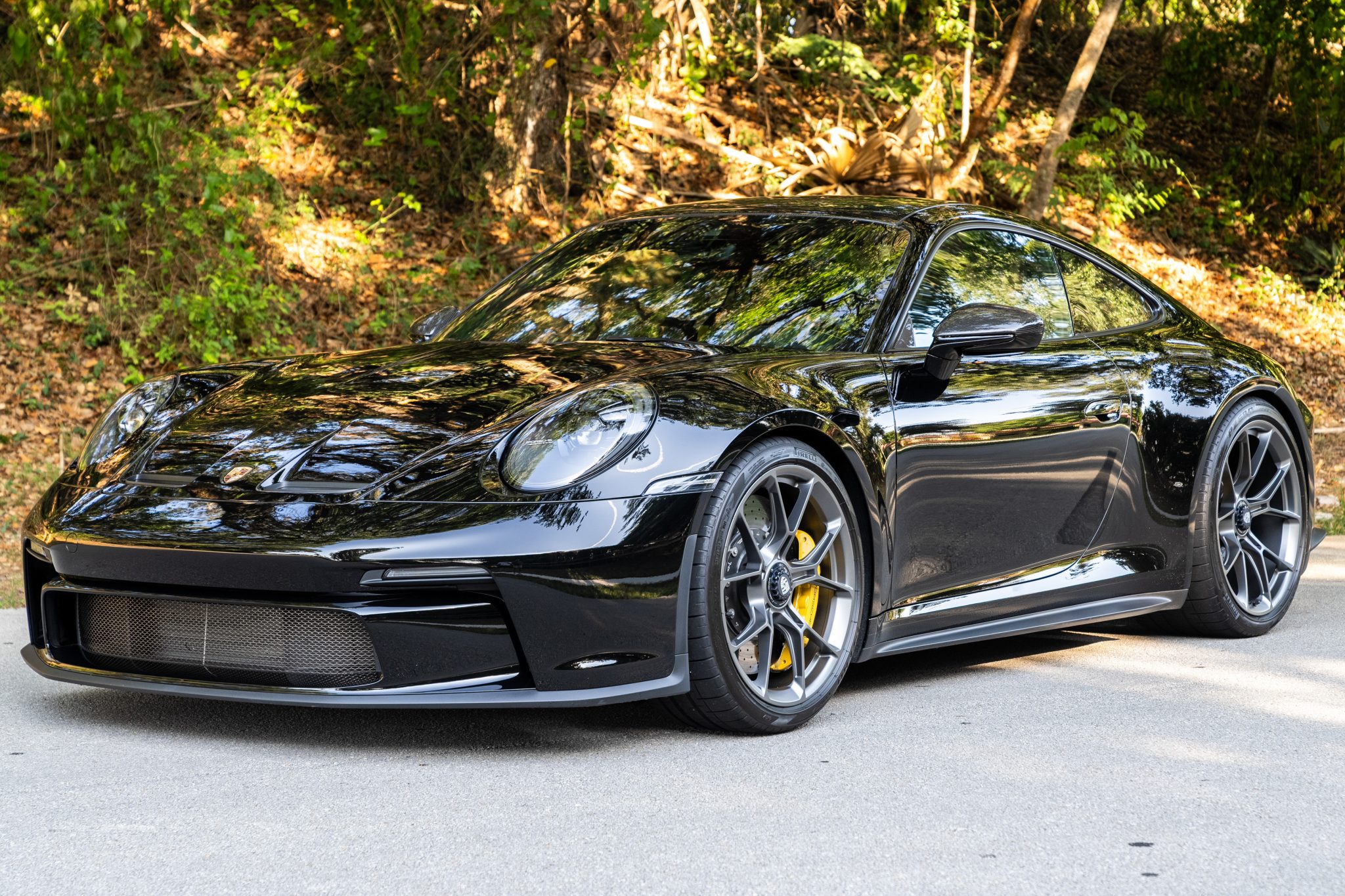 Satin Dark Silver-finished 20″ and 21″ GT3 center-lock wheels are mounted with 255/35 front and 315/30 rear Pirelli P Zero tires. Stopping power is provided by Porsche Ceramic Composite Brakes (PCCB) with yellow-finished calipers over cross-drilled and ventilated discs at each corner. The car is equipped with a front-axle lift system and rear-axle steering.