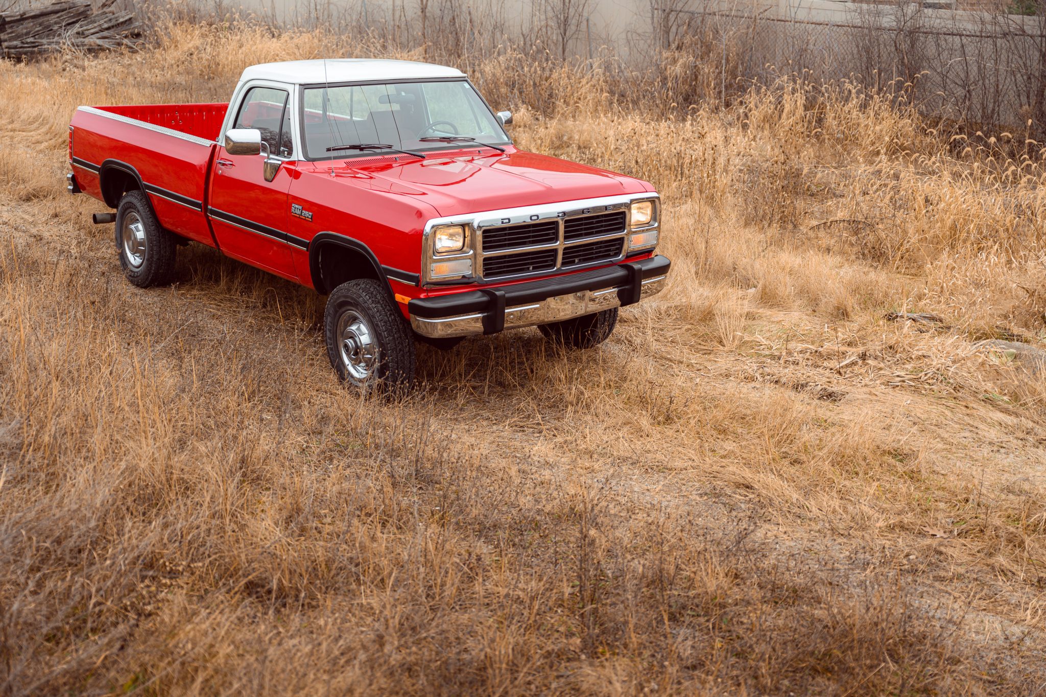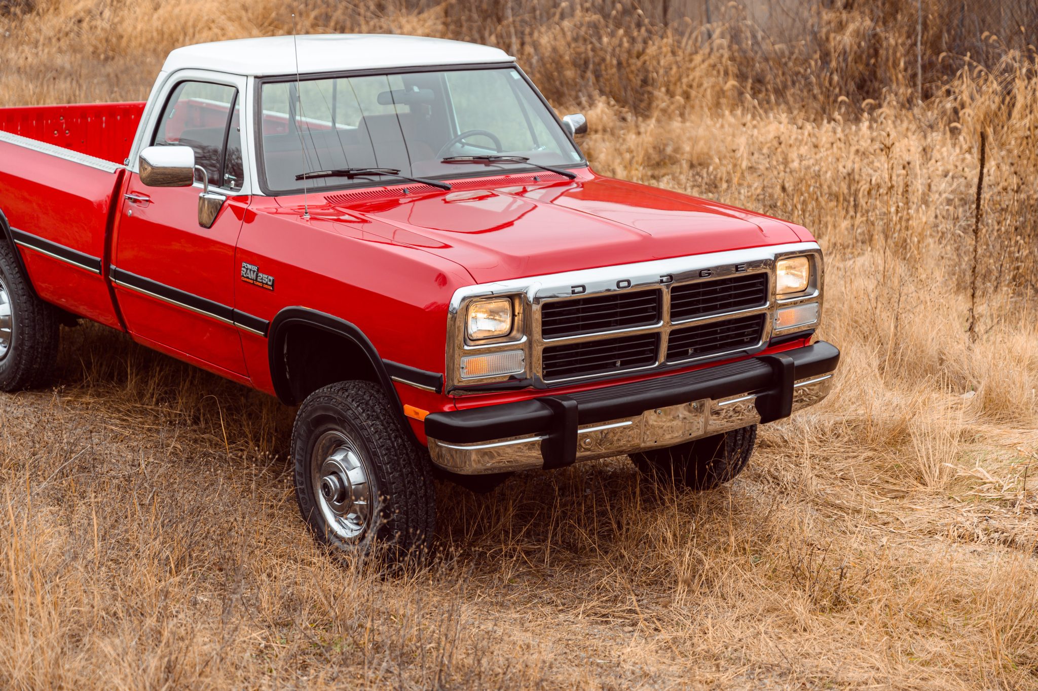 Steel 16″ wheels wear bright covers and are mounted with 235/85 Firestone Transforce AT2 tires, while a Michelin spare is stowed underneath. Braking is provided by power-assisted front discs and rear drums, and the truck is equipped with power steering as well as manually locking front hubs.