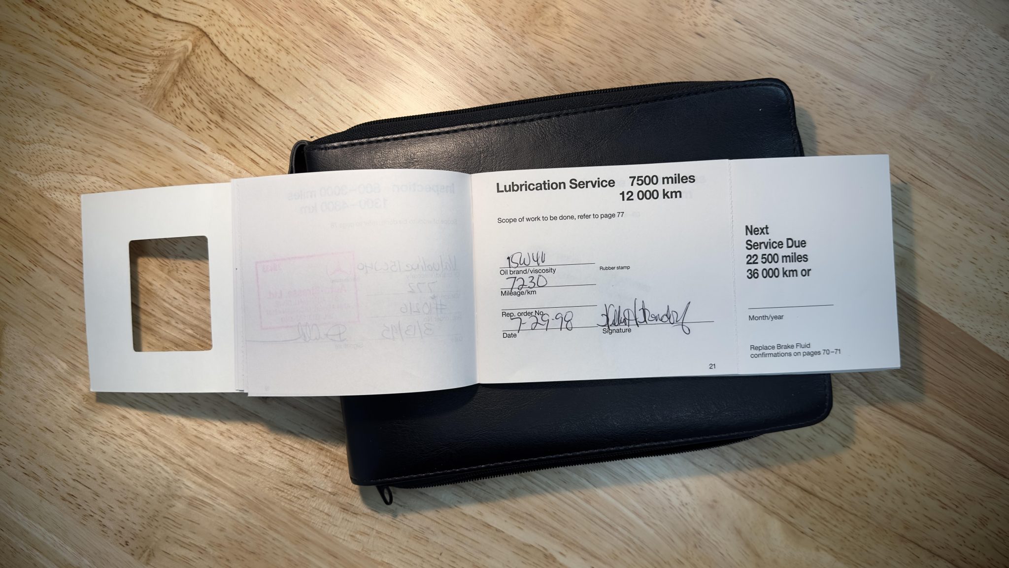 The 18” AMG Monoblock wheels show curb rash and are mounted with 245/40 Michelin Pilot Sport All Season 4 tires that display 2021 date codes. The car is equipped with Automatic Slip Control (ASR) as well as a self-leveling rear suspension. The E500 featured a wider track and lower ride height when compared with other W124 models, and it shared its front disc brakes with the contemporary R129 SL. The power steering pump gaskets are said to have been changed in September 2021.