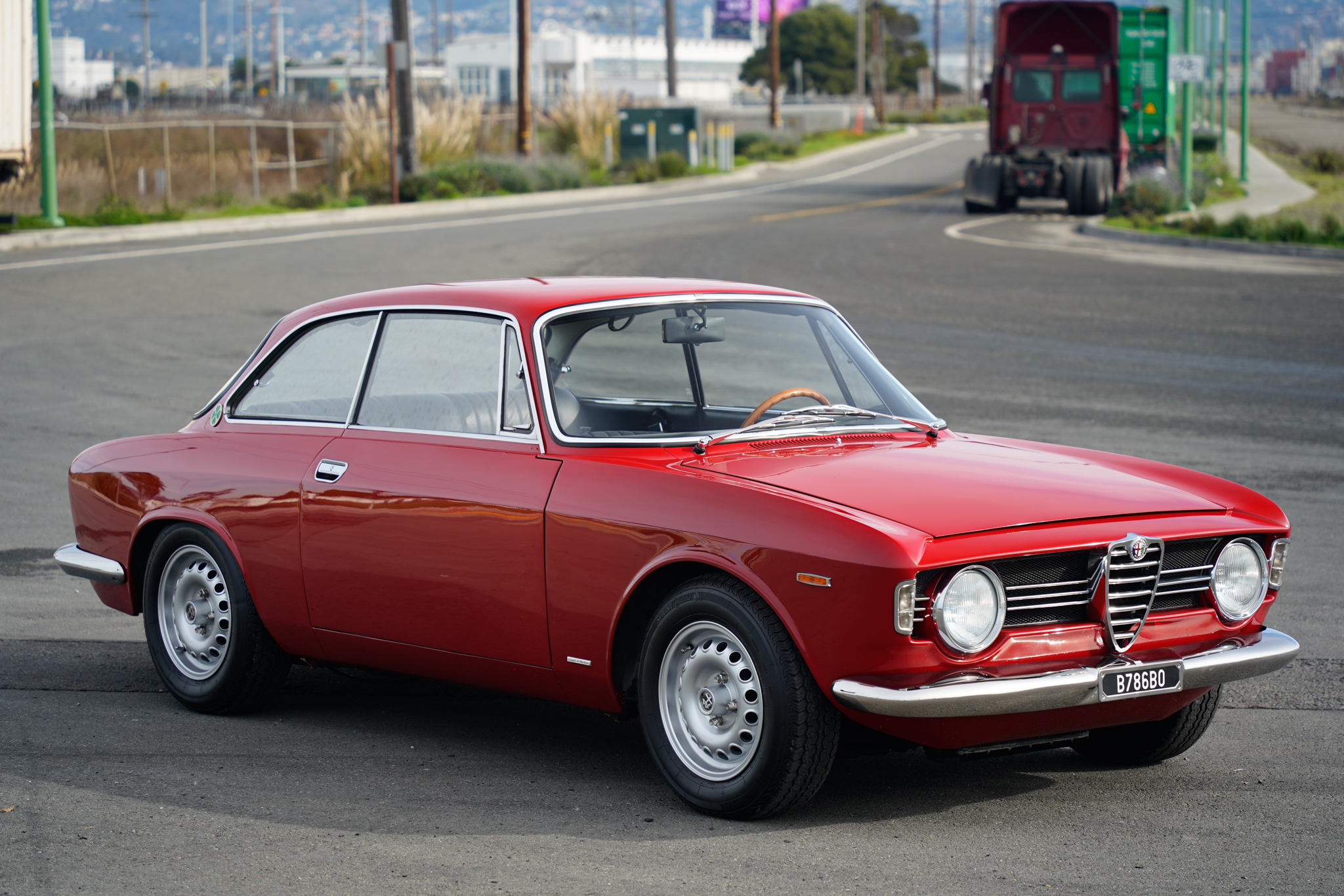 Reproduction GTA-style 14” alloy wheels are finished in silver and were mounted with 185/70 Vredestein Sprint Classic tires in 2023. Work performed at Alfa Performance Connection of Orange, California in August 2023 included installing an Alfaholics suspension kit and Wilwood front brake calipers as well as replacing the brake rotors, pads, front sway bar, spindles, hubs, and springs.