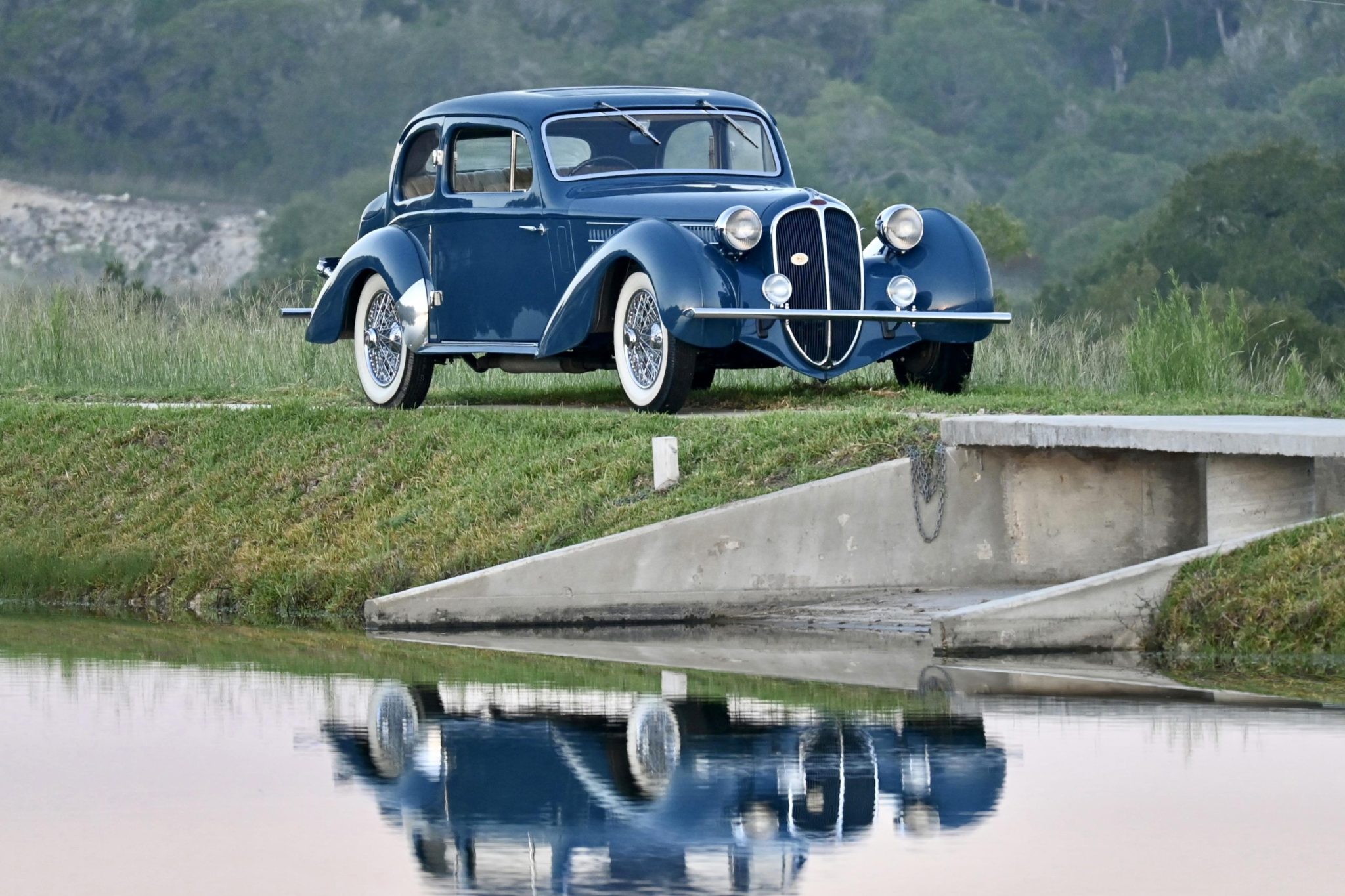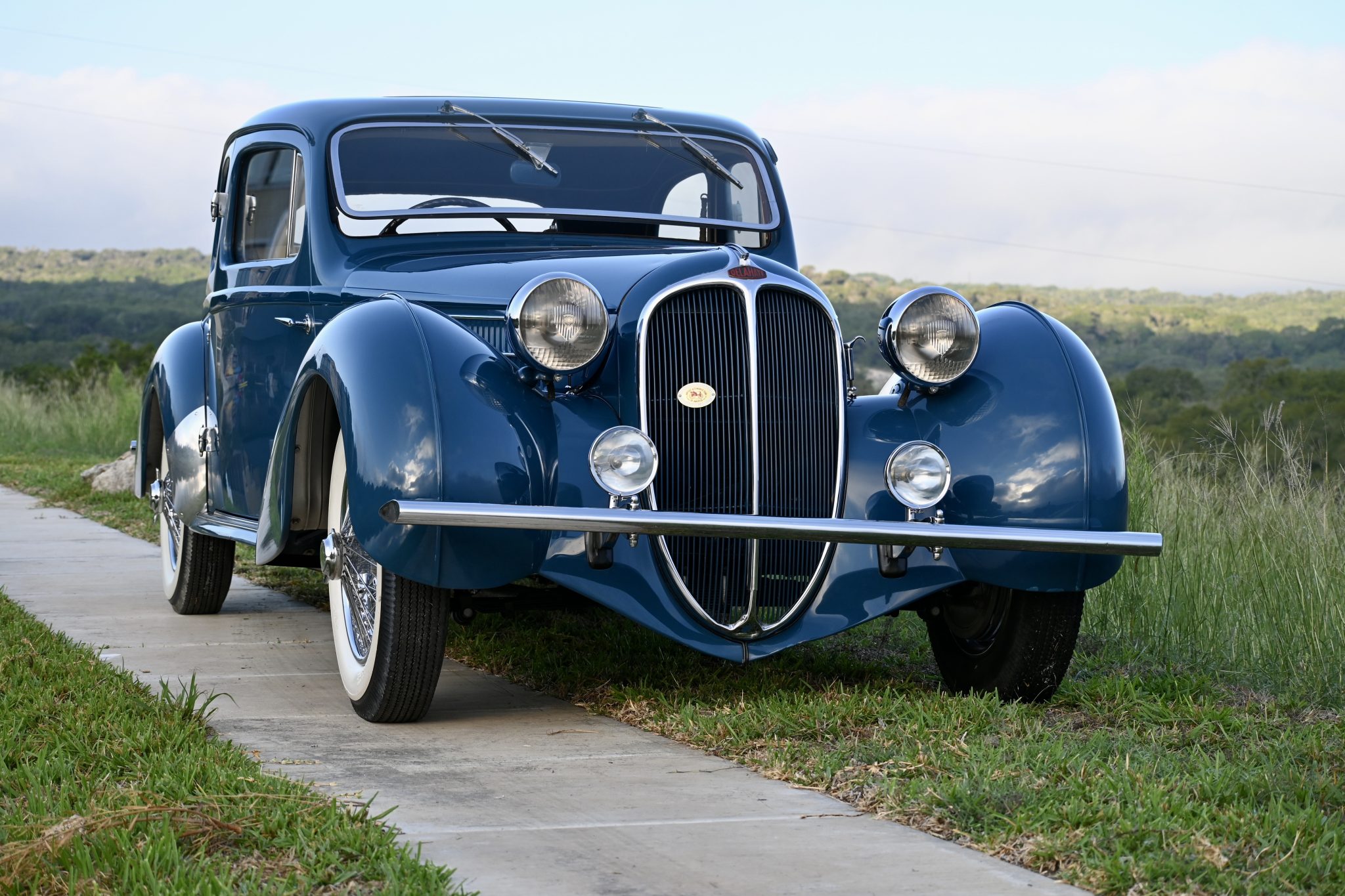 This example’s Alphonse Guilloré fixed-roof coupe coachwork is finished in blue, and various imperfections are noted in the finish. Features include rear-hinged doors, a louvered hood, rear quarter windows, an integrated rear trunk, a manually operated sunroof, Marchal headlights, front fog lamps, and a tilt-out windshield. A 1985 AACA Senior First Prize badge is affixed to the grille.
