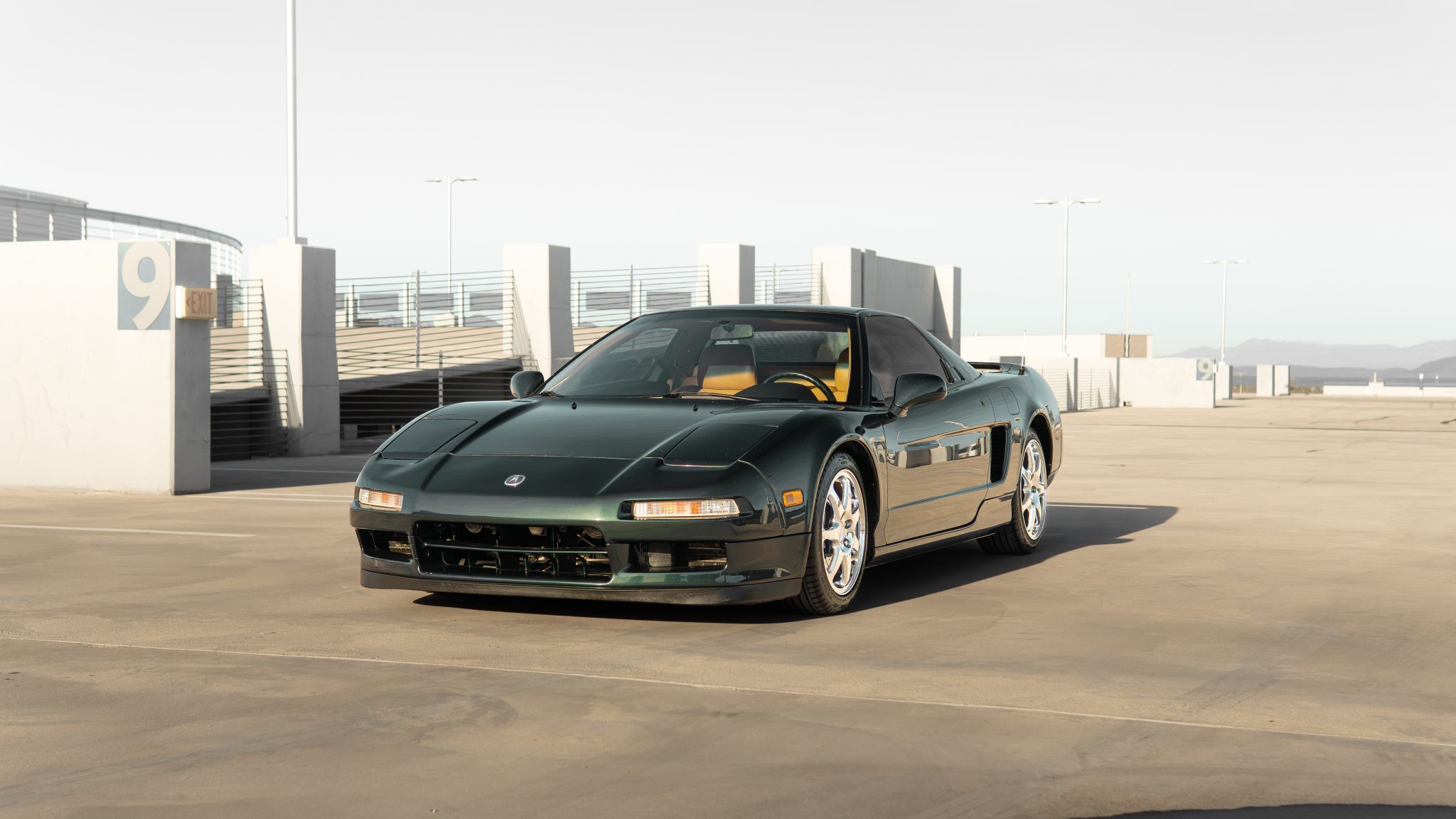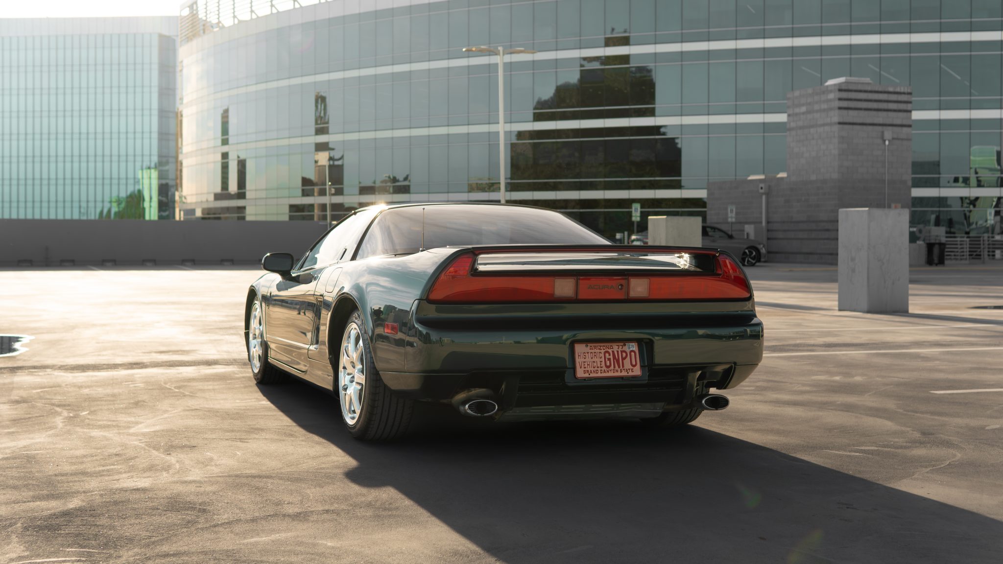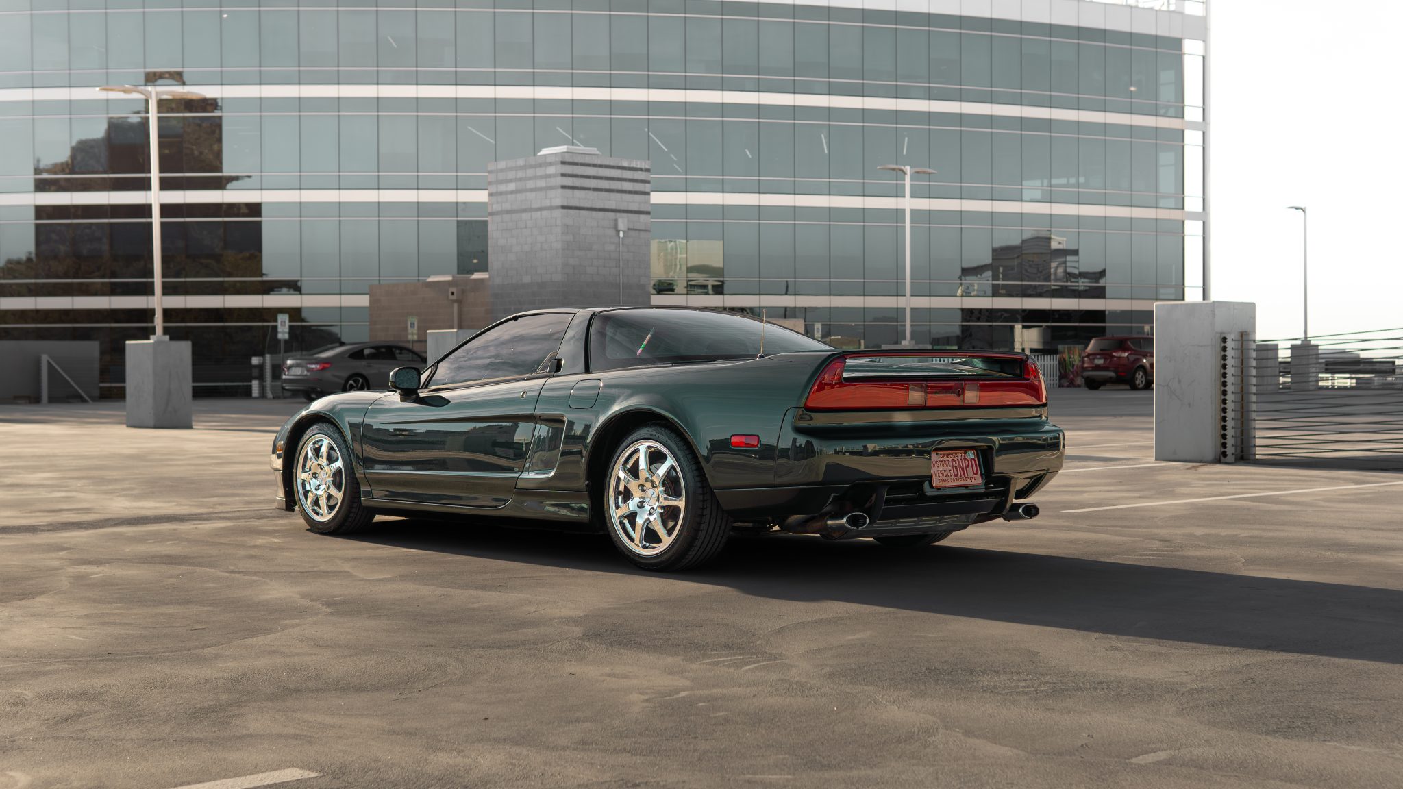 Staggered-diameter 16” and 17” seven-spoke aluminum wheels are mounted with 215/45 front and 245/40 rear Accelera tires showing 2023 date codes. Braking is handled by NSX-branded calipers over cross-drilled rotors at each corner, and the car is equipped with BC Racing coilovers, Zanardi-style sway bars, a carbon-fiber rear brace, and front compliance clamps. Replacement rear brake pads were fitted in November 2023.