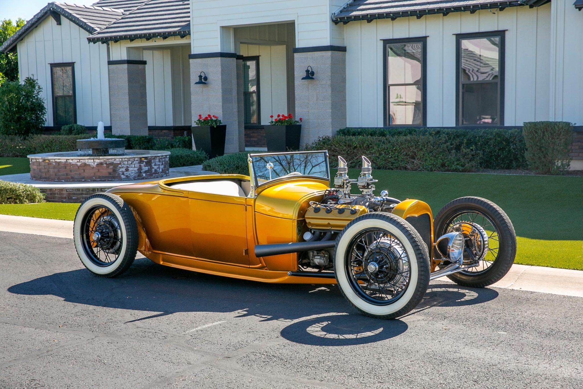 The car is equipped with Model A-style 21″ wire wheels, 4.40/4.50 Firestone gum-dipped whitewall bias-ply tires, and a dropped axle with a transverse leaf spring as well as a Flaming River steering box with a hoop-style steering arm.