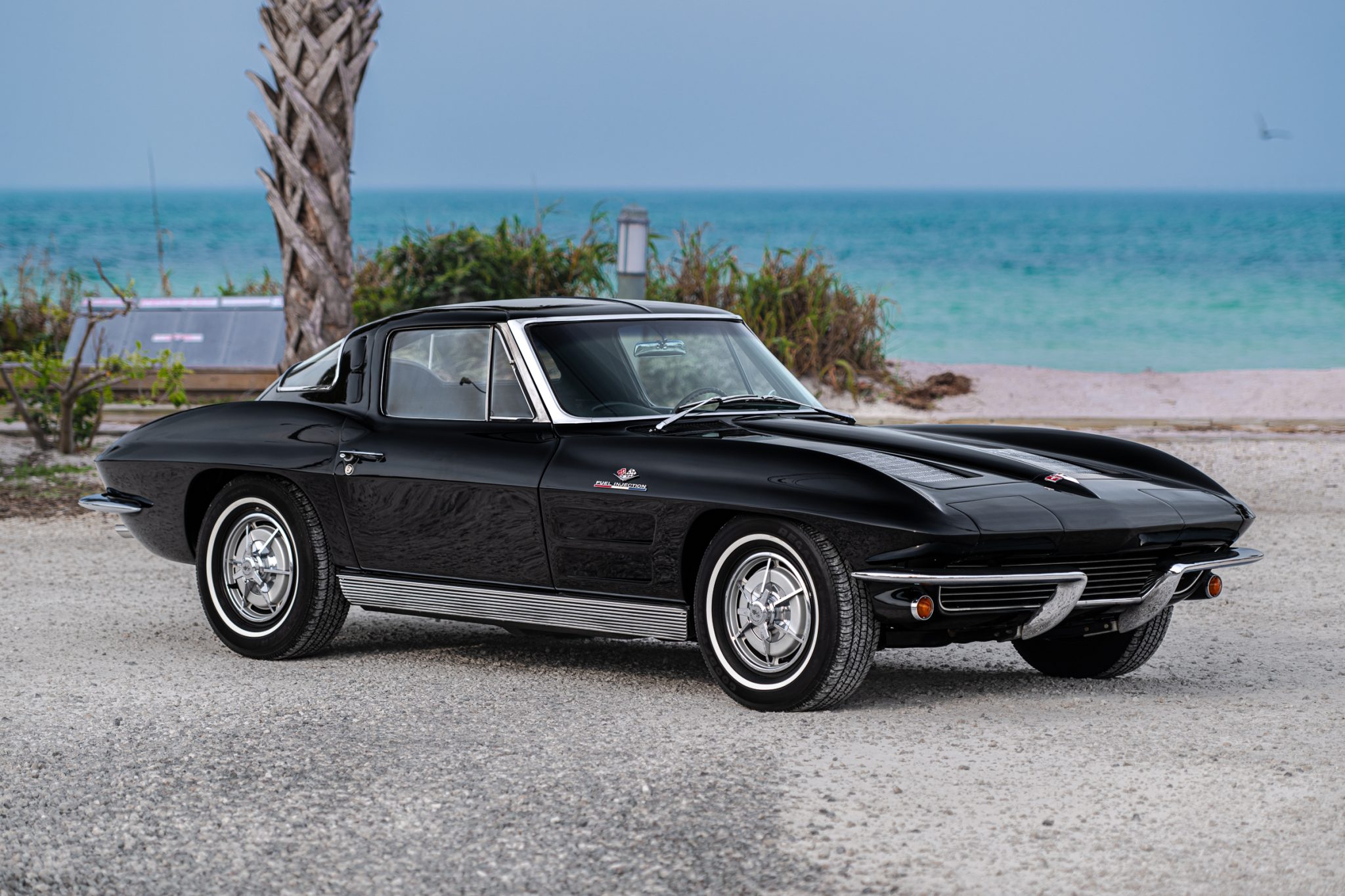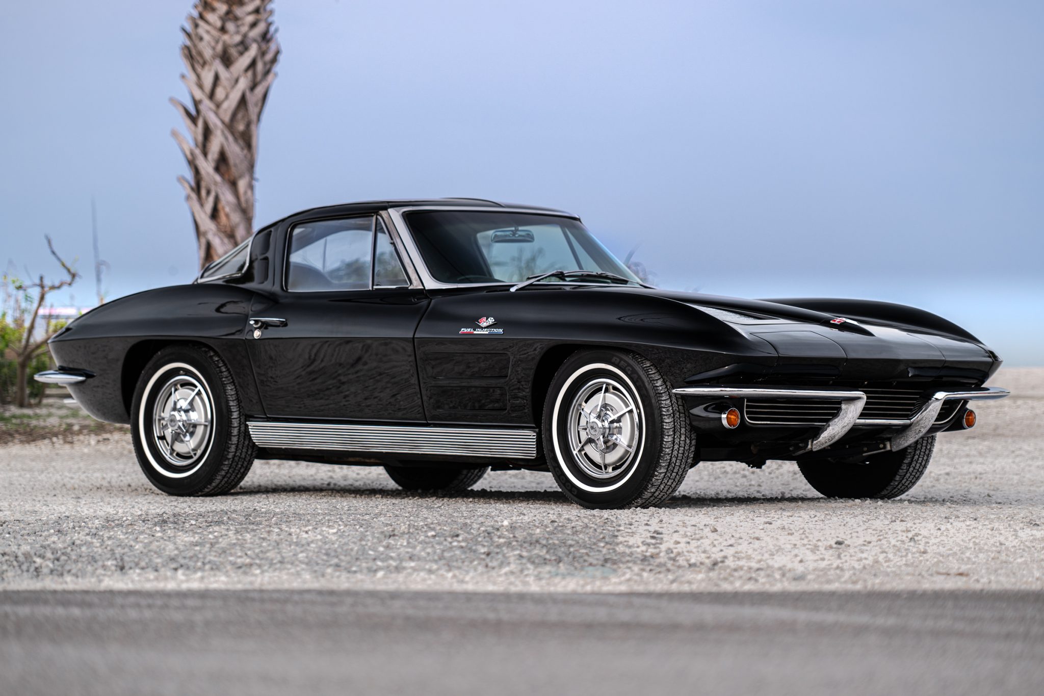 The 15″ steel wheels wear knock-off-style covers and are mounted with Goodyear Regatta Touring white-stripe tires measuring 215/70. The C2 was the first Corvette to offer fully independent suspension, with upper and lower control arms at the front and a three-link setup with a transverse leaf spring at the rear. Braking is handled by front discs and rear drums.
