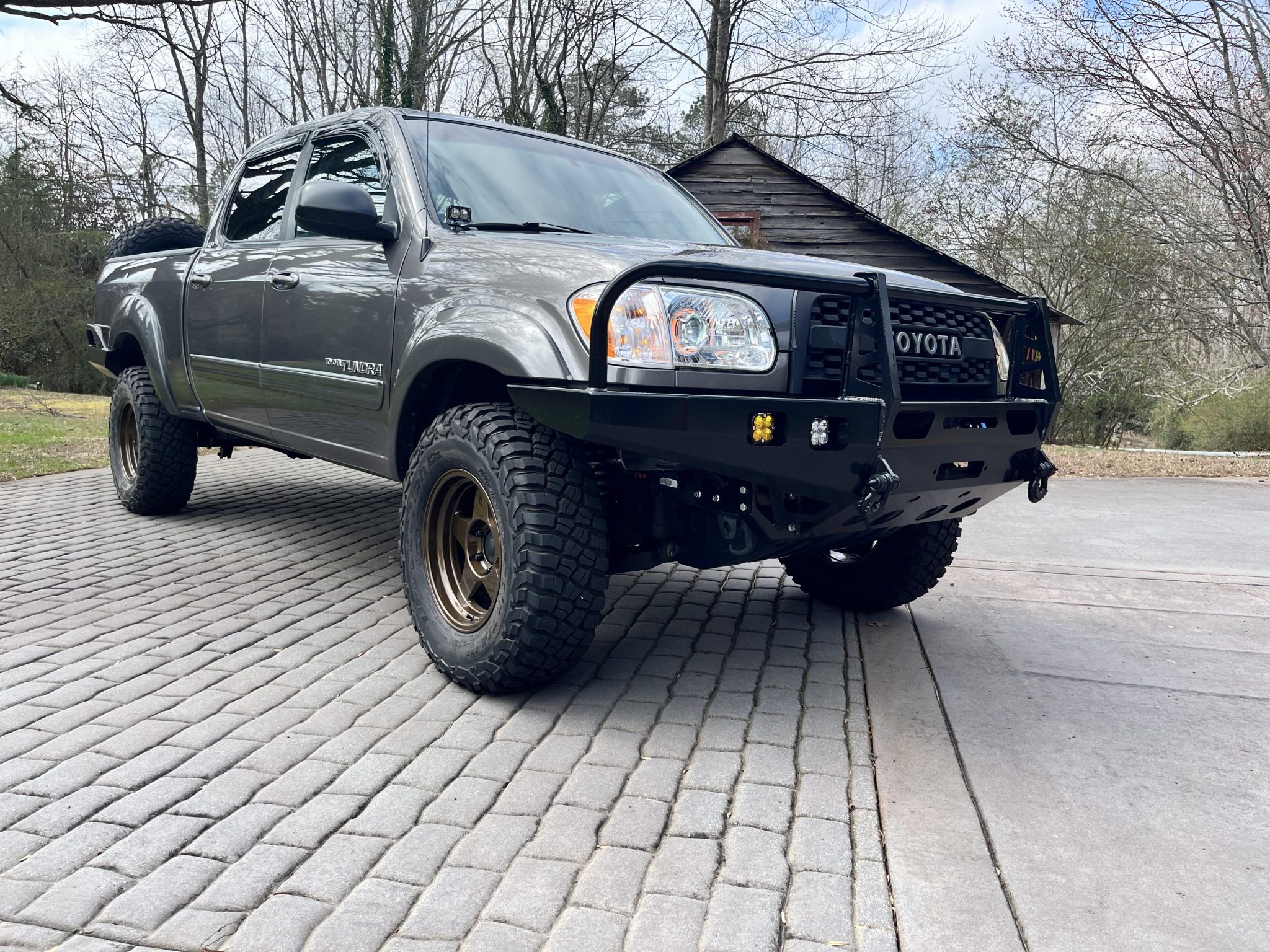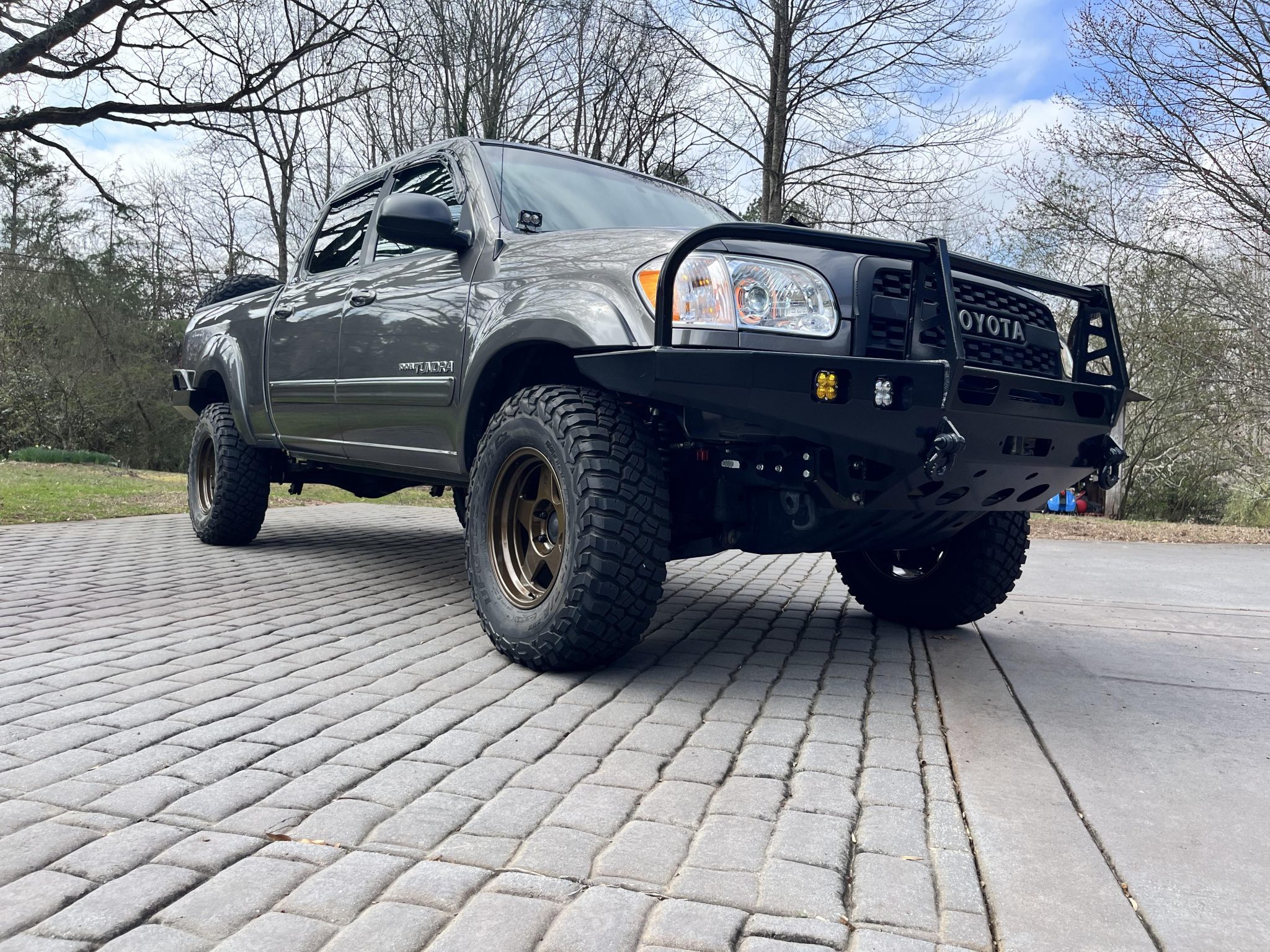 Bronze-finished 17″ SCS Gen5 alloy wheels are mounted with 285/75 BFGoodrich Mud-Terrain T/A KM3 tires. The suspension is modified with adjustable ADS front coilovers and rear shocks, JBA front upper control arms, Solo Motorsports front lower control arms, a Deaver rear leaf pack, an Archive Garage rear shock relocation kit and Hammer Hangers, and MAXXLinks sway bar end links. The braking system has been retrofitted with larger front disc brake components sourced from a 2010+ Lexus GX460 featuring custom-milled rotors, and the factory rear drums are retained. The steering rack and lower ball joints were replaced under current ownership.