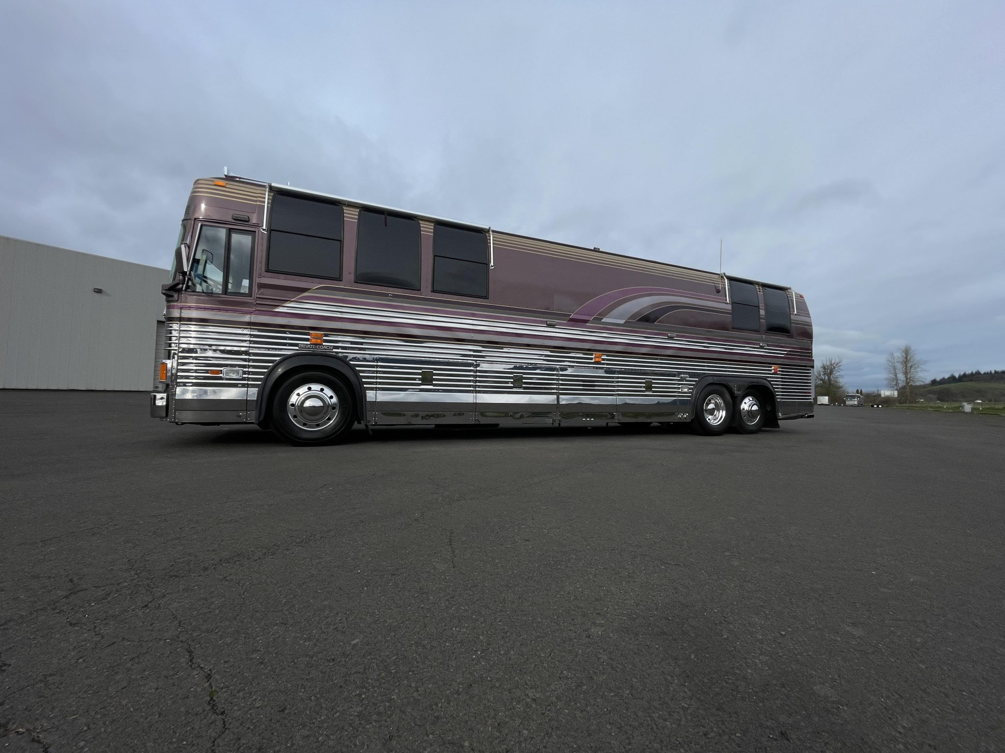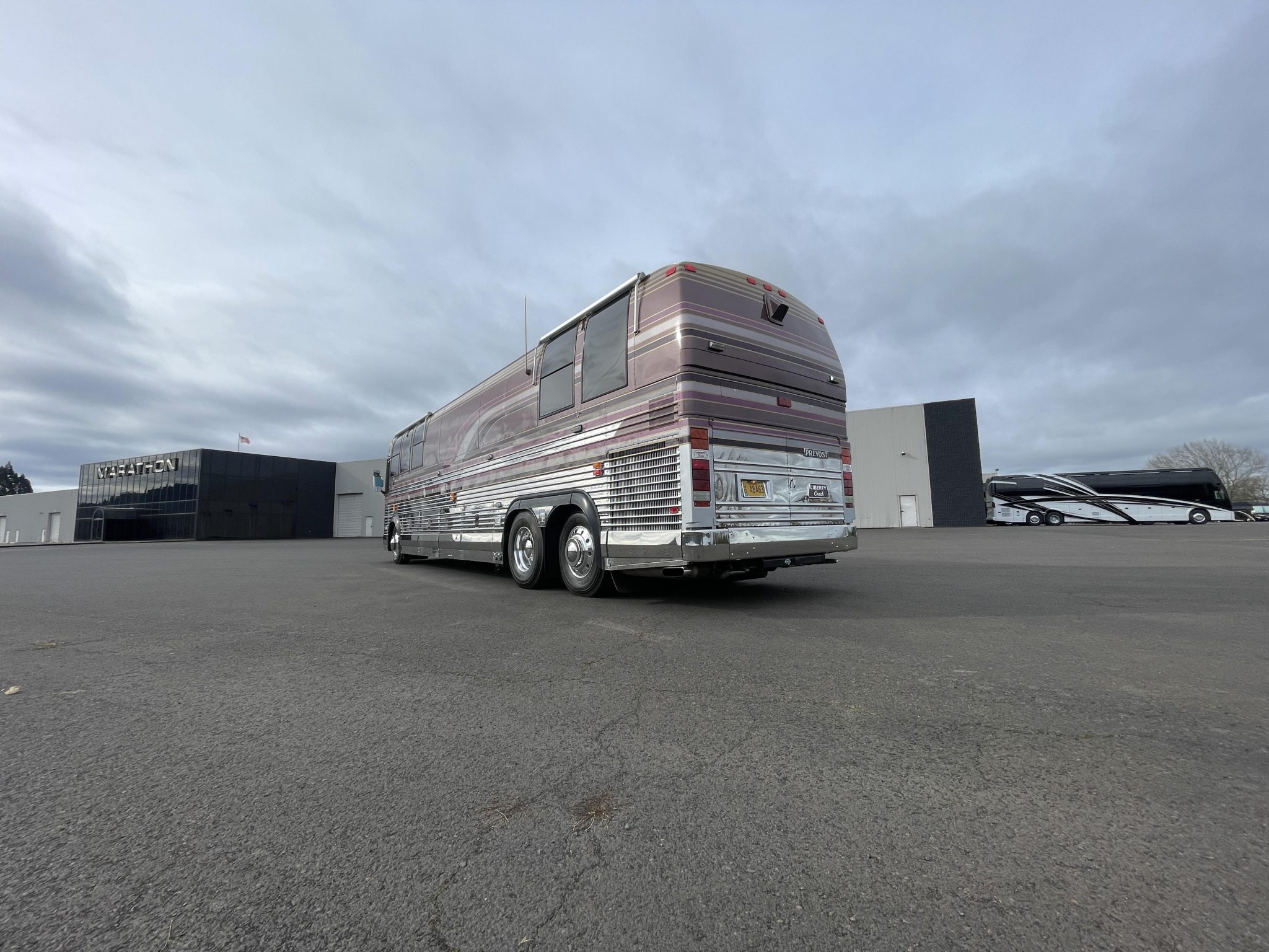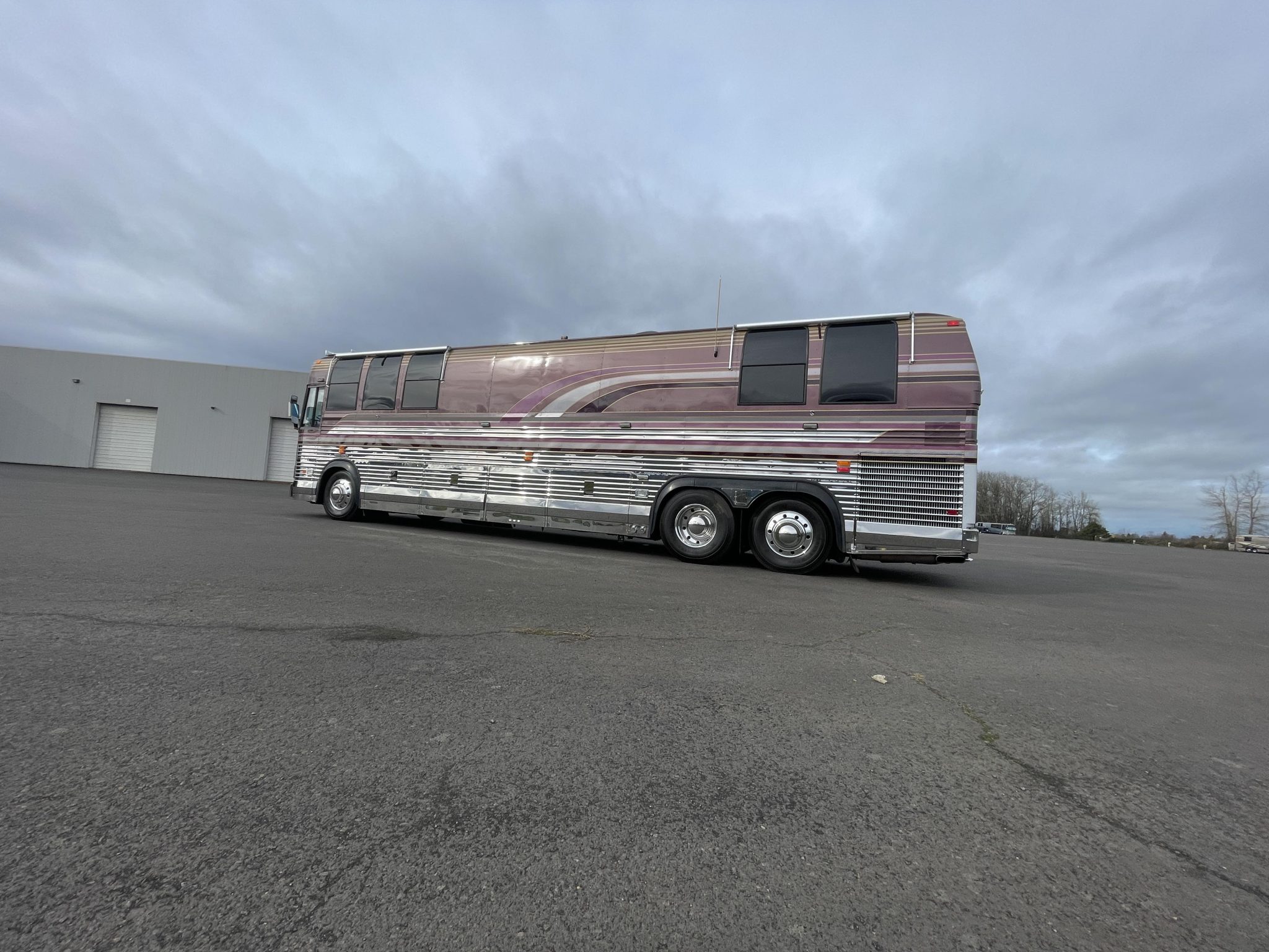 Polished 22.5″ alloy wheels wear 12R22.5 Michelin XZE tires, and stopping power is from air-actuated drum brakes. Infrastructure features include a Power Tech diesel-fueled generator, a Raritan marine water heater, freshwater and waste tanks, Pentair inline water filters, and shore connections for water, waste disposal, and electrical service. Work performed during the refurbishment included repairing electrical wiring, rerouting the freshwater fill line, and replacing the tank sensors and power inverters as well as the house, chassis, and generator batteries. The vehicle measures approximately 480″ long, 102″ wide, and 137″ tall and weighs around 25,000 pounds.