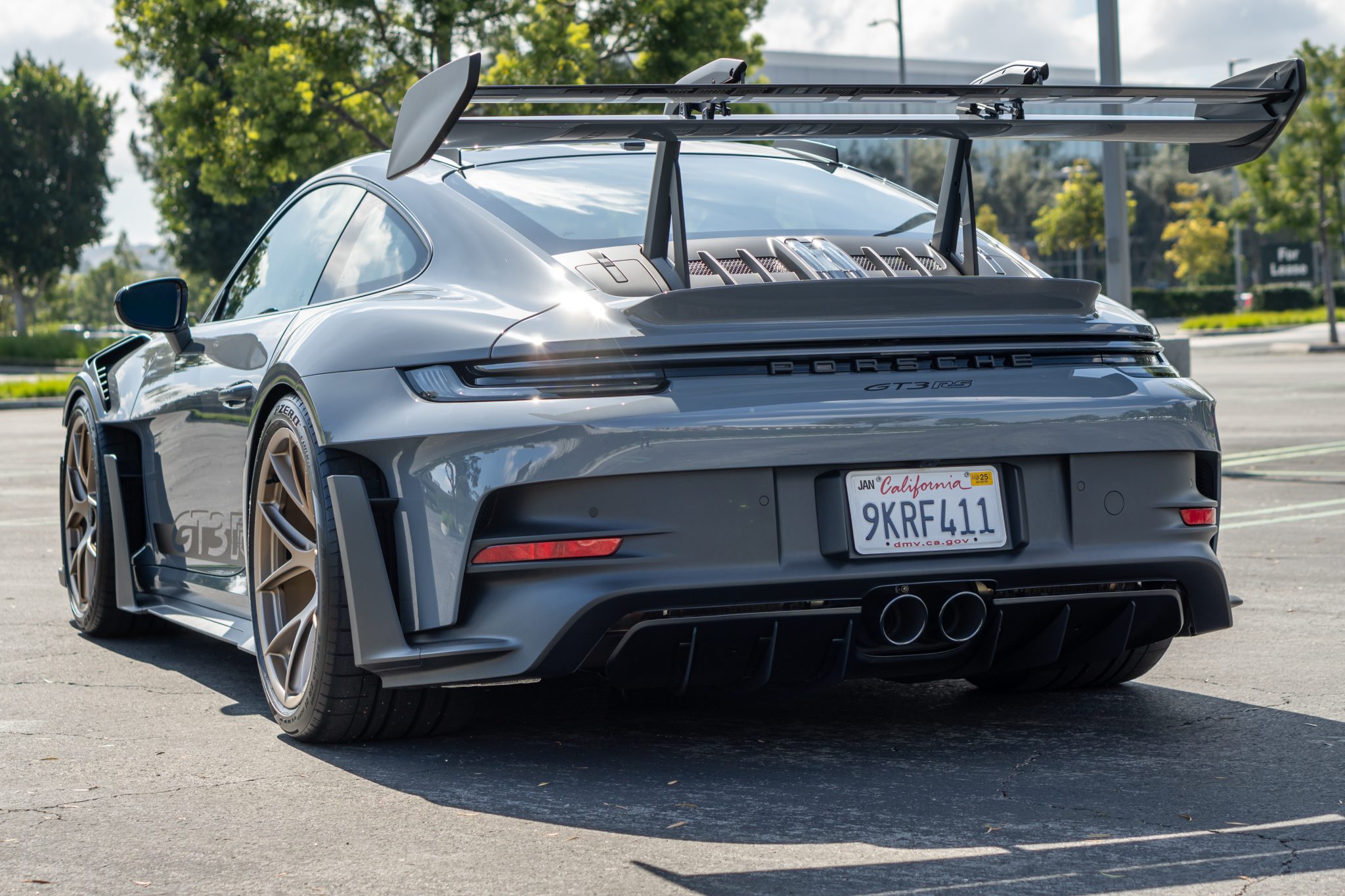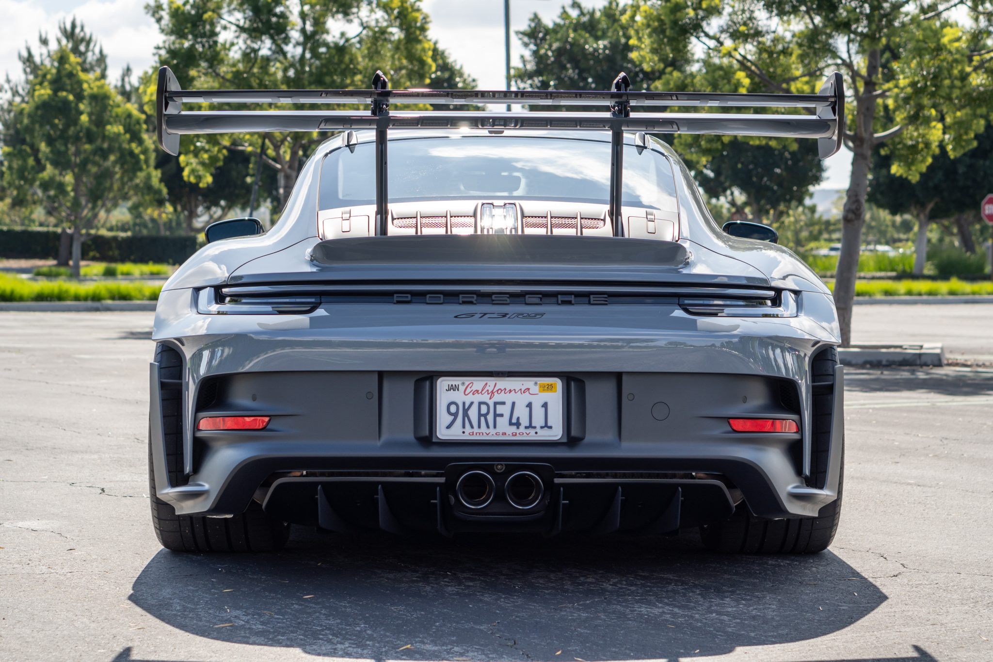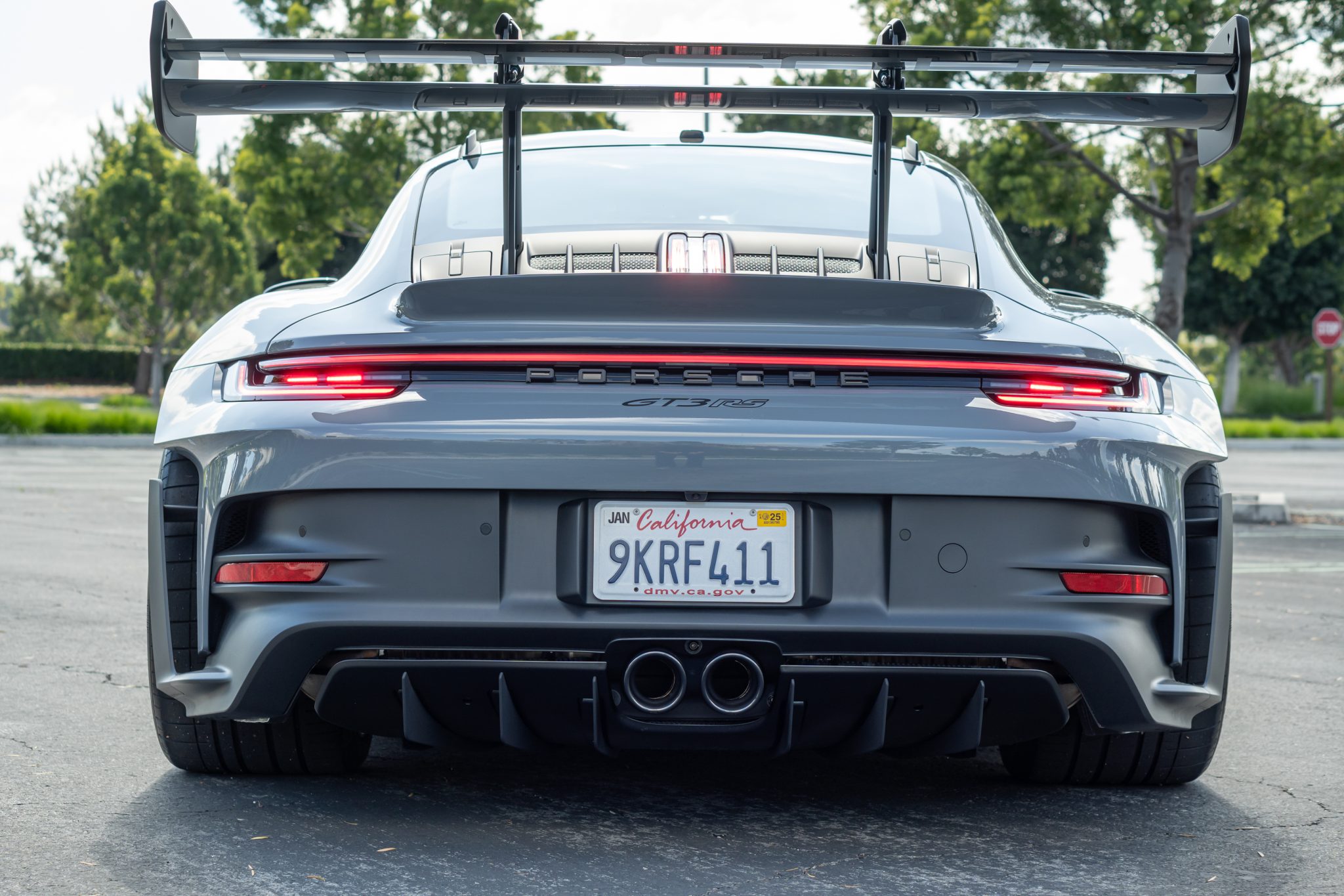 This example is finished in Arctic Gray (LM7K), and additional features include LED headlights, a rear fog light, GT3 RS decals, ParkAssist rear parking sensors, and dual center-exit exhaust outlets.