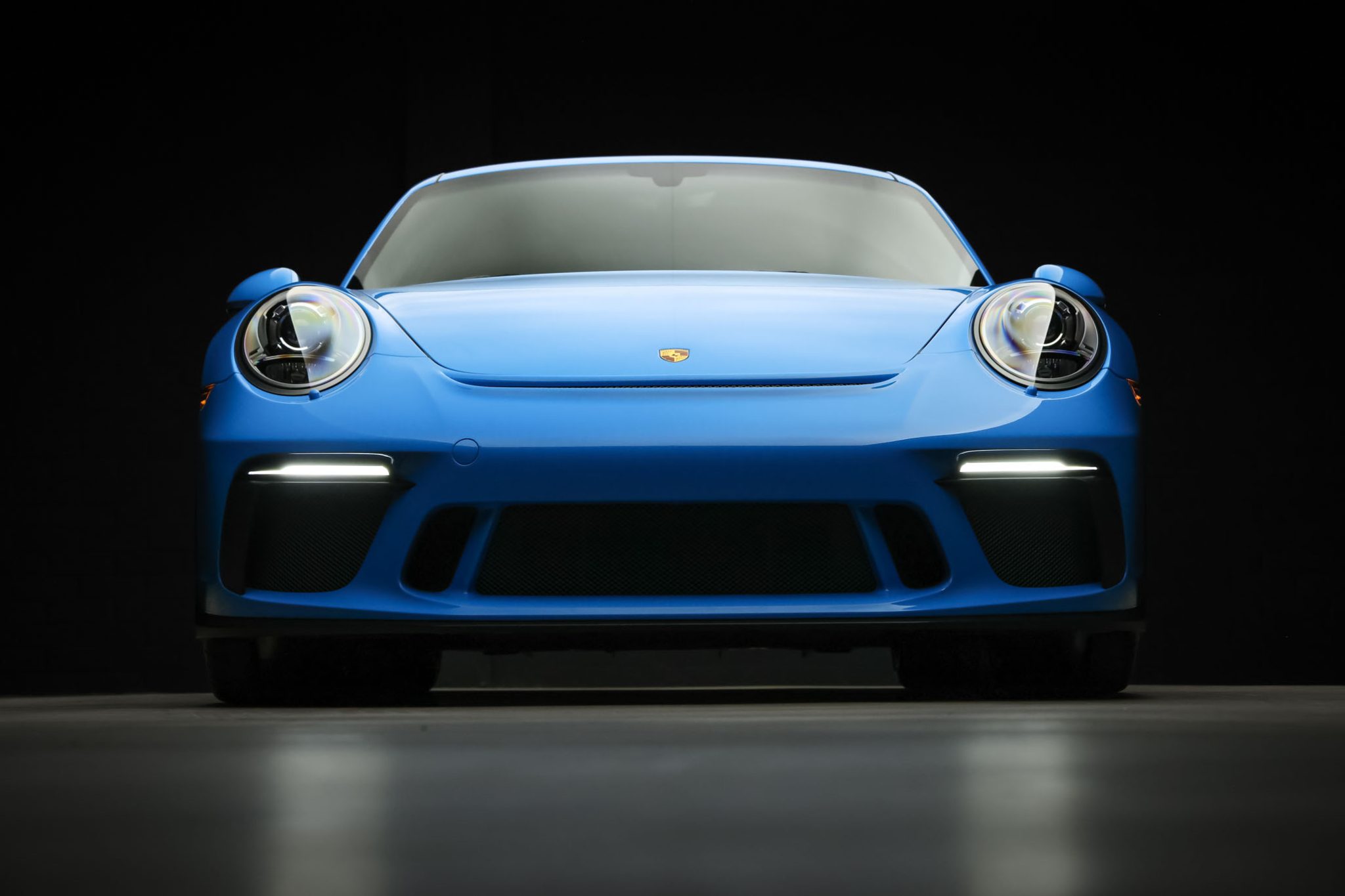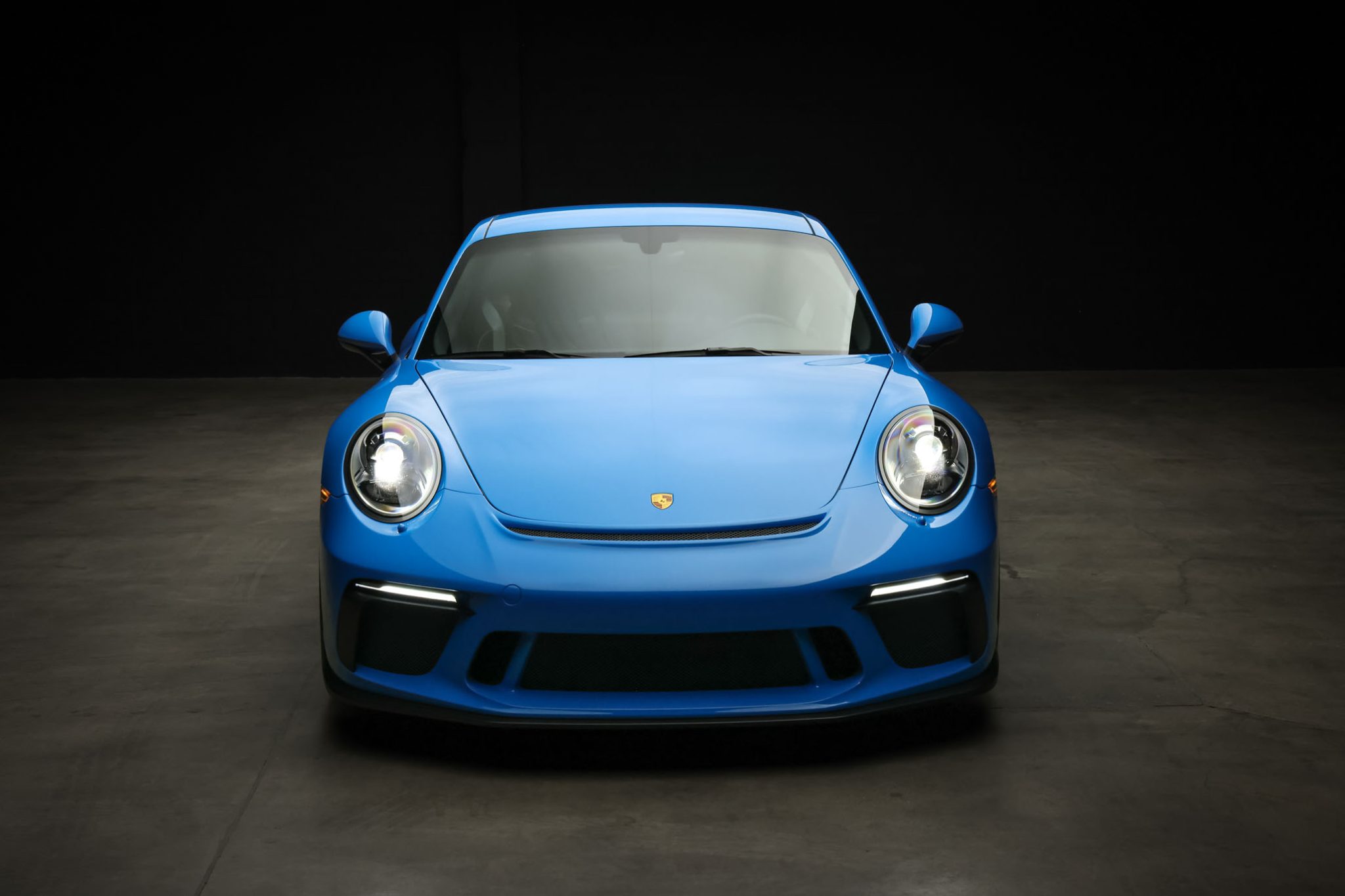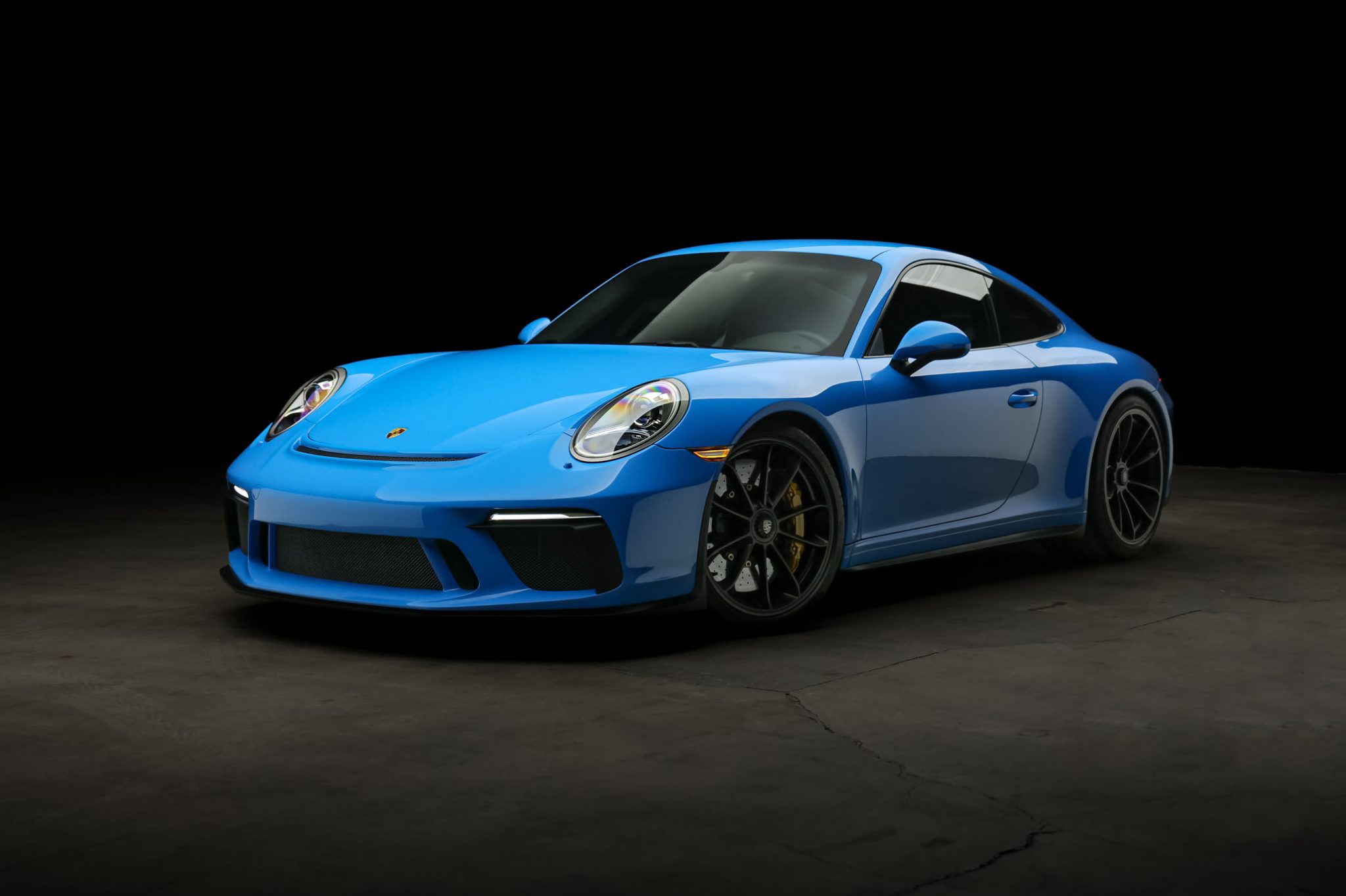 Black-finished 20″ center-lock alloy wheels are mounted with 245/35 front and 315/30 rear Michelin Pilot Sport Cup 2 tires. Braking is handled by yellow Porsche-branded calipers over cross-drilled carbon-ceramic rotors, and the car has a front-axle lift system.
