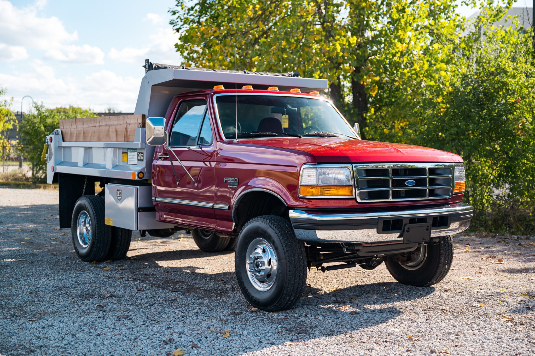 Polished 16″ Weld Racing wheels are mounted with 235/85 Firestone Transforce AT tires. Braking is handled by power-assisted front discs and rear drums, with the latter featuring ABS. The truck is equipped with a steering stabilizer, manually locking front hubs, and a dually rear axle.