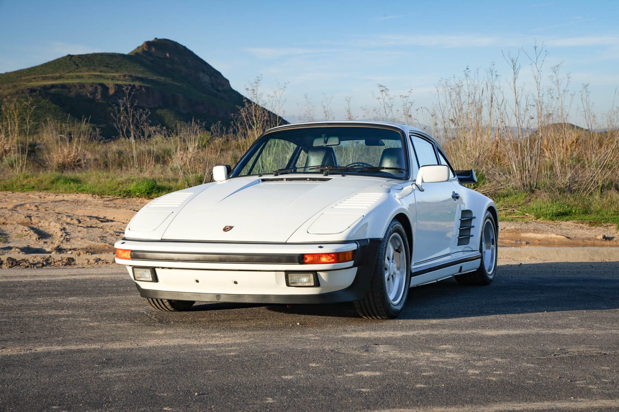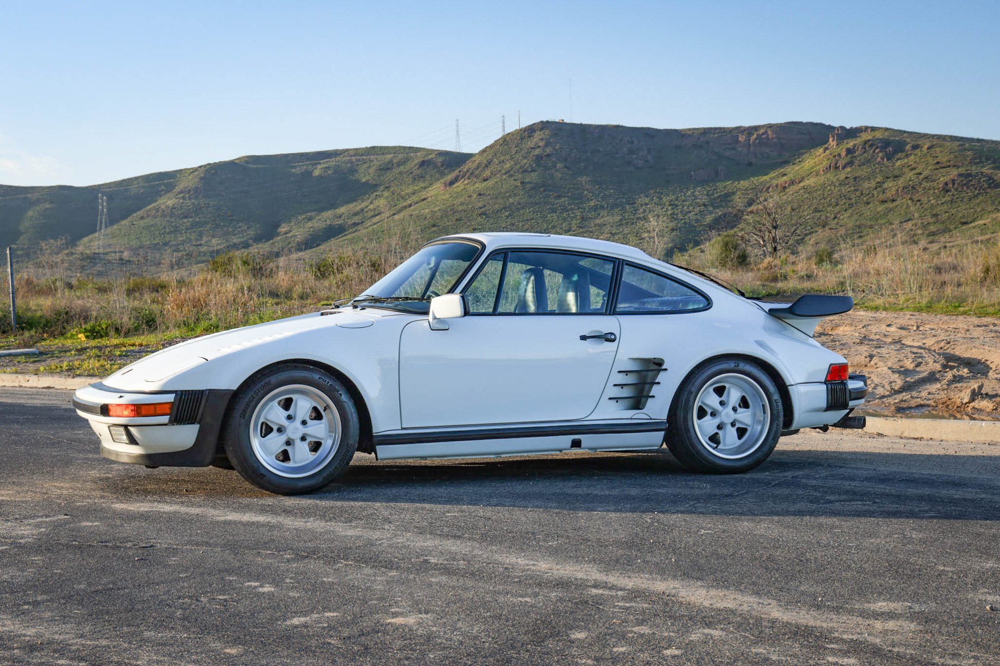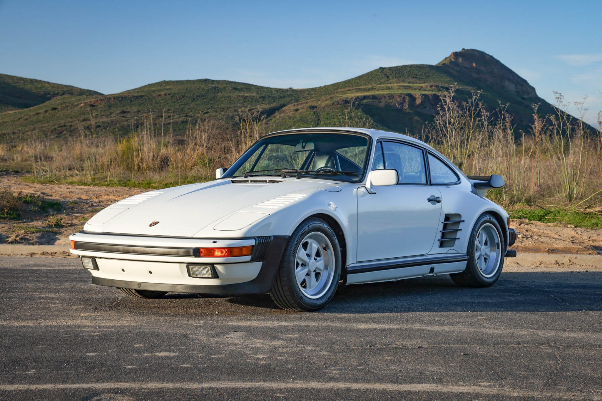 Fuchs 16″ wheels with body-color centers are mounted with 205/55 front and 245/45 rear Bridgestone Potenza Sport tires that were installed under current ownership. The four-wheel disc brakes feature Porsche-branded calipers and drilled rotors all around. There are curb marks on the right-rear wheel.