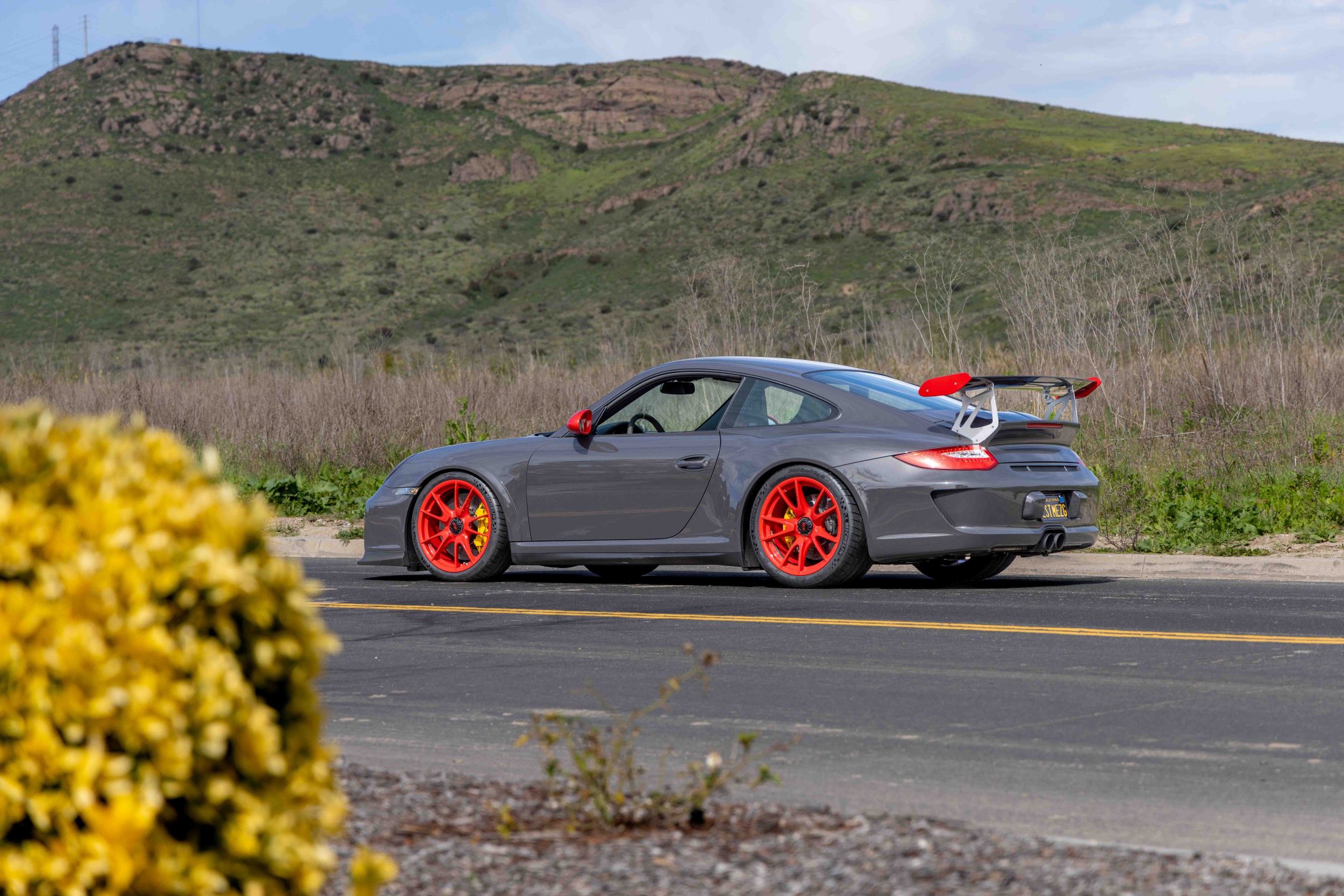 Red 19″ center-locking multi-spoke wheels wear 245/35 front and 325/30 rear Michelin Pilot Sport Cup 2 tires, three of which were mounted in 2023. The car was optioned with a front-axle-lift system and also features Porsche Active Suspension Management (PASM) with adjustable coilovers. Braking is handled by yellow Porsche-branded calipers over ceramic-composite rotors. The brake fluid was flushed and the rear brake ducts were replaced in December 2023.