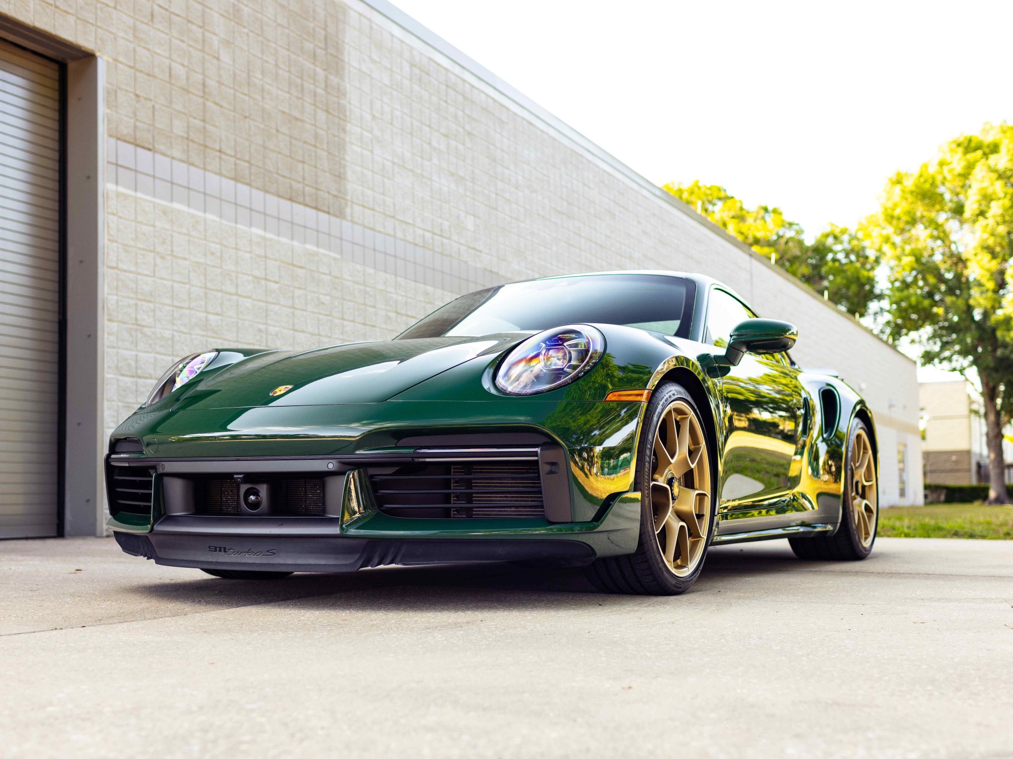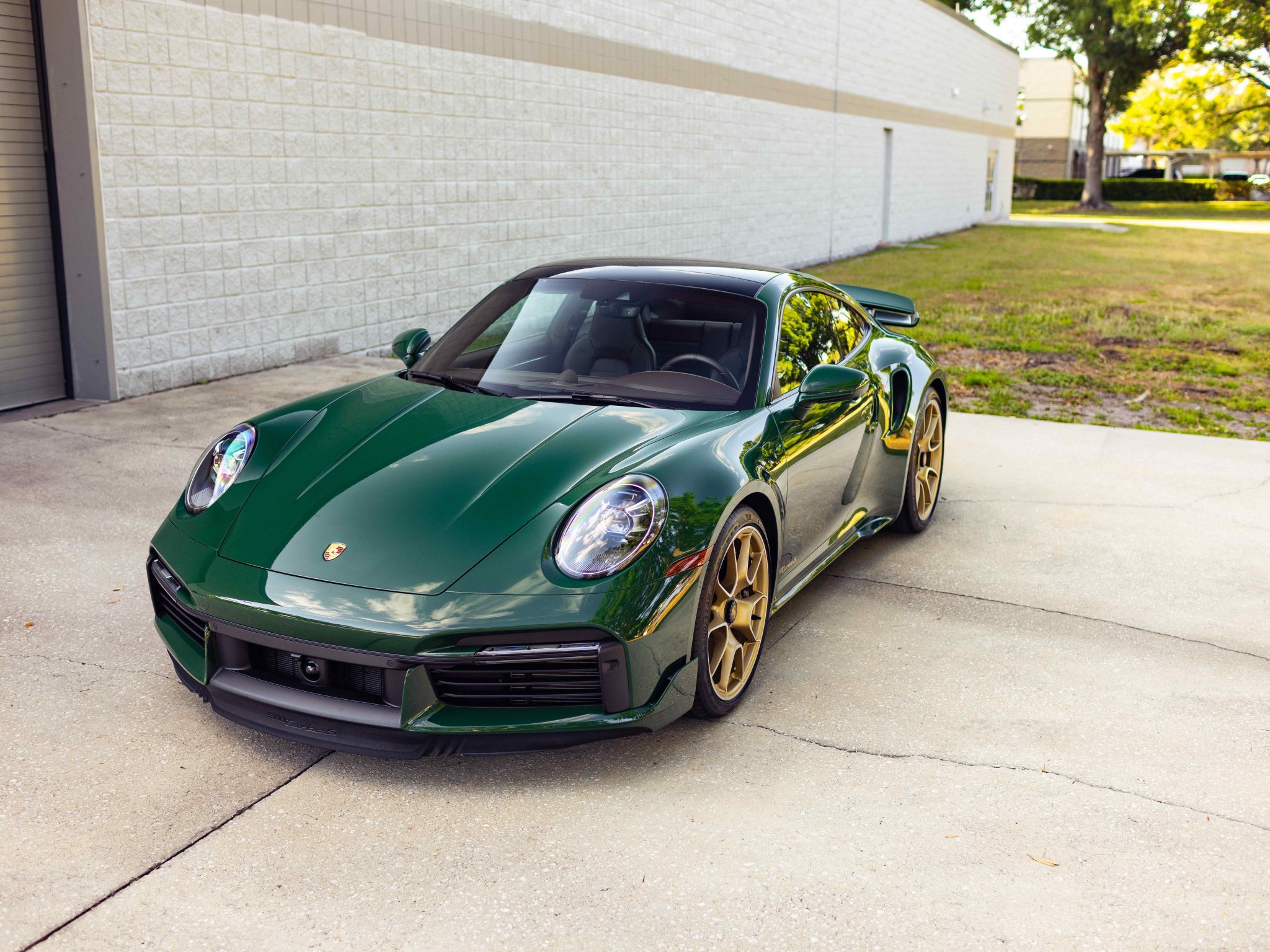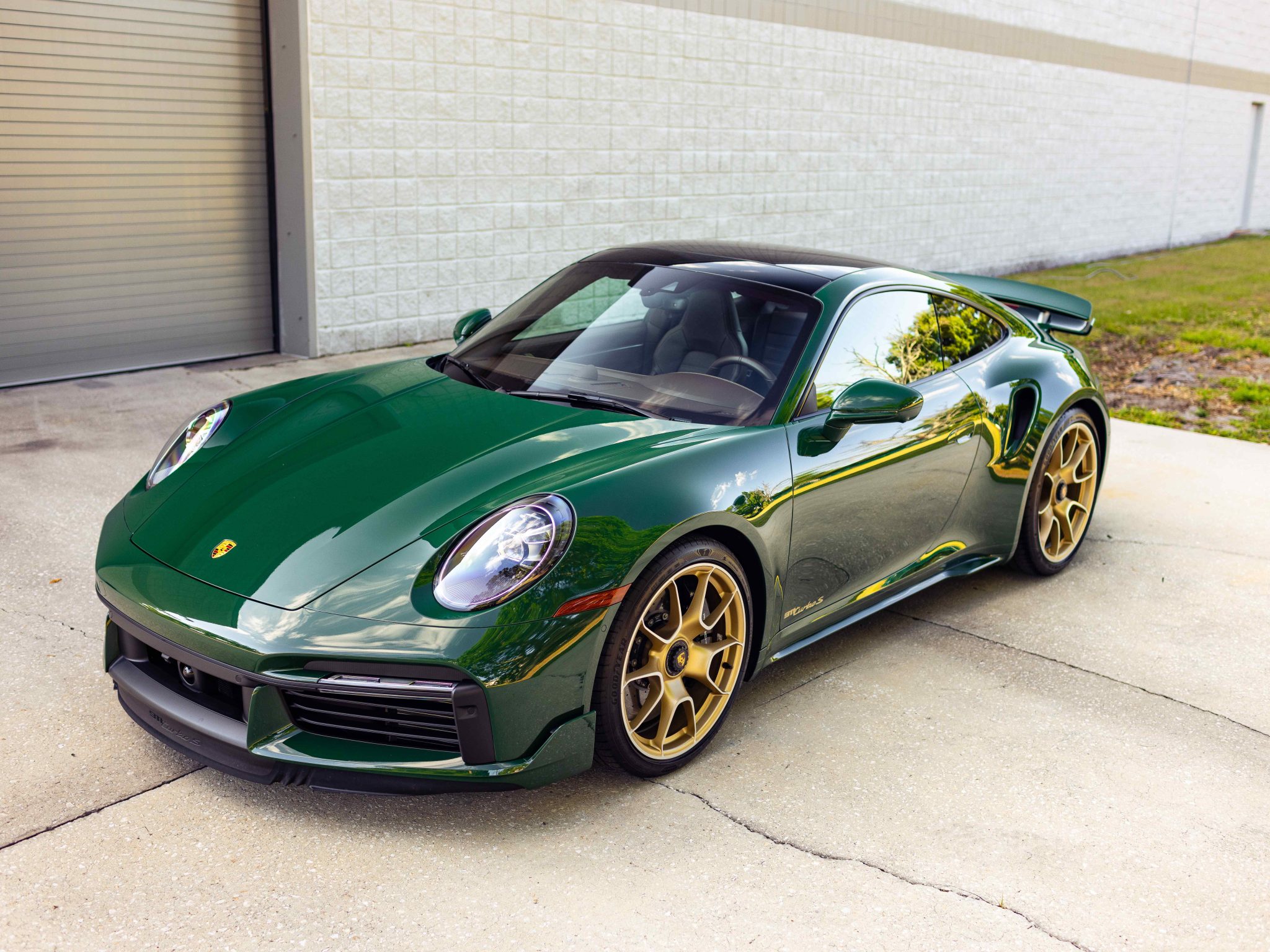 Satin Aurum-finished center-locking 20″ and 21″ Turbo S Exclusive Design alloy wheels are mounted with 255/35 front and 315/30 rear Goodyear Eagle F1 tires. Stopping power is provided by Porsche Ceramic Composite Brakes (PCCB) with black-finished multi-piston calipers. The car is equipped with a front-axle lift system, Power Steering Plus, Porsche Active Suspension Management, and rear-axle steering. A brake fluid flush was performed in February 2024.