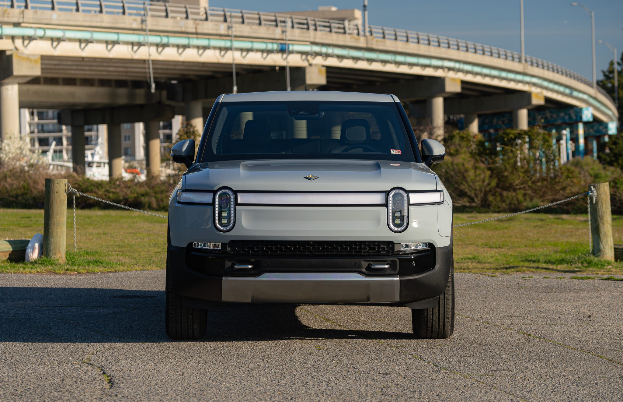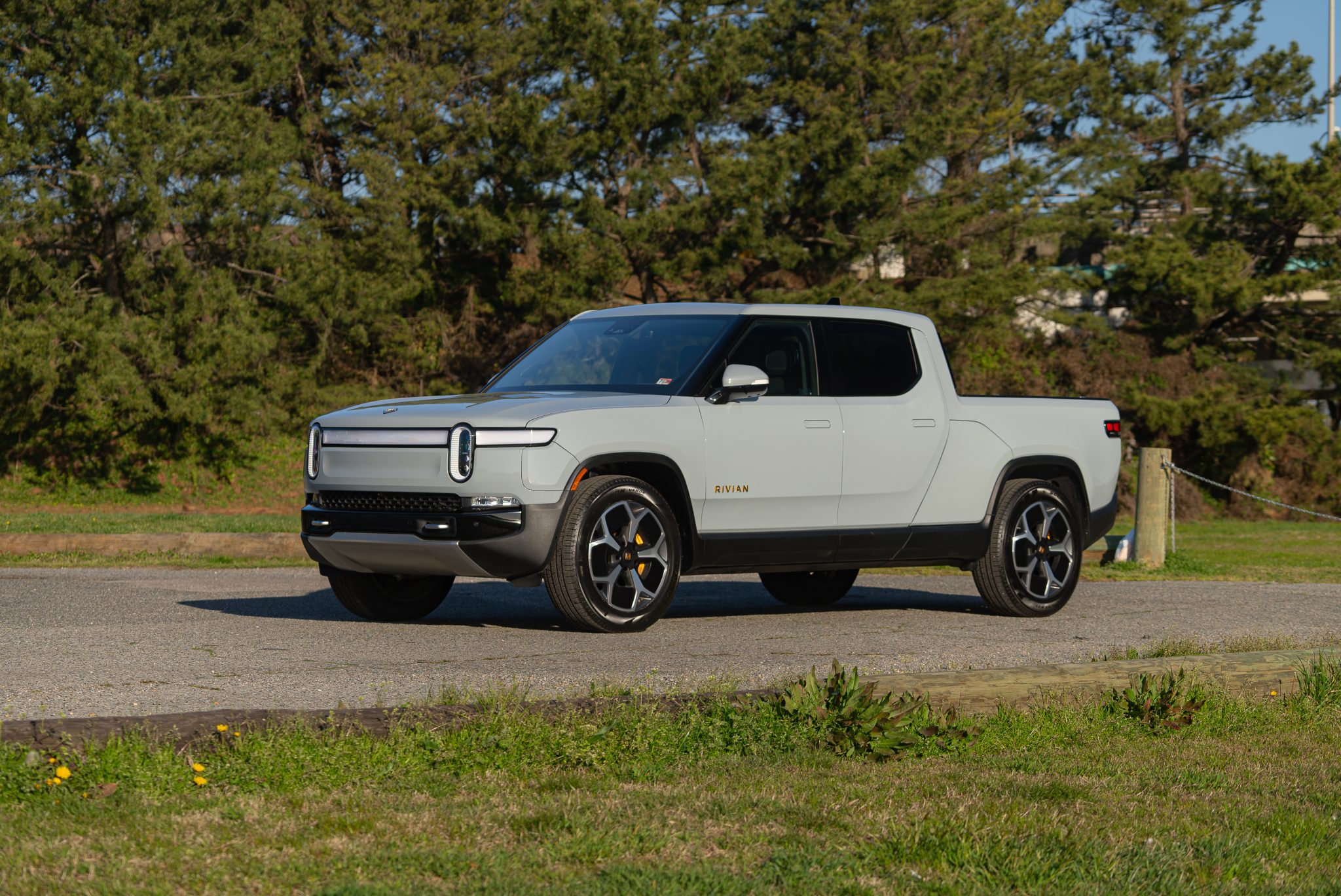 Road 21″ wheels are mounted with 275/55 Pirelli Scorpion Verde All Season tires, and a 22″ spare is stowed below the cargo floor. Stopping power is provided by disc brakes featuring yellow calipers at all four corners. The truck is equipped with regenerative braking as well as Dynamic Brake Support, air suspension, and kinetic roll control.