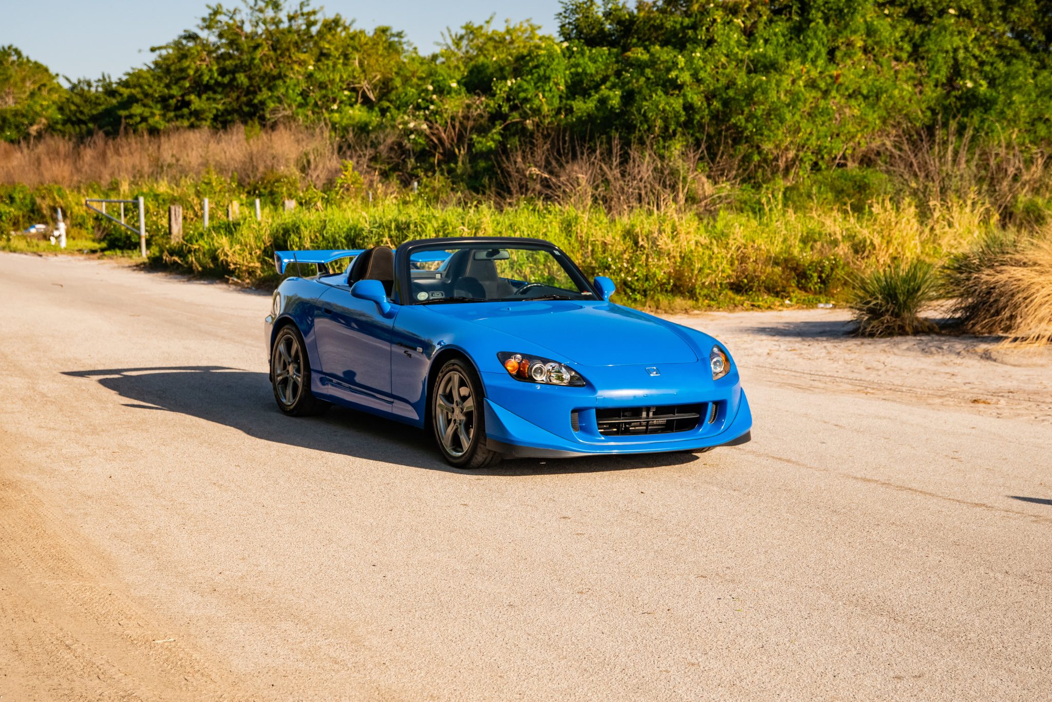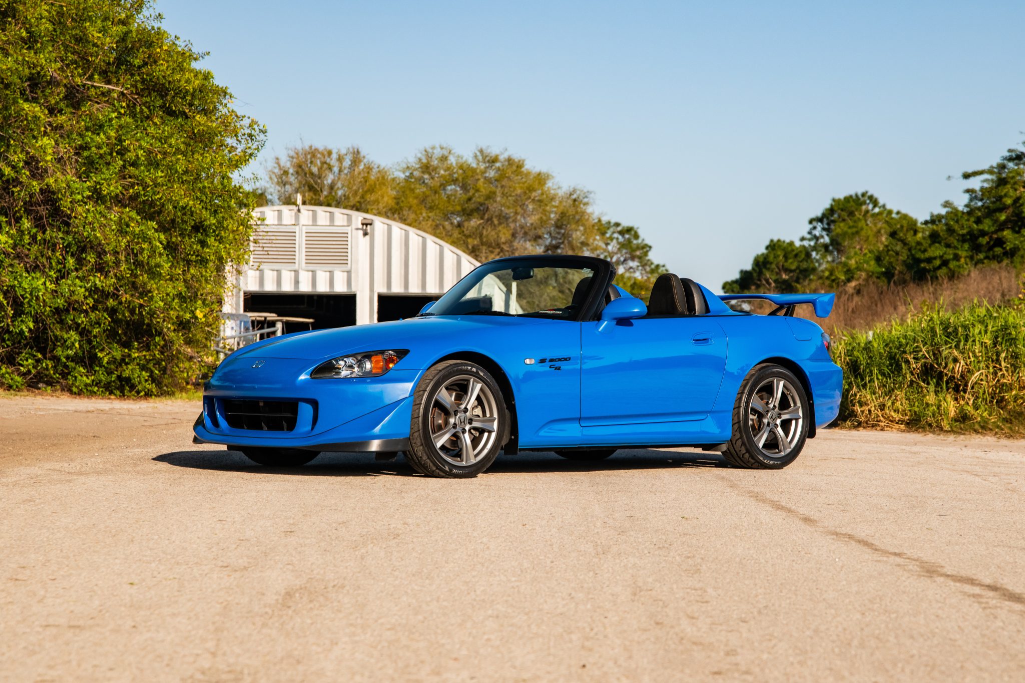 Factory 17″ five-spoke alloy wheels are mounted with Bridgestone Potenza Re-71R tires. The CR model features higher-rate springs, stiffer anti-roll bars, and a quicker steering ratio compared to the standard AP2 S2000.