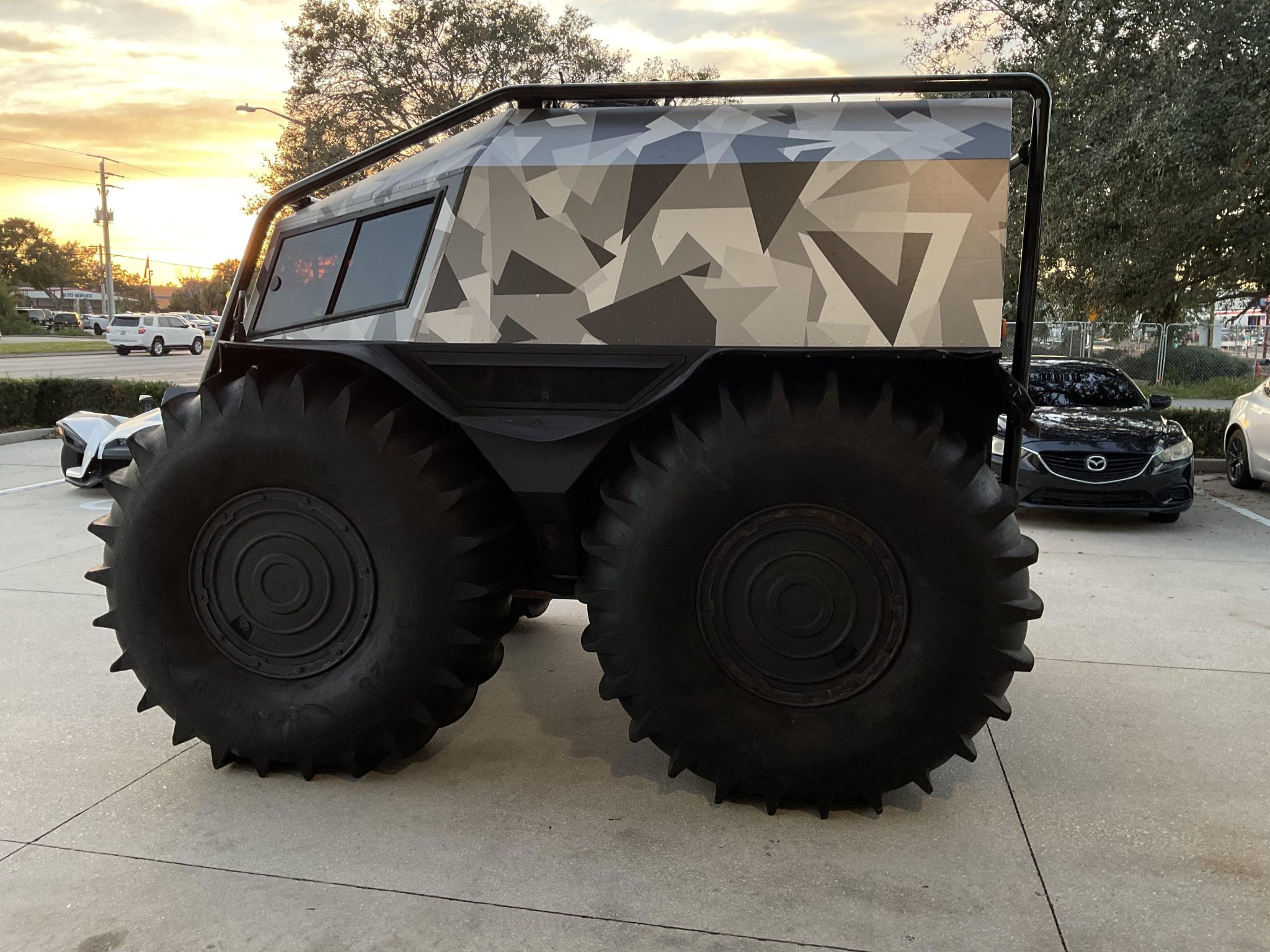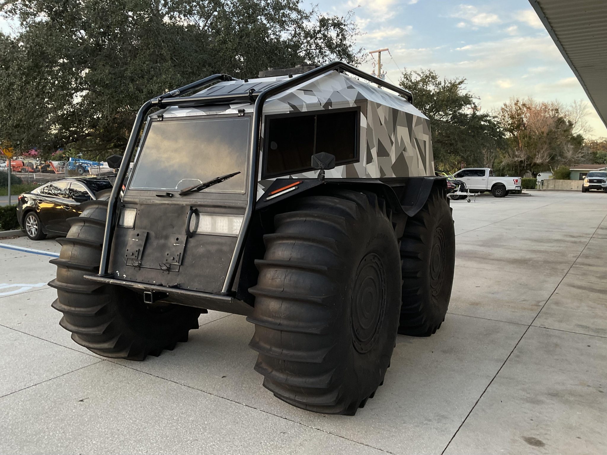 Black-finished 25″ wheels are wrapped in 1600×600-25 WEPN low-pressure tires that feature paddle treads and provide buoyancy and propulsion on water. The setup provides 23″ of ground clearance with the ability to climb or descend a 35-degree grade. Top speed on land is factory rated at 25 mph, while maximum speed on water is 3.7 mph. The vehicle is equipped with a central tire inflation system as well as 15-gallon auxiliary fuel containers located in the center of each wheel. Service in 2023 is said to have involved overhauling the steering assemblies.
