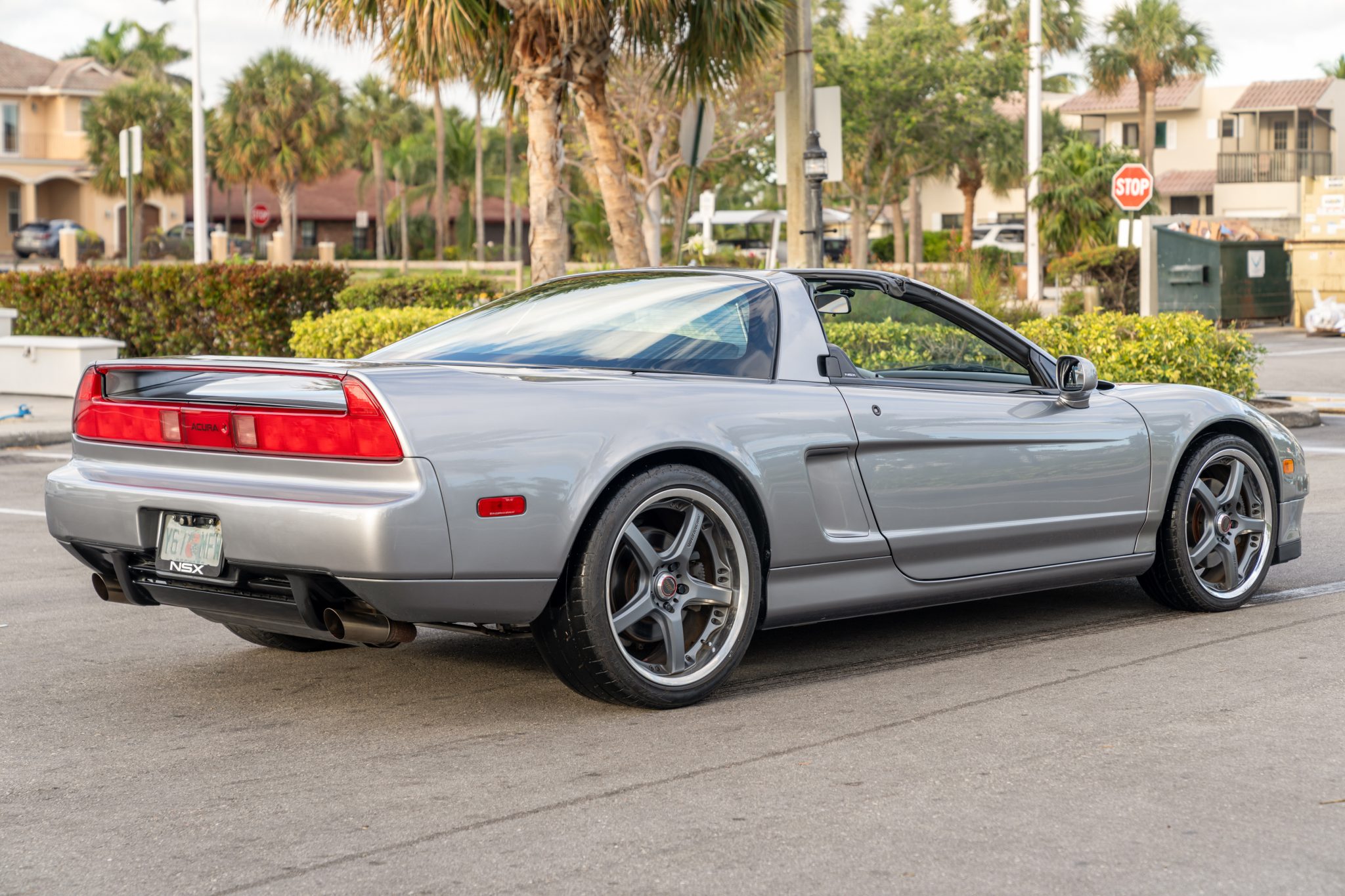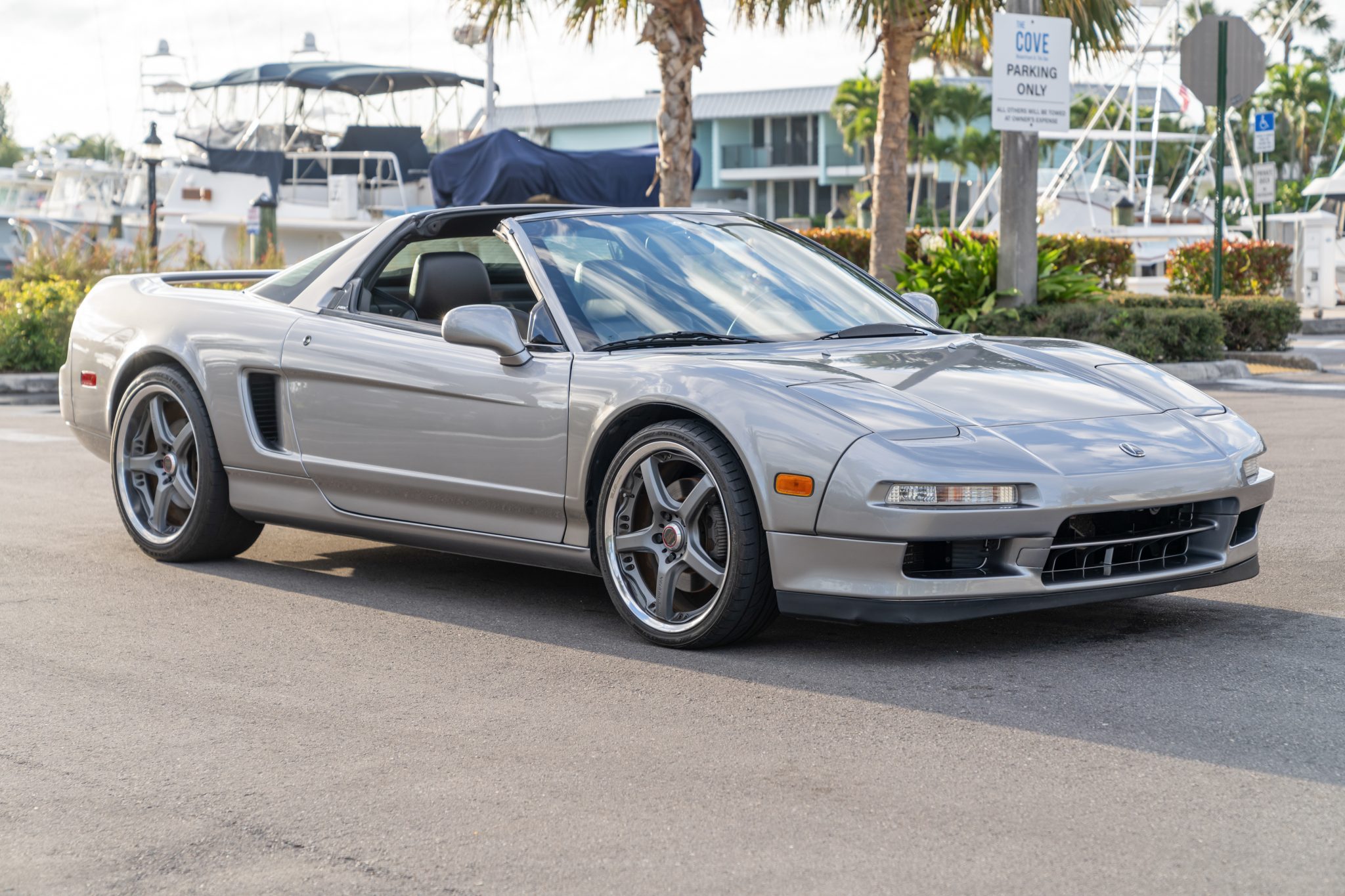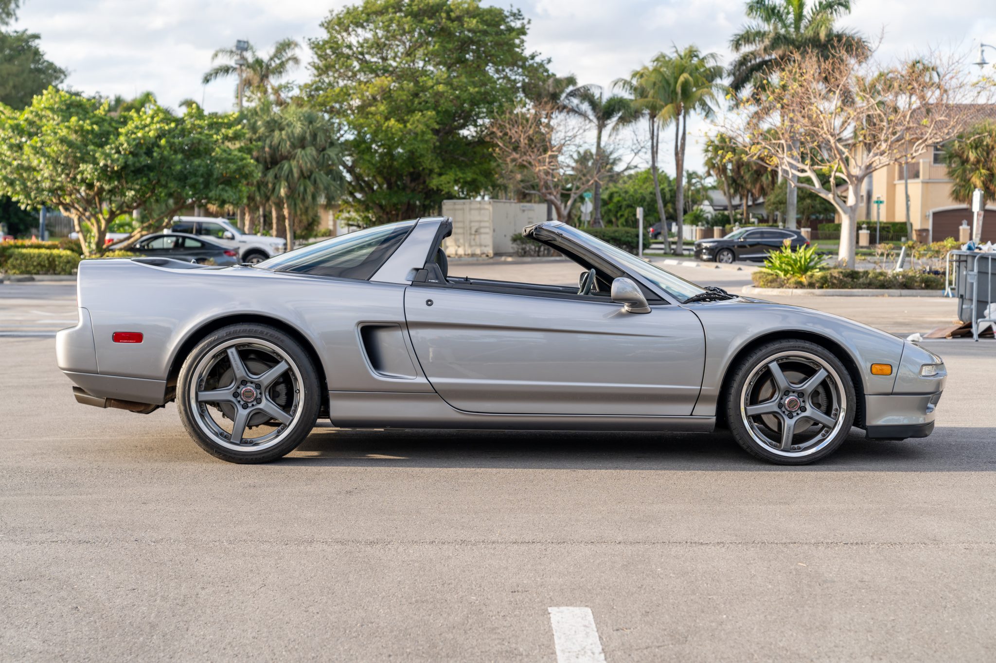 The multi-piece 18″ and 19″ Volk Racing wheels are mounted with 215/35 front and 275/35 rear Bridgestone Potenza tires showing 2012 date codes. The car features a four-wheel double-wishbone suspension with front and rear stabilizer bars, and braking is handled by NSX-branded calipers over vented rotors at each corner. The front rotors and brake pads were replaced in 2018. The tires require replacement, per the seller.